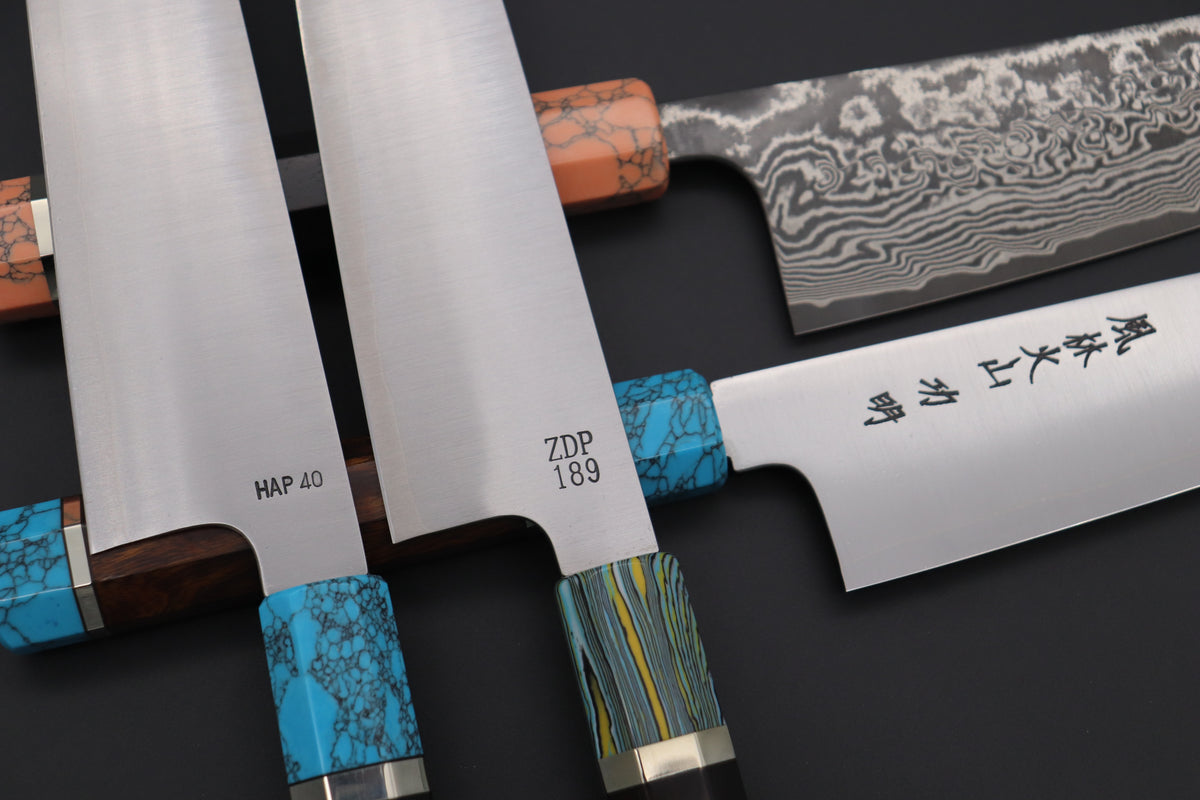 Due to the forge smith’s extensive experience in hammer forging and traditional handcrafting processes, their special effort, their continuous research,craftsman’s dedication and hard work, we can now offer the high-end traditional forged knives and also the premium Japanese Steel knives such as ZDP-189, HAP-40, R-2 and Aogami Super. Fu-Rin-Ka-Zan brand Traditional Forged Knives are some of the finest high-end Japanese Knives currently available.