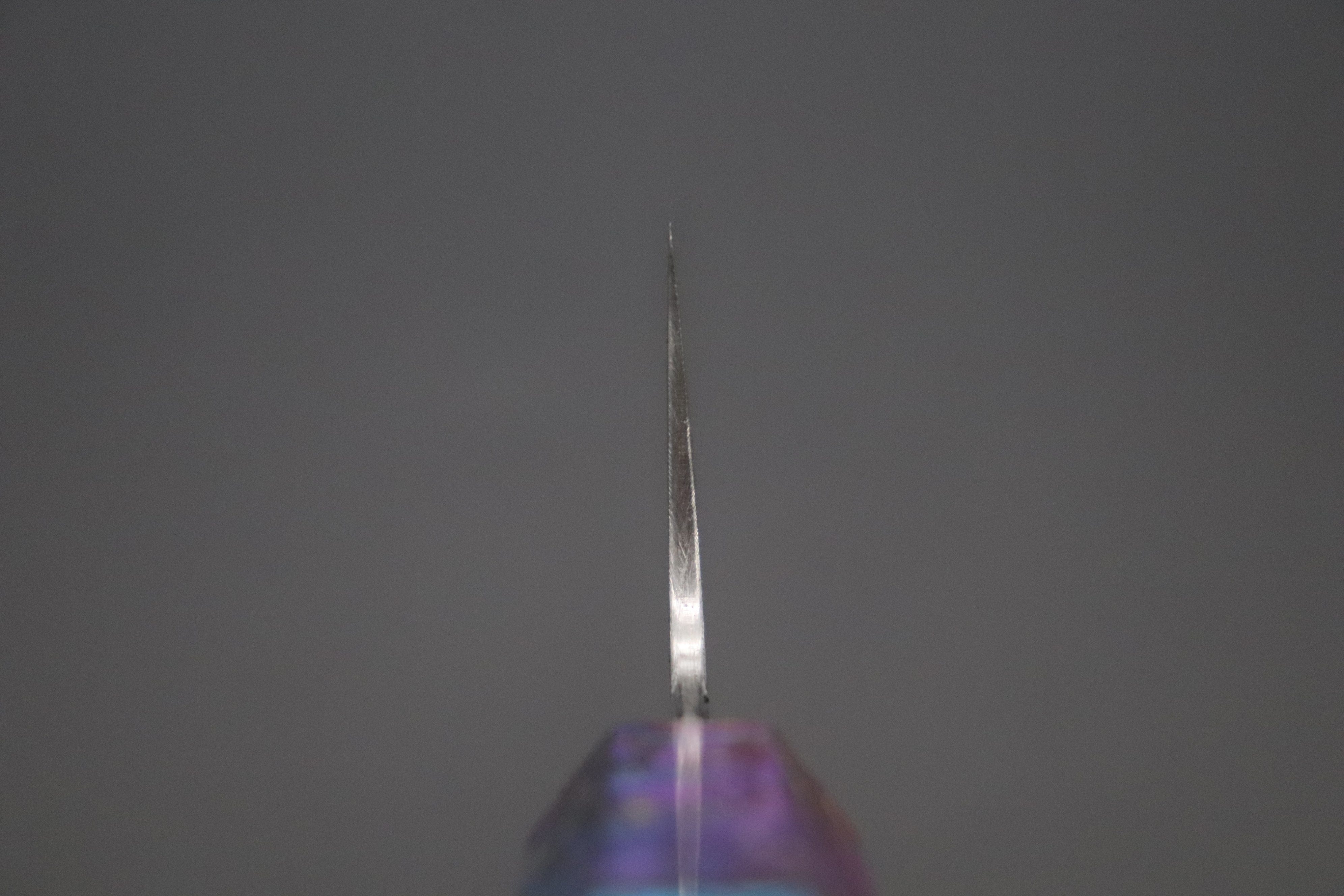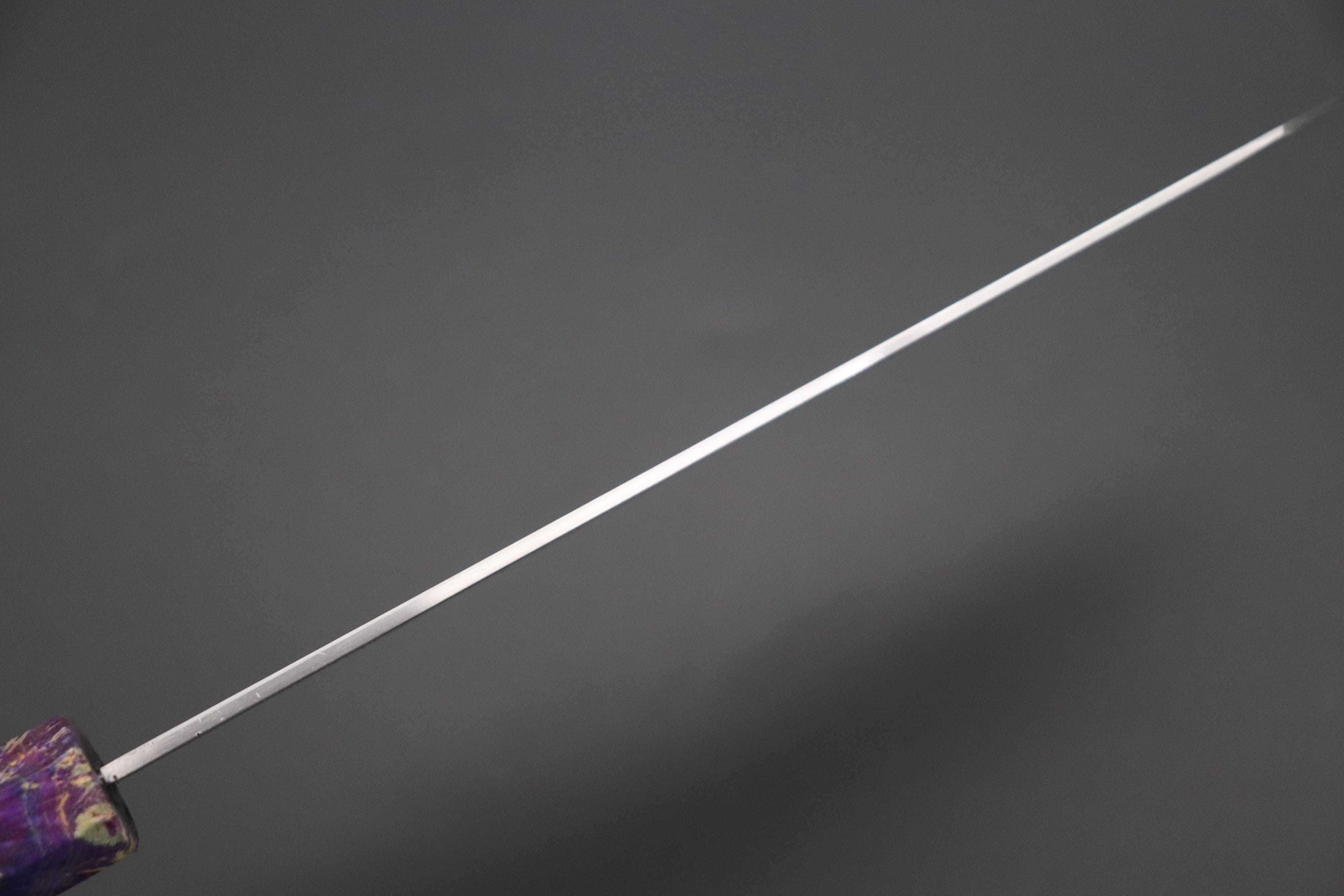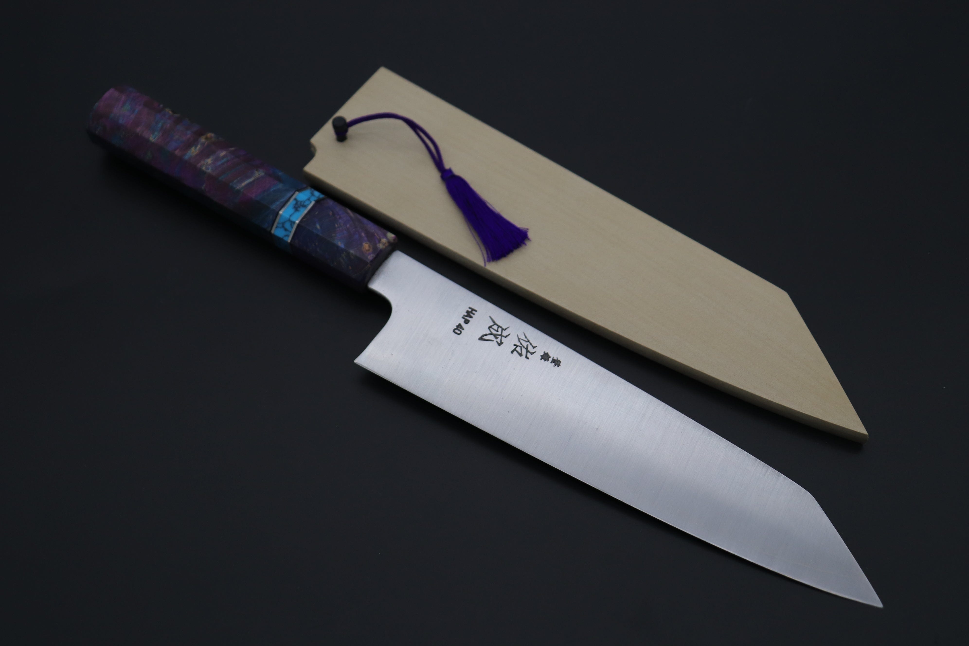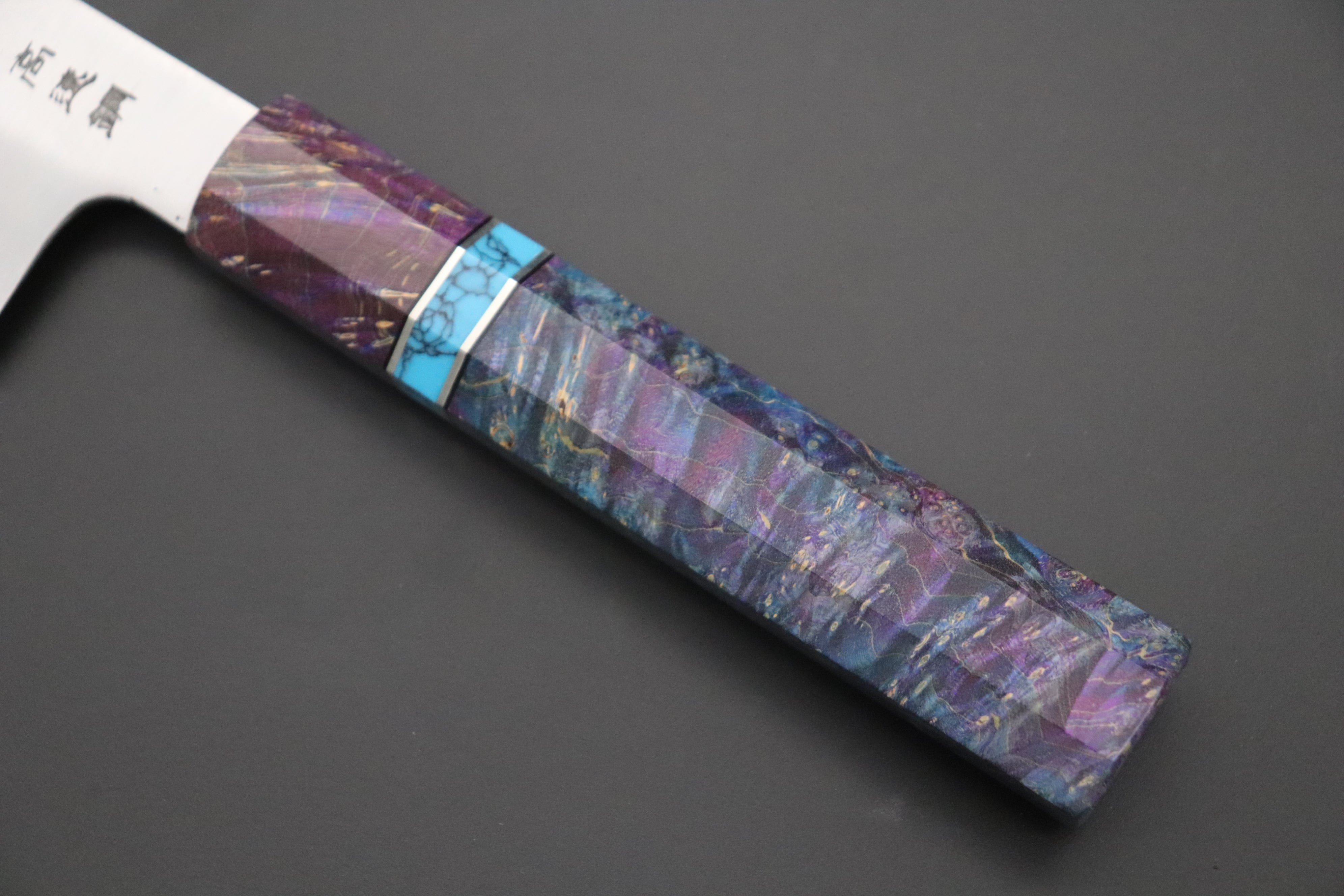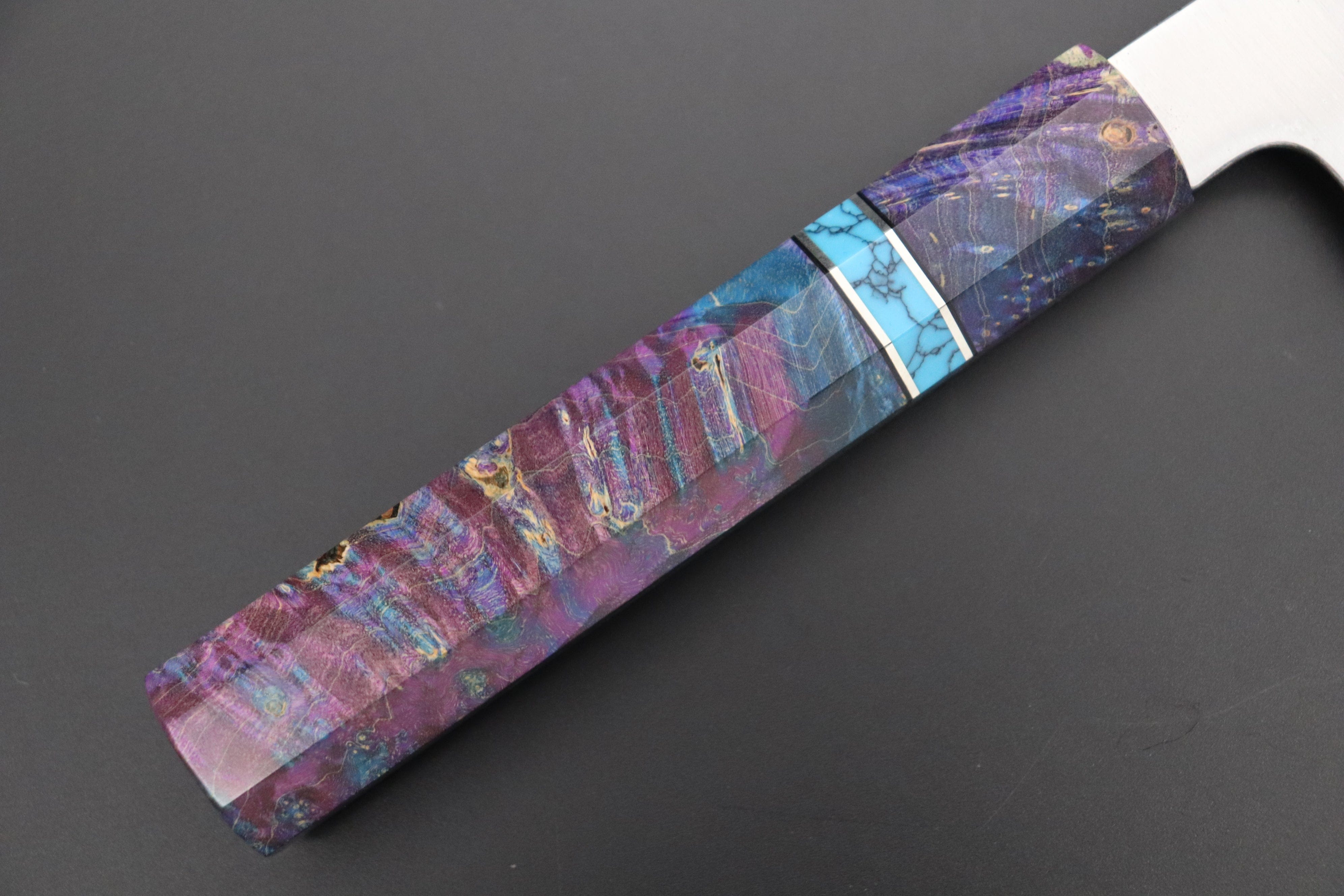 This Custom Limited Edition Sukenari HAP-40 Clad Kiritsuke knife is fitted with a Innovative Sunset Purple Color Octagonal Stabilized Maple Wood Handle with Composite Turquoise Gemstone Ring and Nickel Silver Spacers. A matching Magnolia wood Saya (Sheath) with a black pakkawood Saya pin is also included with the knife.