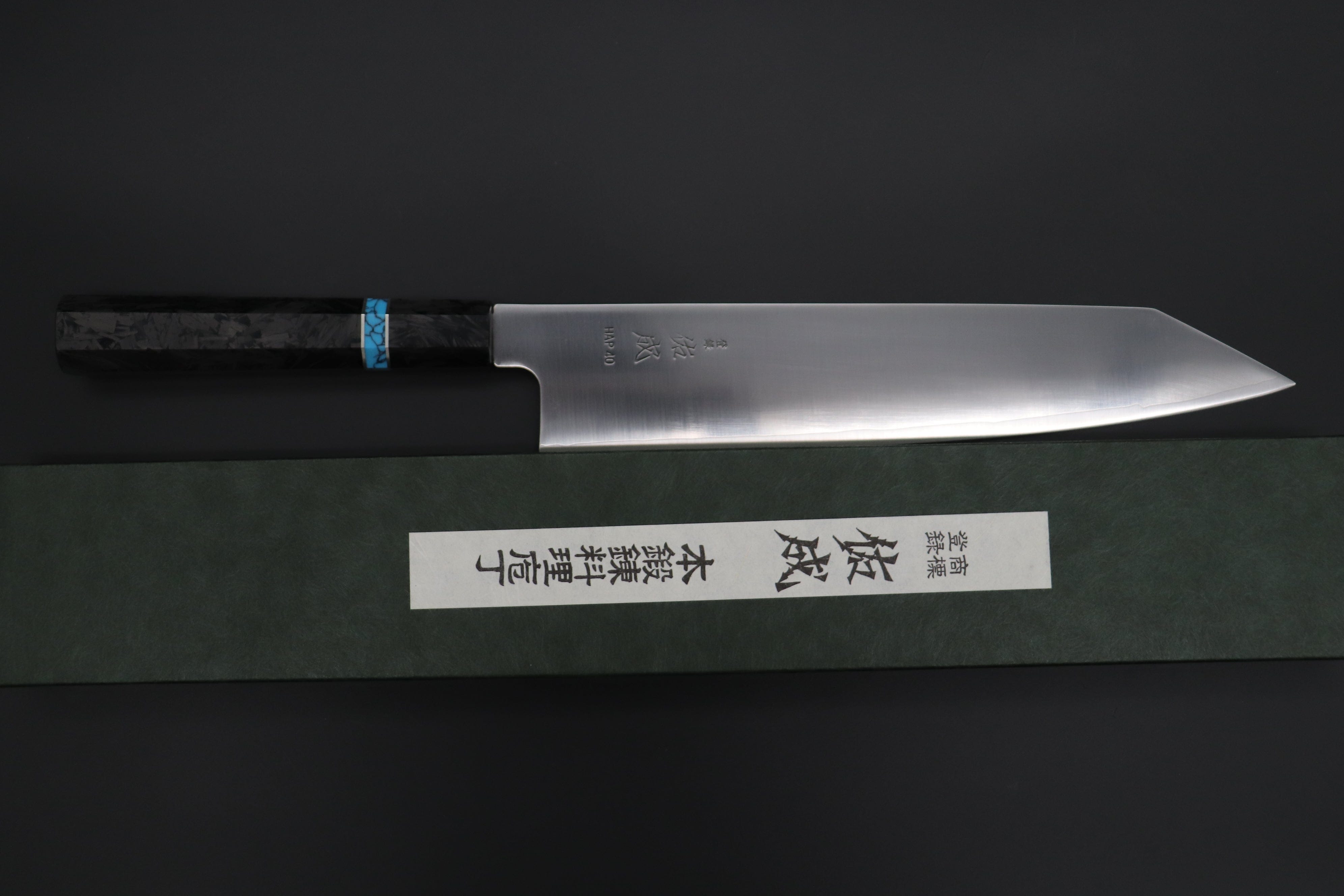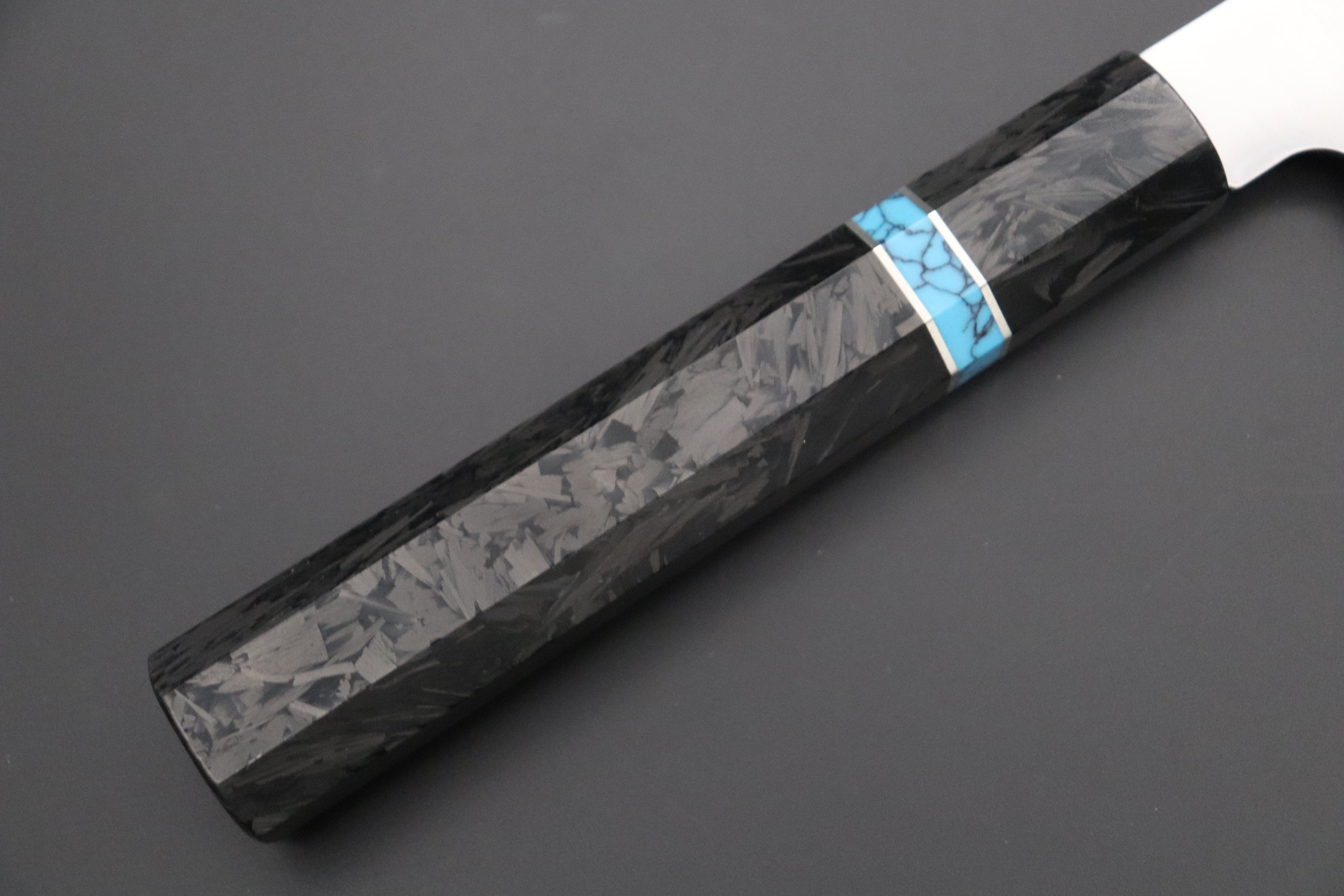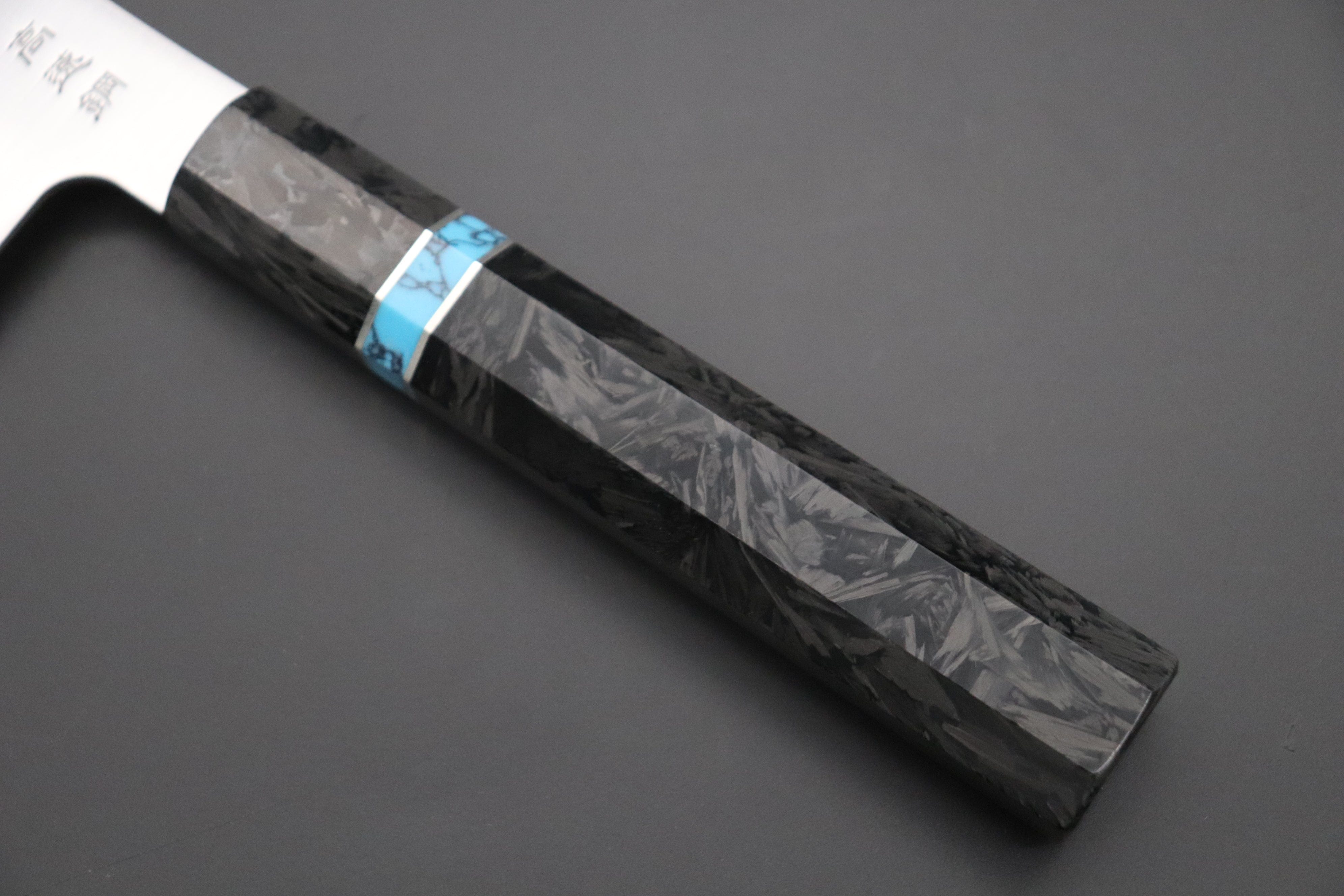 This Custom Limited Edition Sukenari HAP-40 Clad Kiritsuke knife is fitted with a Innovative Octagonal Carbon Fiber Handle with Composite Blue Turquoise Gemstone Ring and Nickel Silver Spacers. A matching Magnolia wood Saya (Sheath) with a black pakkawood Saya pin is also included with the knife.