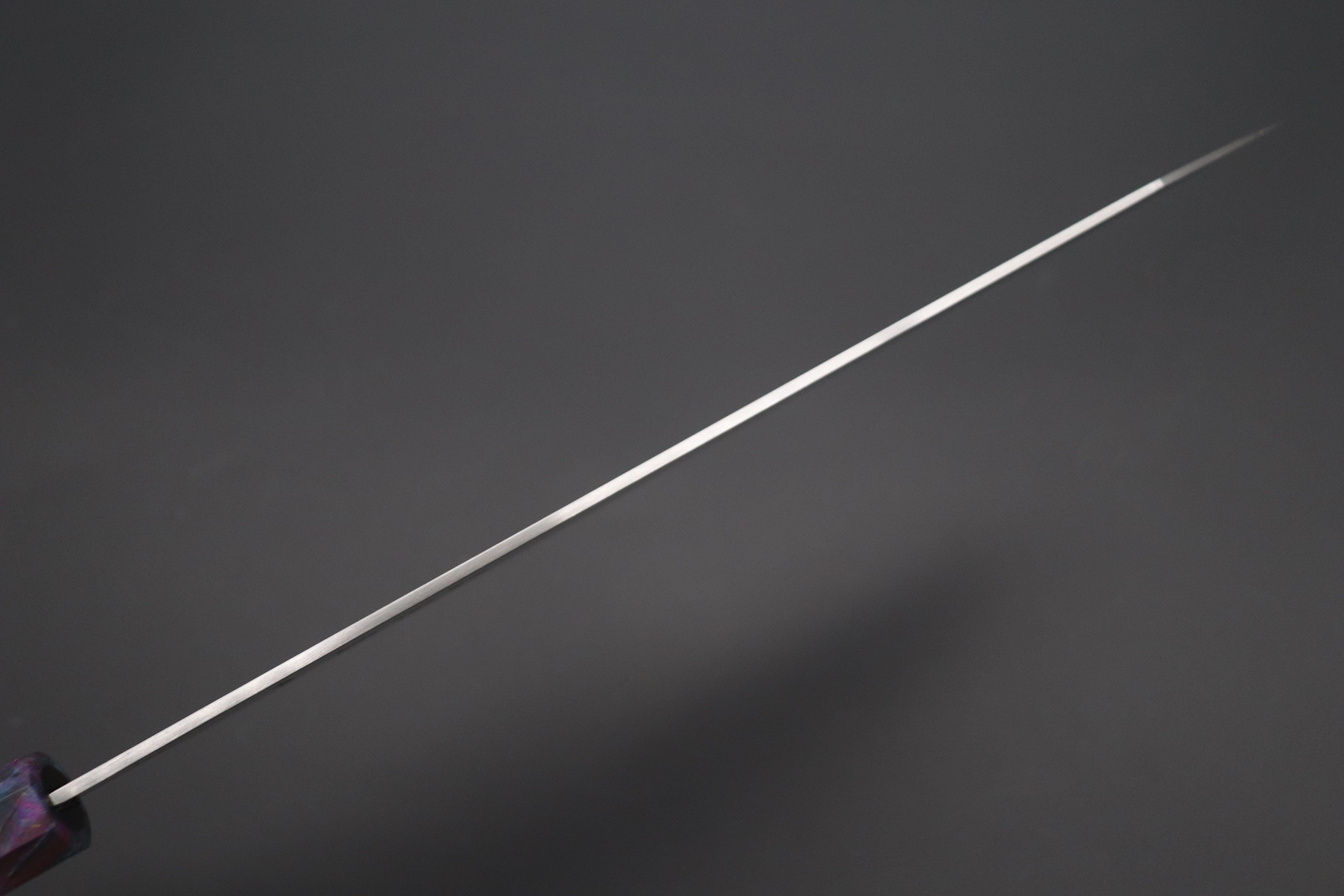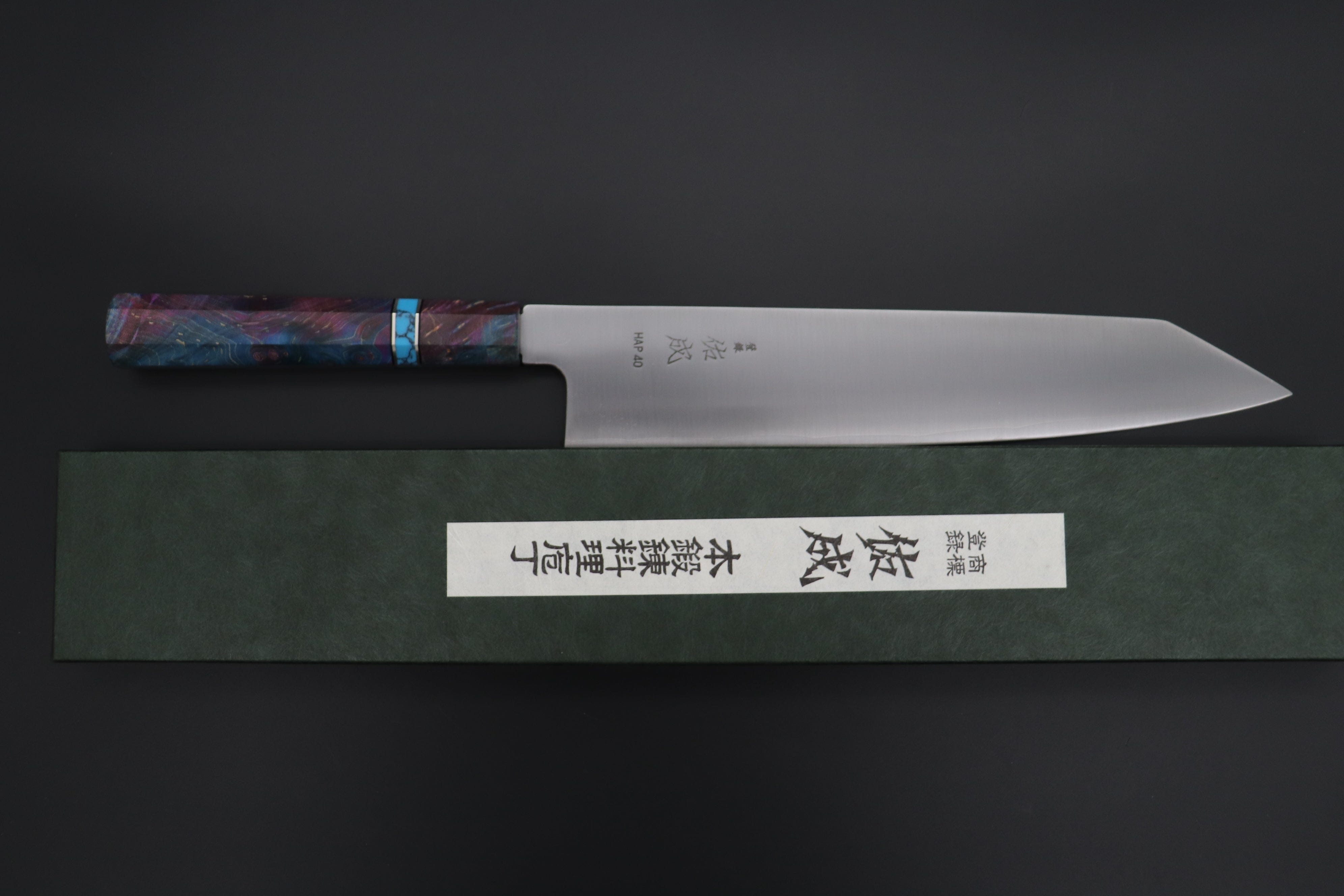 This Custom Limited Edition Sukenari HAP-40 Clad Kiritsuke knife is fitted with a Innovative Sunset Purple Color Octagonal Stabilized Maple Wood Handle with Composite Turquoise Gemstone Ring and Nickel Silver Spacers. A matching Magnolia wood Saya (Sheath) with a black pakkawood Saya pin is also included with the knife.