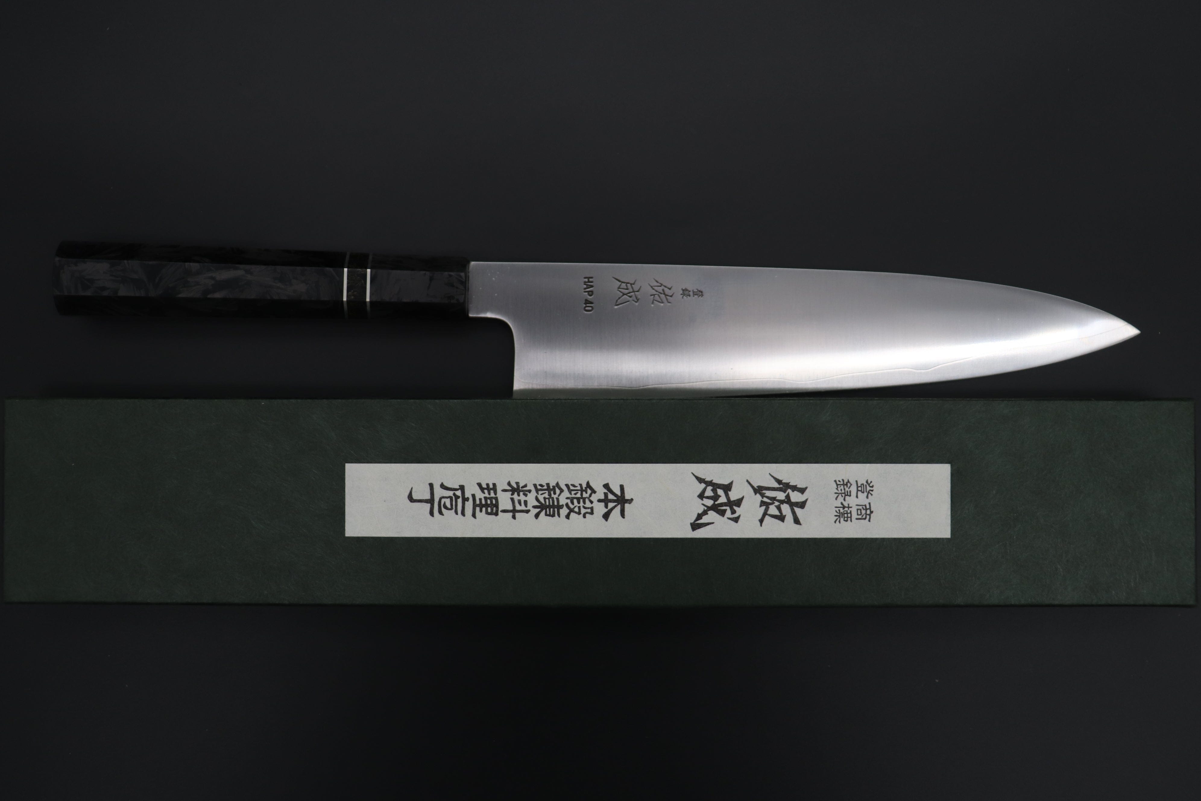 Master Hanaki believes that these new HAP-40 knives offer very competitive cutting performance and edge retention relative to his ZDP-189 and Aogami Super knives. In addition, HAP-40 offers better toughness than ZDP-189, - even when it is heat-treated to a higher Rockwell hardness. Consequently, Master Hanaki has confidence that the new Sukenari HAP-40 knives will prove to be some of the best performing and most practical knives that Sukenari offer.