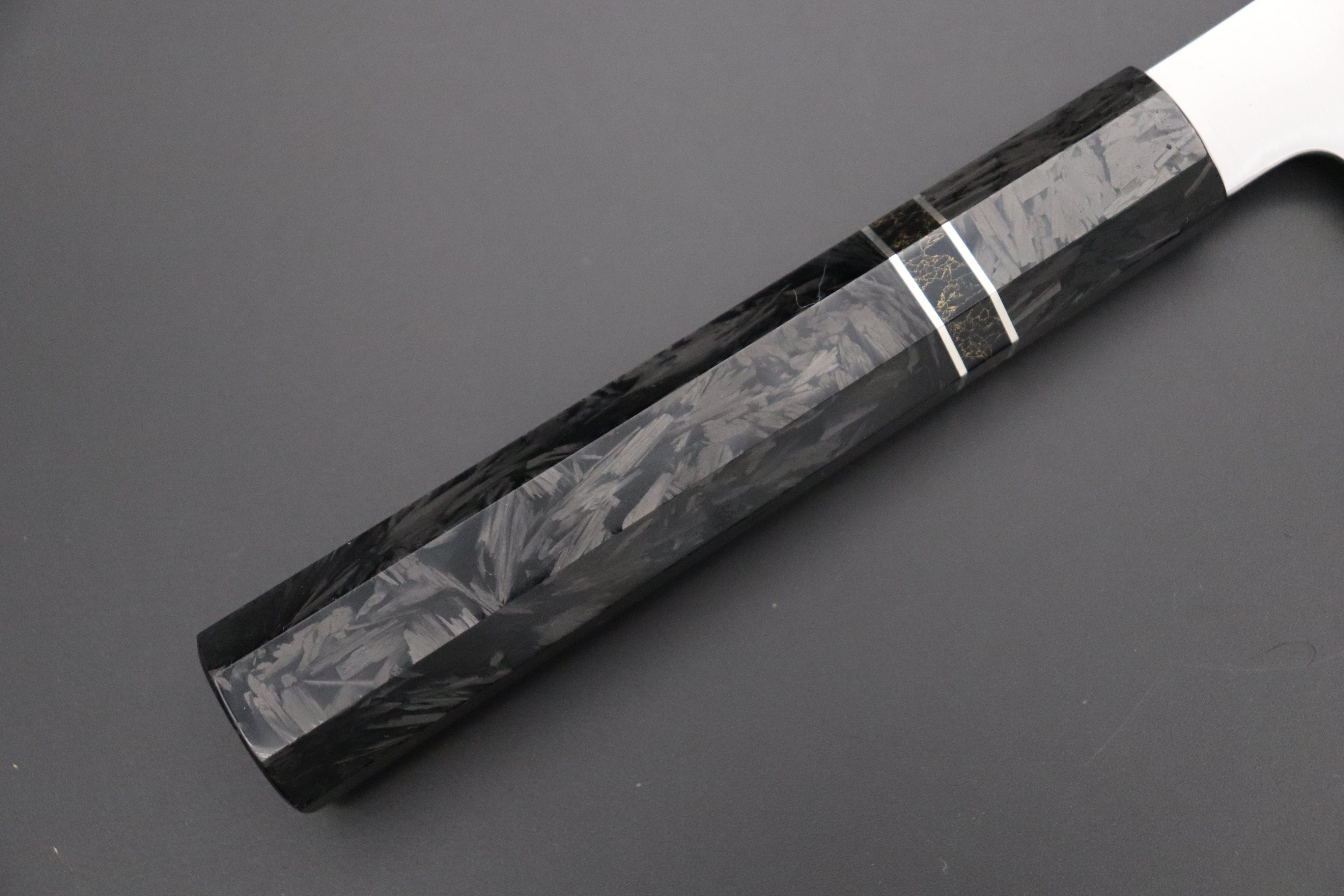 This Custom Limited Edition Sukenari HAP-40 Clad Wa Gyuto knife is fitted with a Innovative Octagonal Carbon Fiber Handle with Composite Black Color Turquoise Gemstone Ring and Nickel Silver Spacers. A matching Black Lacquered wood Saya (Sheath) with a black pakkawood Saya pin is also included with the knife.