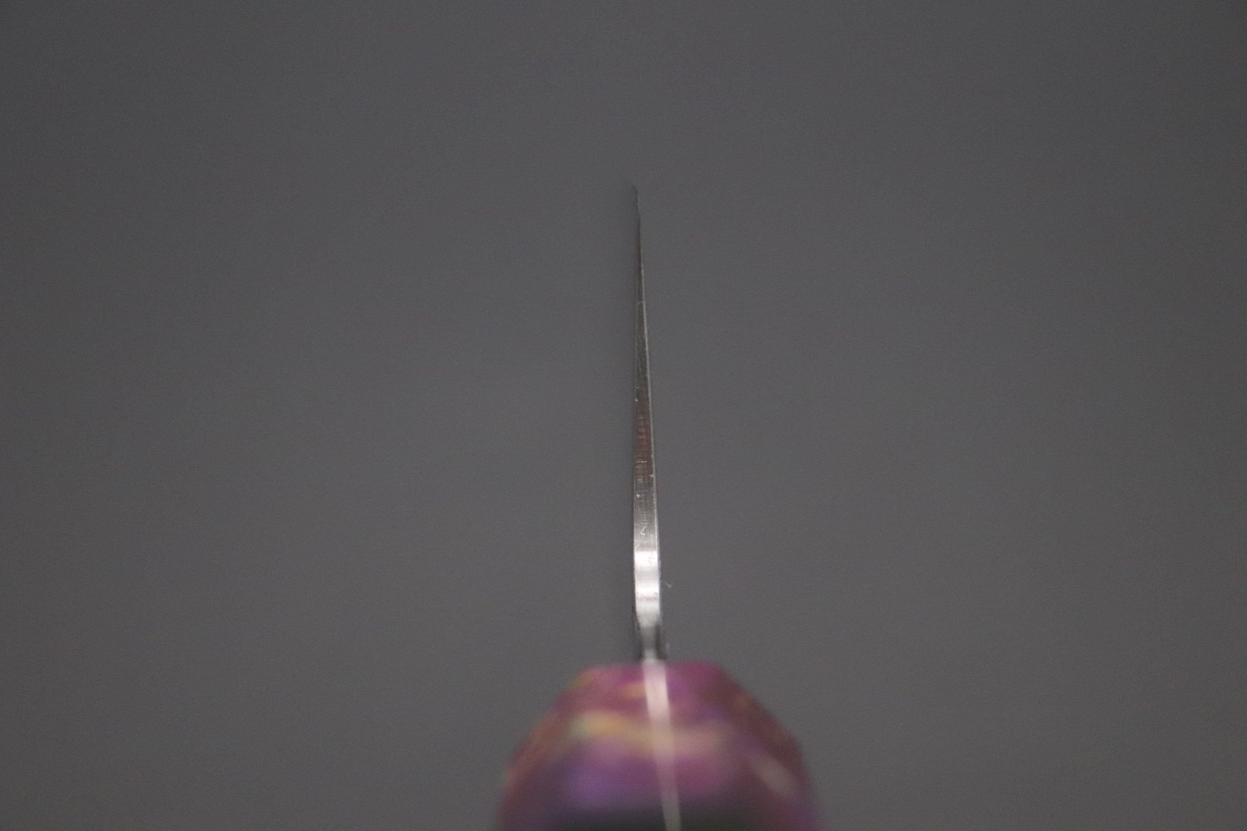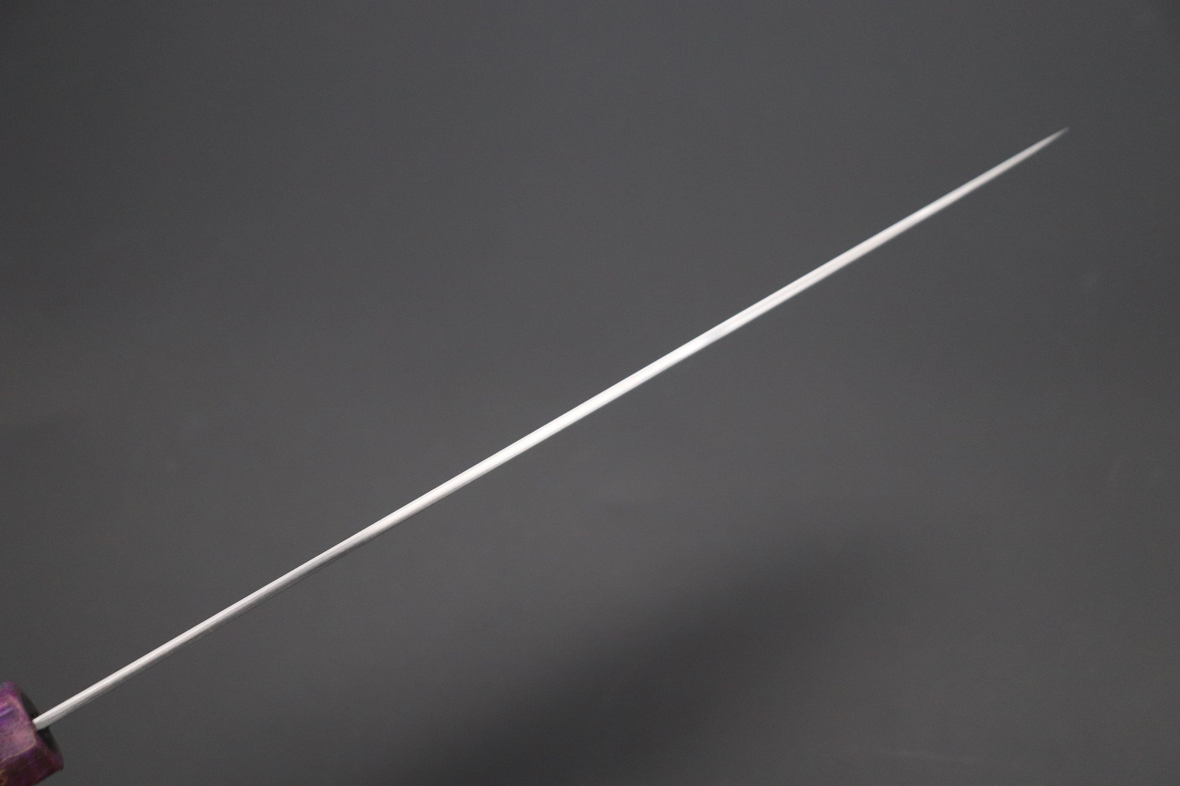This Custom Limited Edition Sukenari HAP-40 Clad Wa Gyuto knife is fitted with a InnovativeSunset Purple Color Octagonal Stabilized Maple Wood Handle with Composite Black Color Turquoise Gemstone Ring and Nickel Silver Spacers. A matching Black Lacquered wood Saya (Sheath) with a black pakkawood Saya pin is also included with the knife.