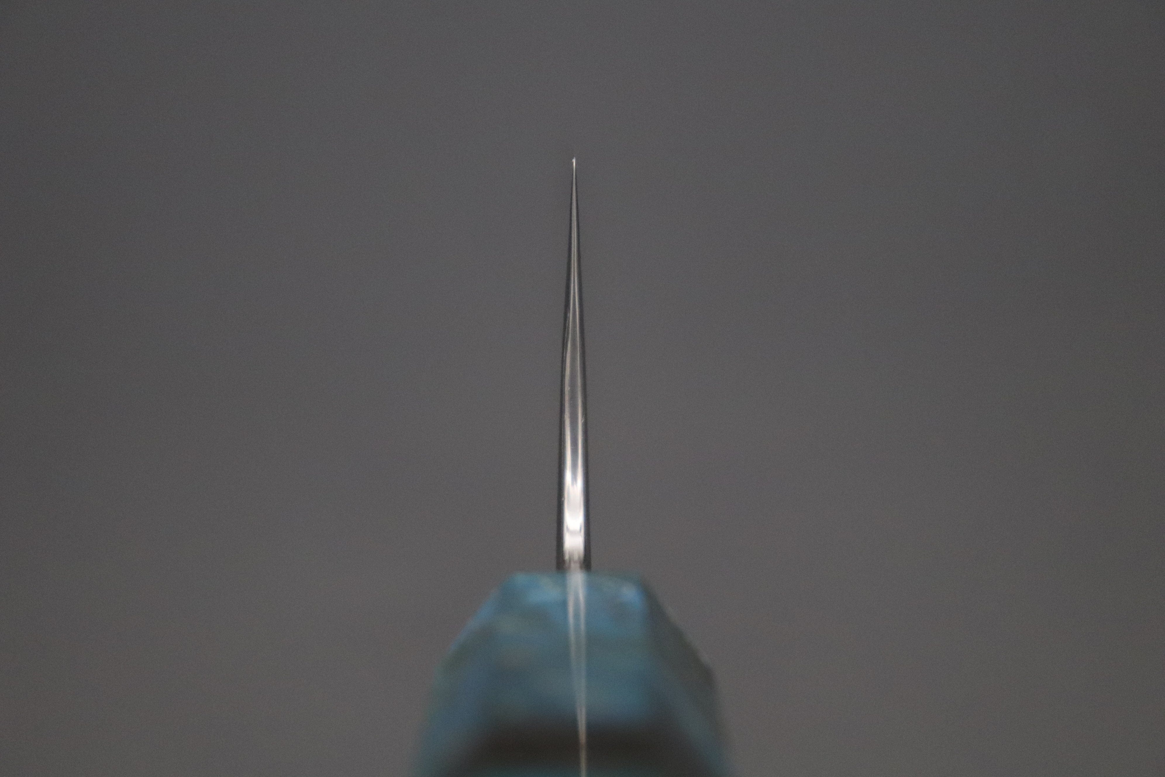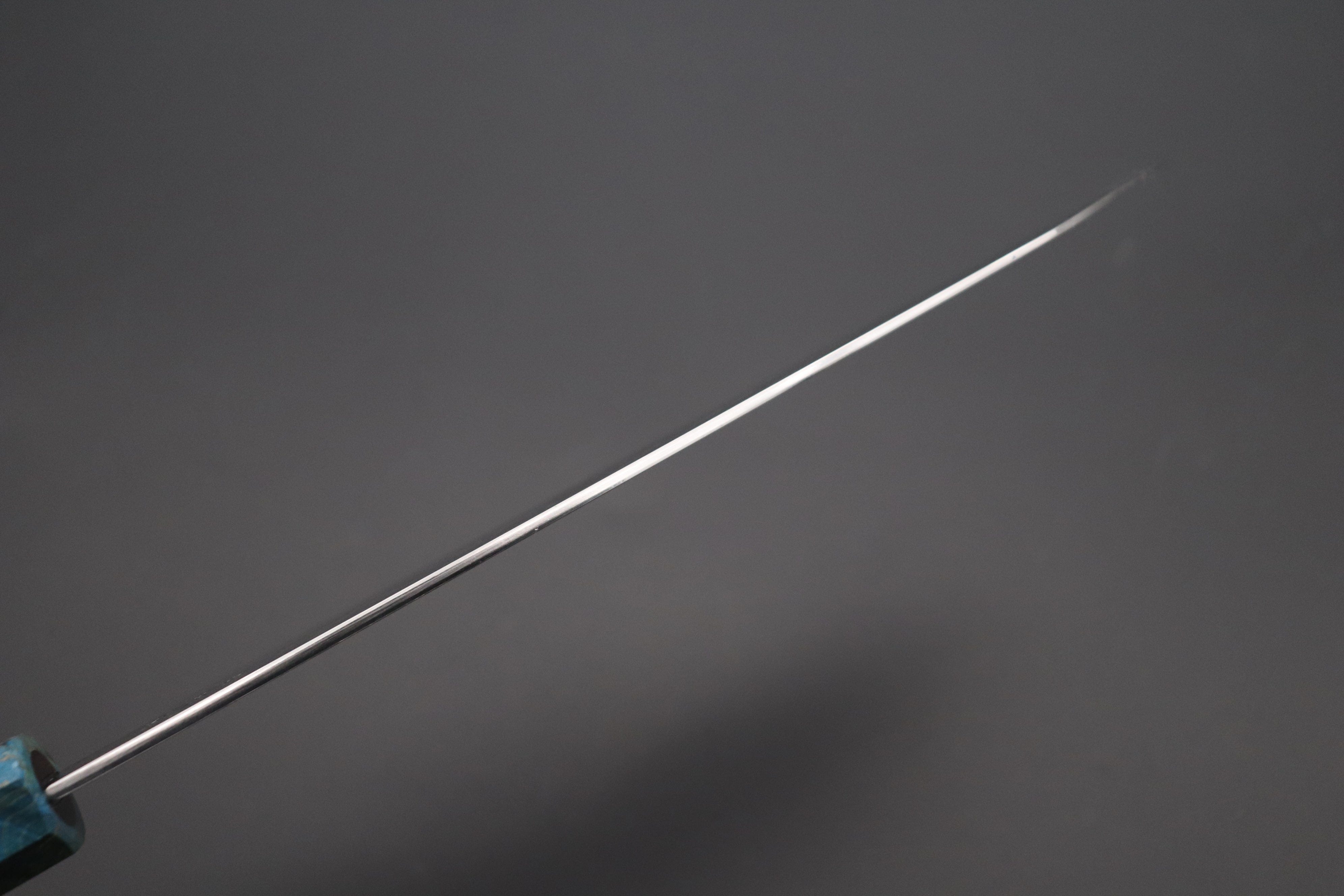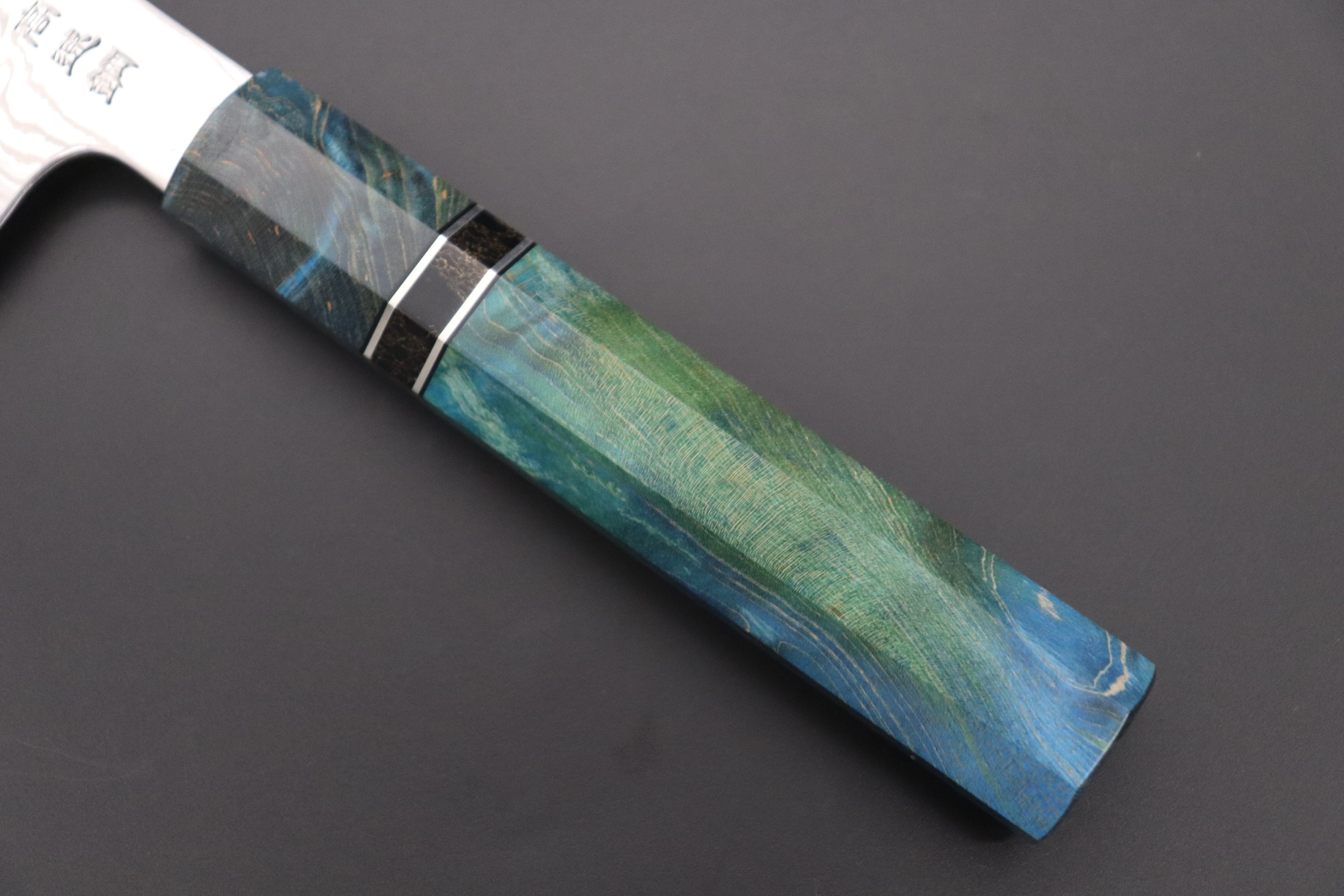 This Custom Limited Edition Sukenari HAP-40 Nickel Damascus Kiritsuke 210mm knife is fitted with a Innovative Emerald Ocean Blue Color Octagonal Stabilized Maple Wood Handle with Composite Black Color Turquoise Gemstone Ring and Nickel Silver Spacers. For safekeeping, this knife comes with a matching Magnolia wood Saya (Sheath) with a black pakkawood Saya pin.
