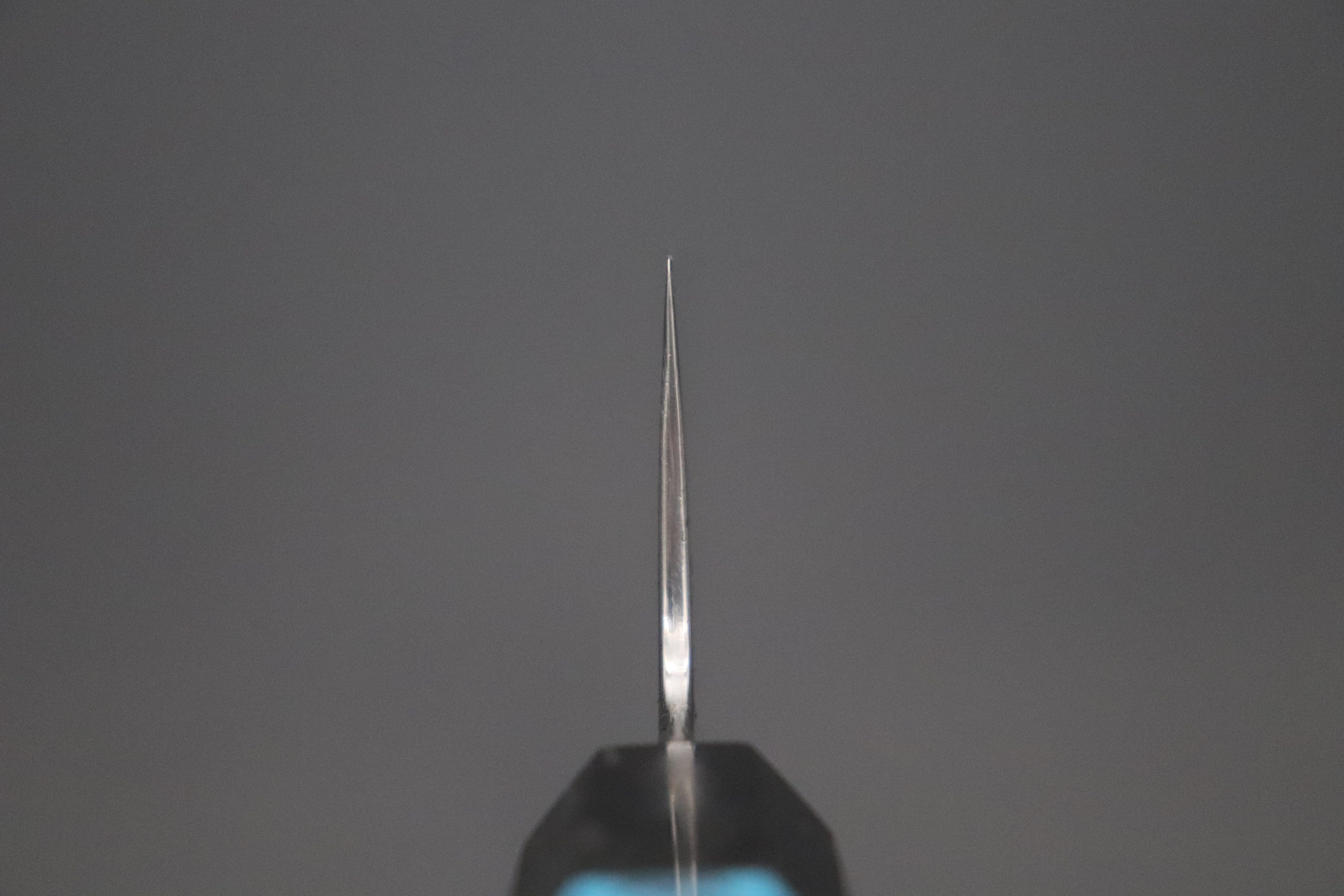 This Custom Limited Edition Sukenari HAP-40 Nickel Damascus Kiritsuke 240mm knife is fitted with a Innovative Octagonal Carbon Fiber Handle with Composite Turquoise Gemstone Ring and Nickel Silver Spacers. For safekeeping, this knife comes with a matching Black Lacquered wood Saya (Sheath) with a black pakkawood Saya pin.