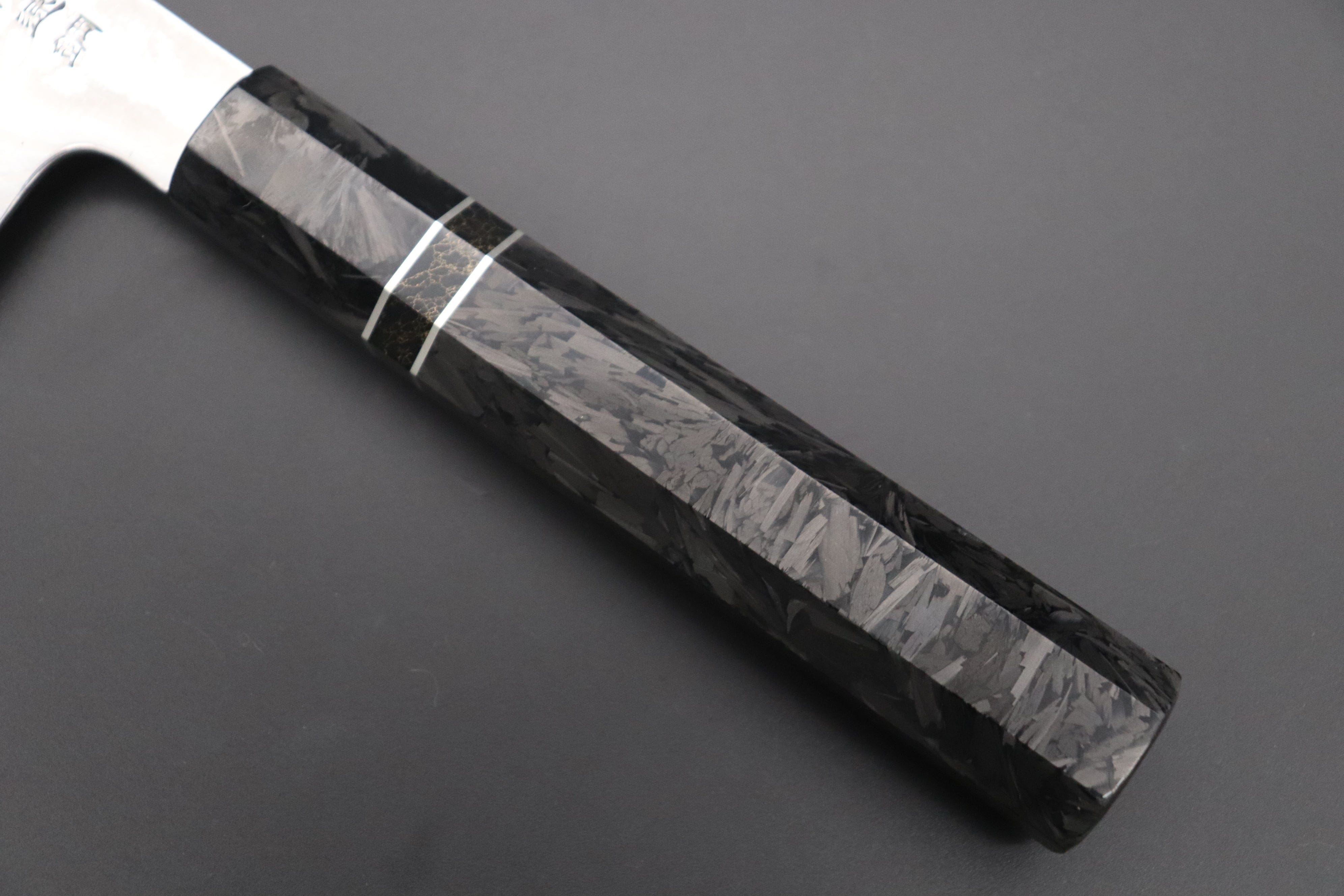 This Custom Limited Edition Sukenari HAP-40 Nickel Damascus Kiritsuke 240mm knife is fitted with a Innovative Octagonal Carbon Fiber Handle with Composite Black Color Turquoise Gemstone Ring and Nickel Silver Spacers. For safekeeping, this knife comes with a matching Black Lacquered wood Saya (Sheath) with a black pakkawood Saya pin.