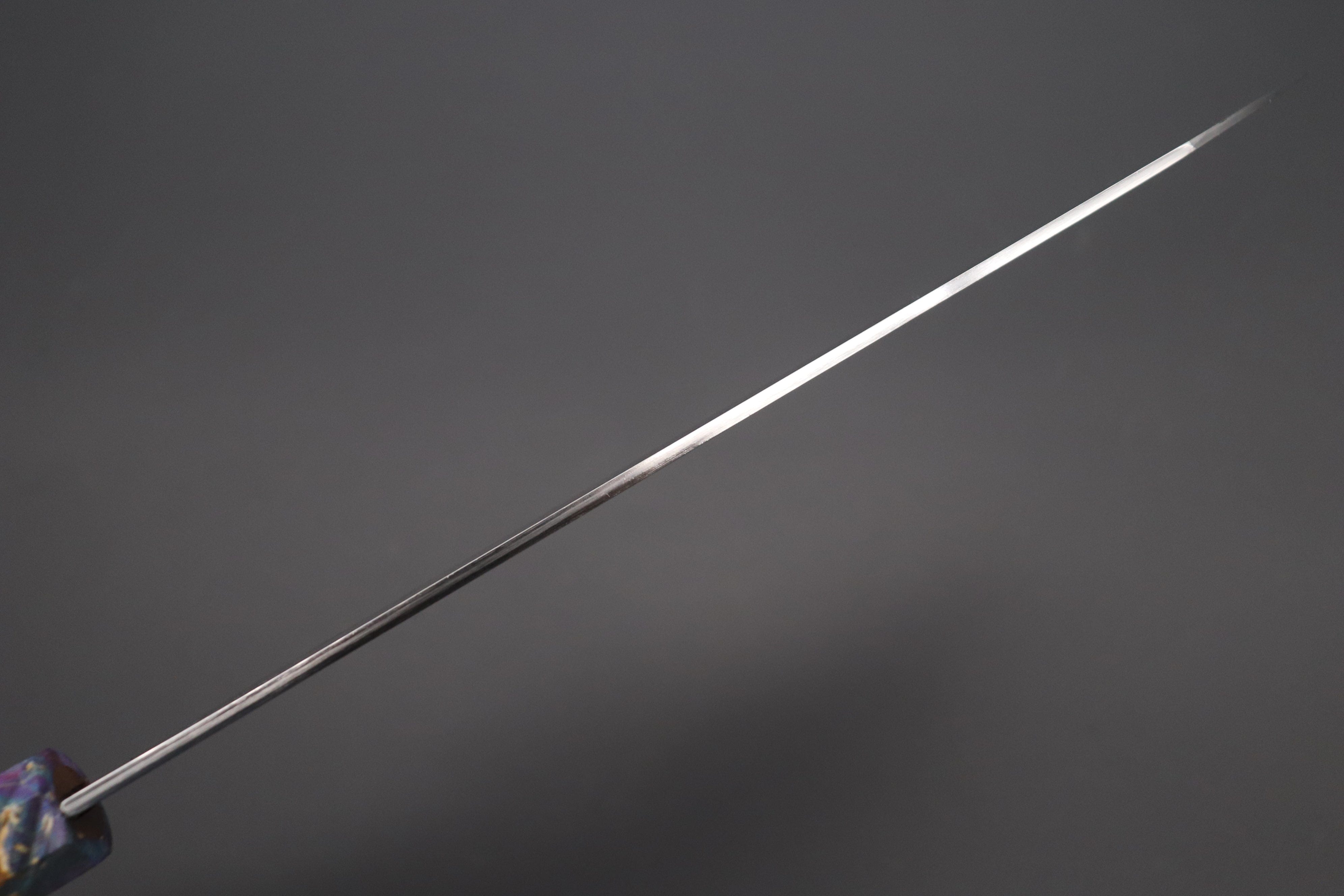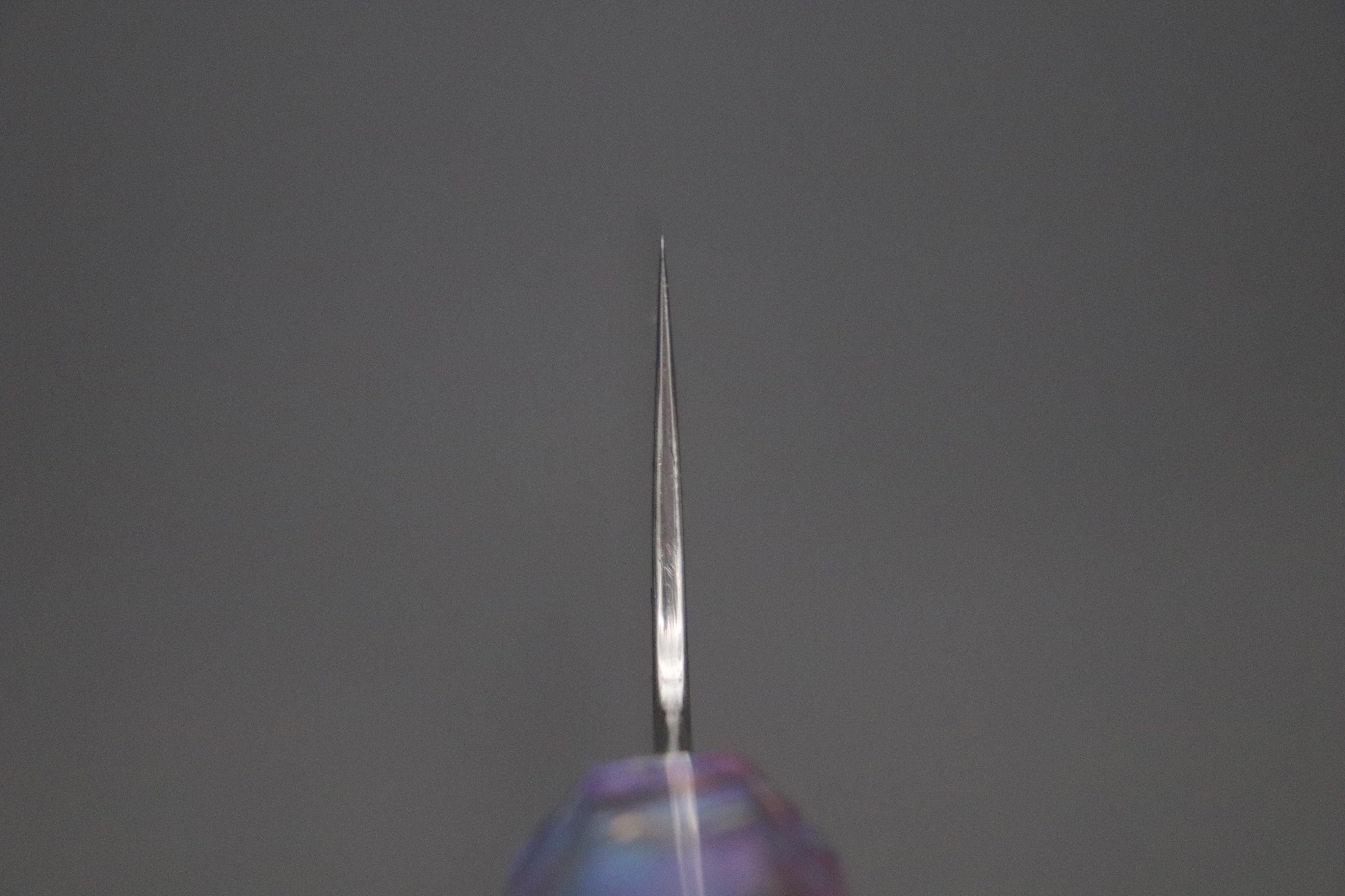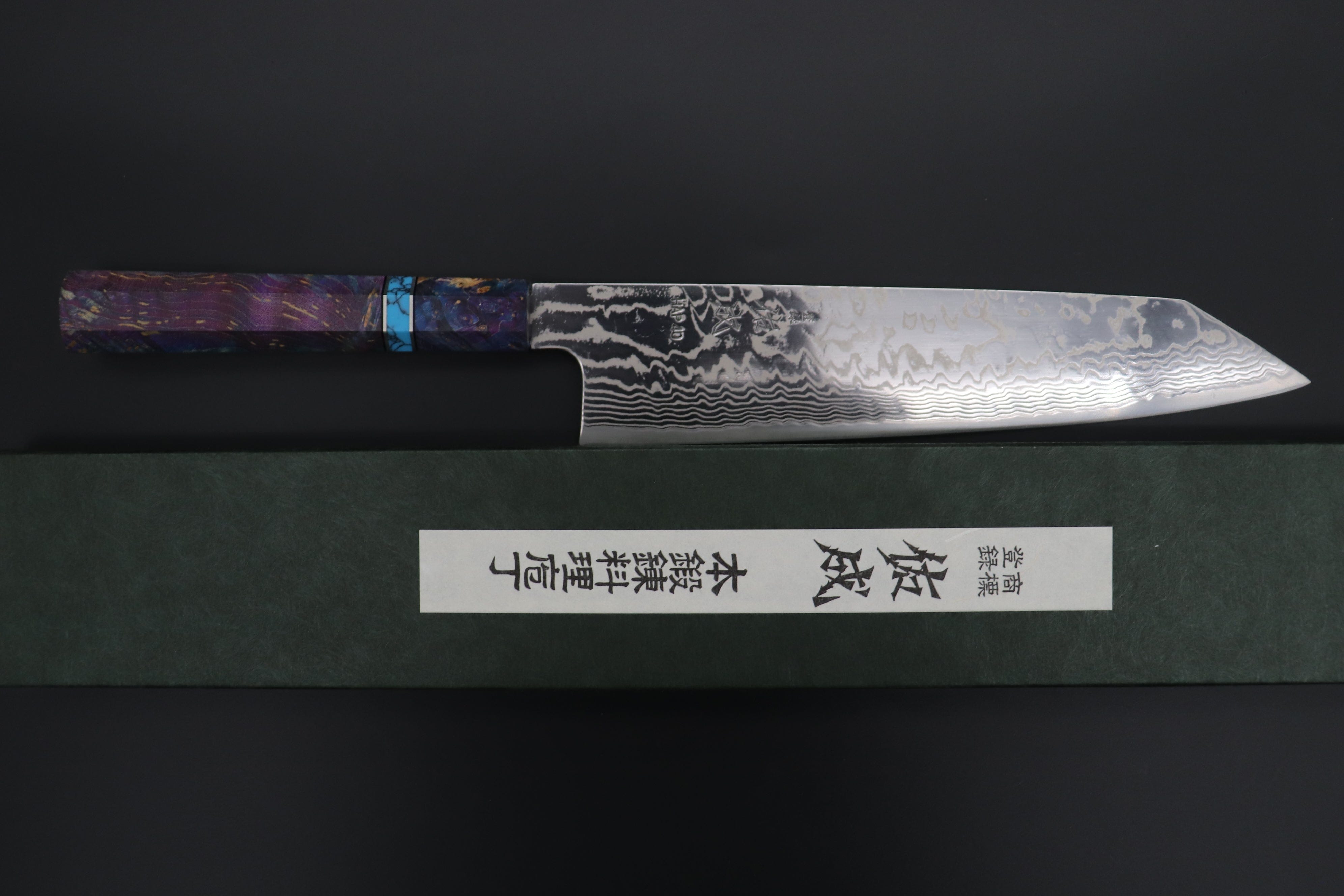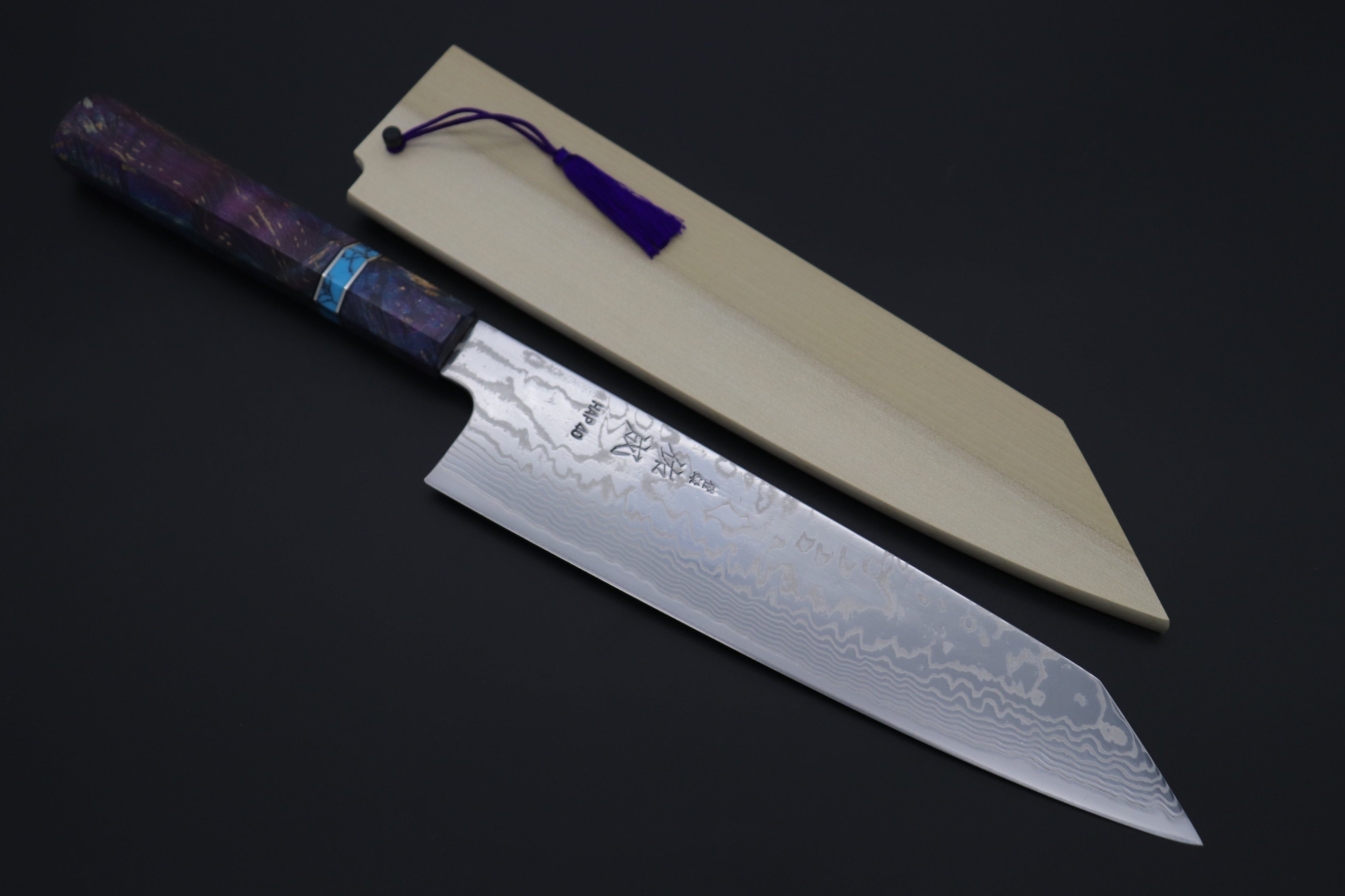 This Custom Limited Edition Sukenari HAP-40 Nickel Damascus Kiritsuke 240mm knife is fitted with a Innovative Sunset Purple Color Octagonal Stabilized Maple Wood Handle with Composite Turquoise Gemstone Ring and Nickel Silver Spacers. For safekeeping, this knife comes with a matching Black Lacquered wood Saya (Sheath) with a black pakkawood Saya pin.