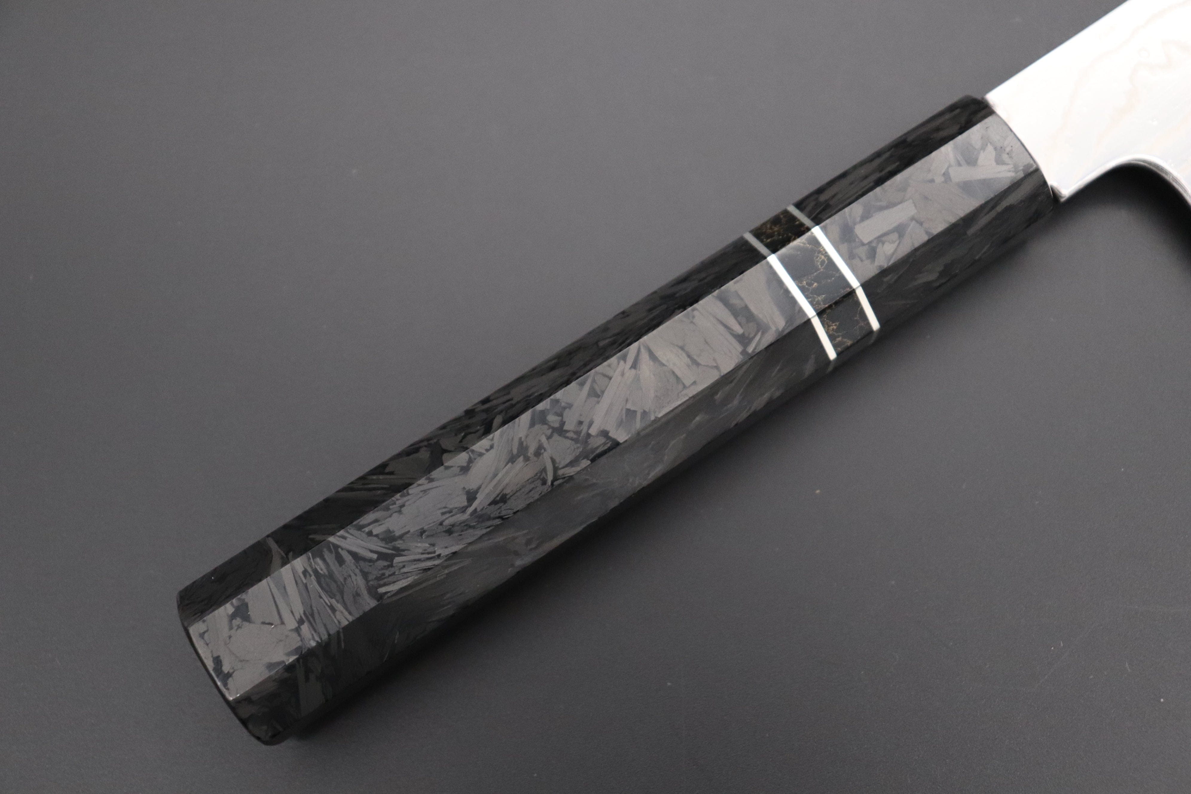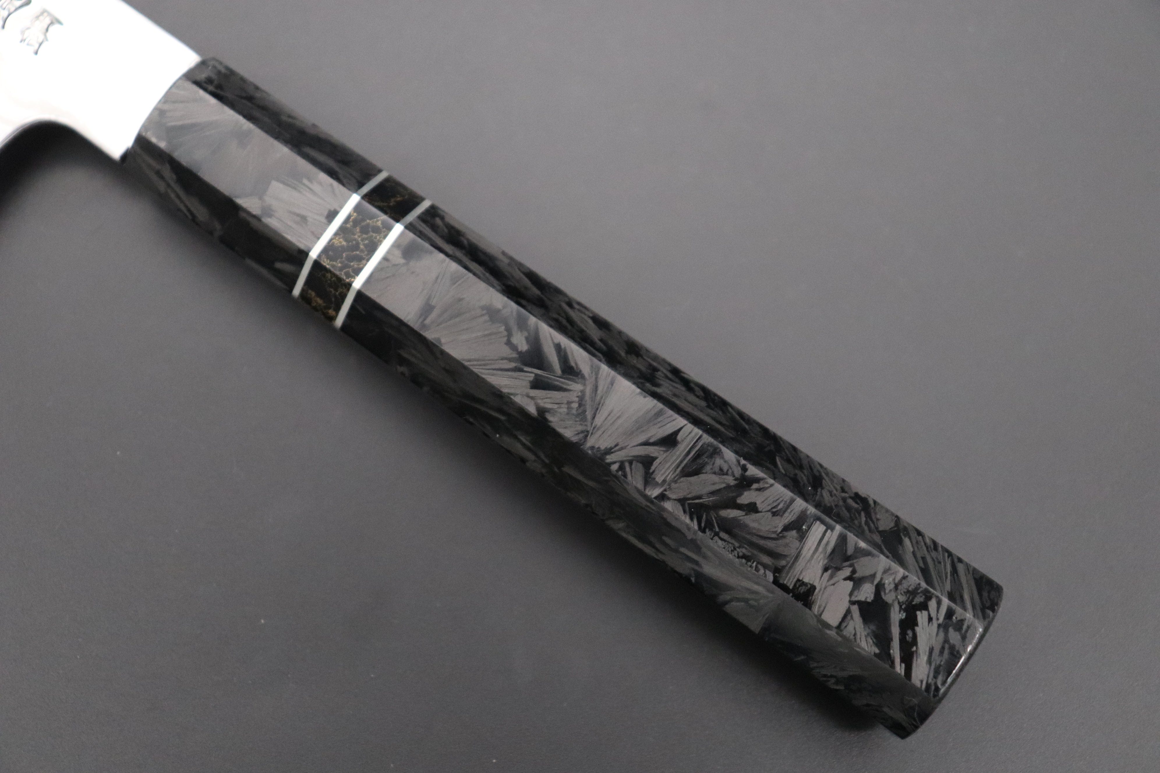 This Custom Limited Edition Sukenari HAP-40 Nickel Damascus Kiritsuke 270mm knife is fitted with a Innovative Octagonal Carbon Fiber Handle with Composite Black Color Turquoise Gemstone Ring and Nickel Silver Spacers. For safekeeping, this knife comes with a handcrafted Magnolia wood Saya (Sheath) with a black pakkawood Saya pin.