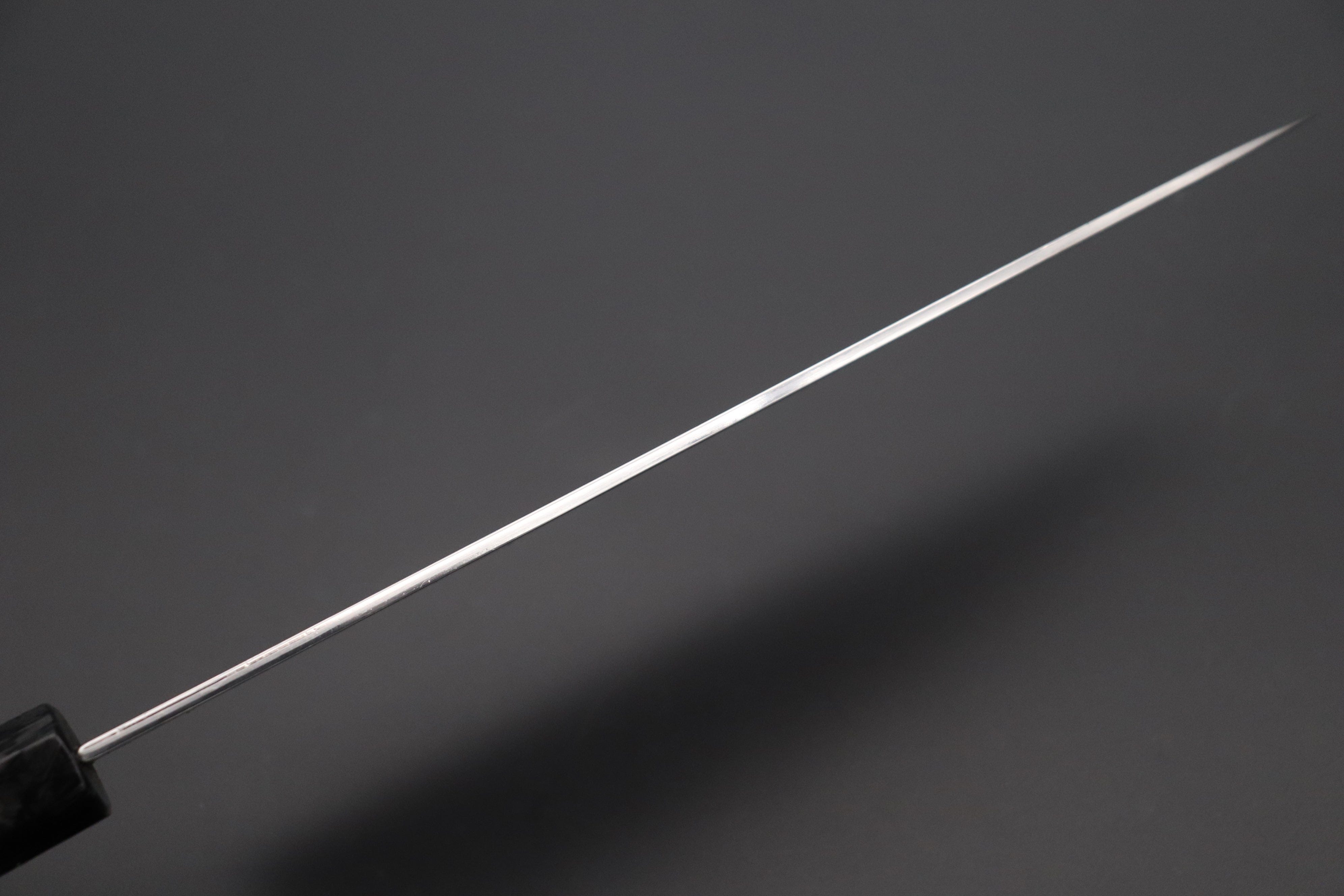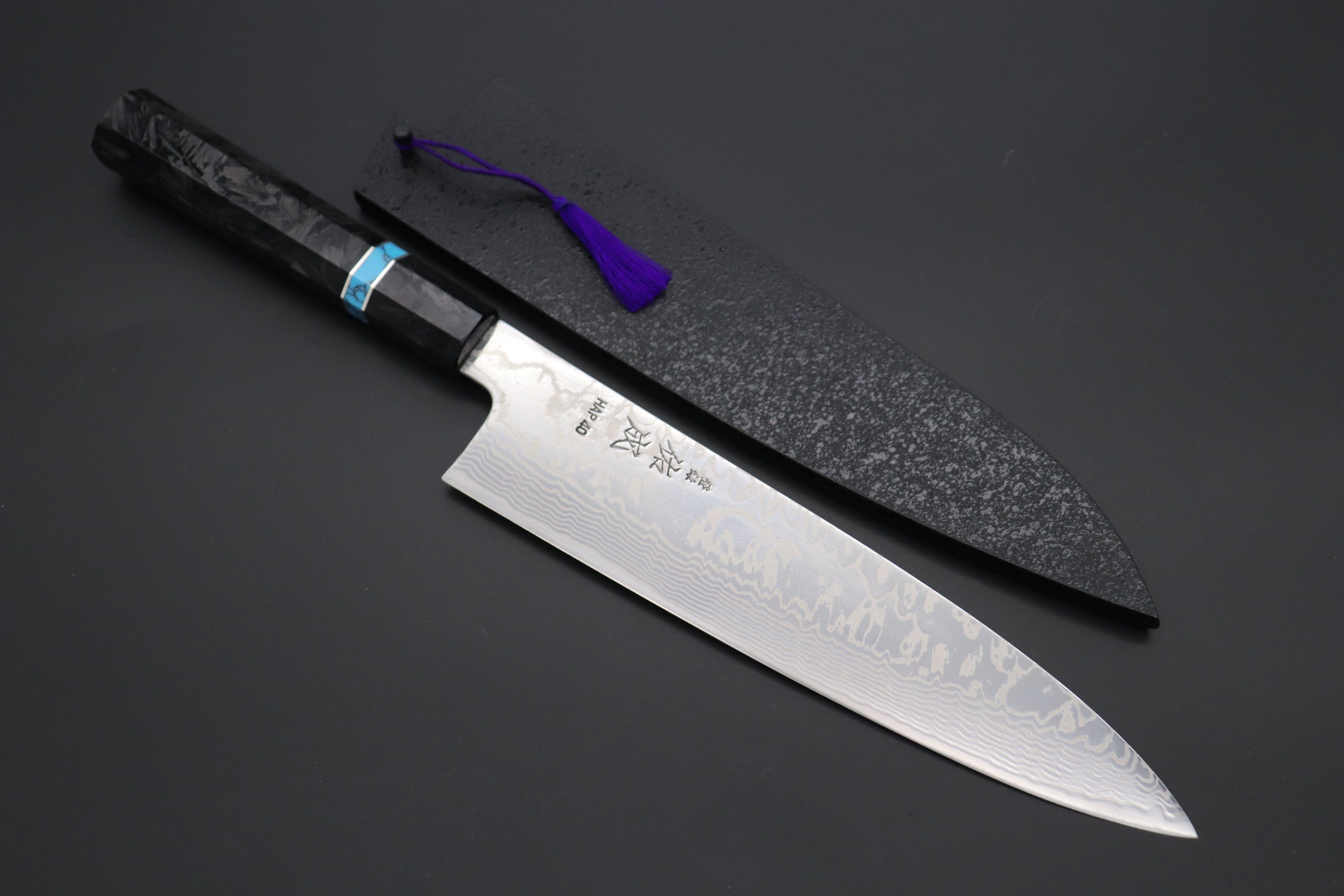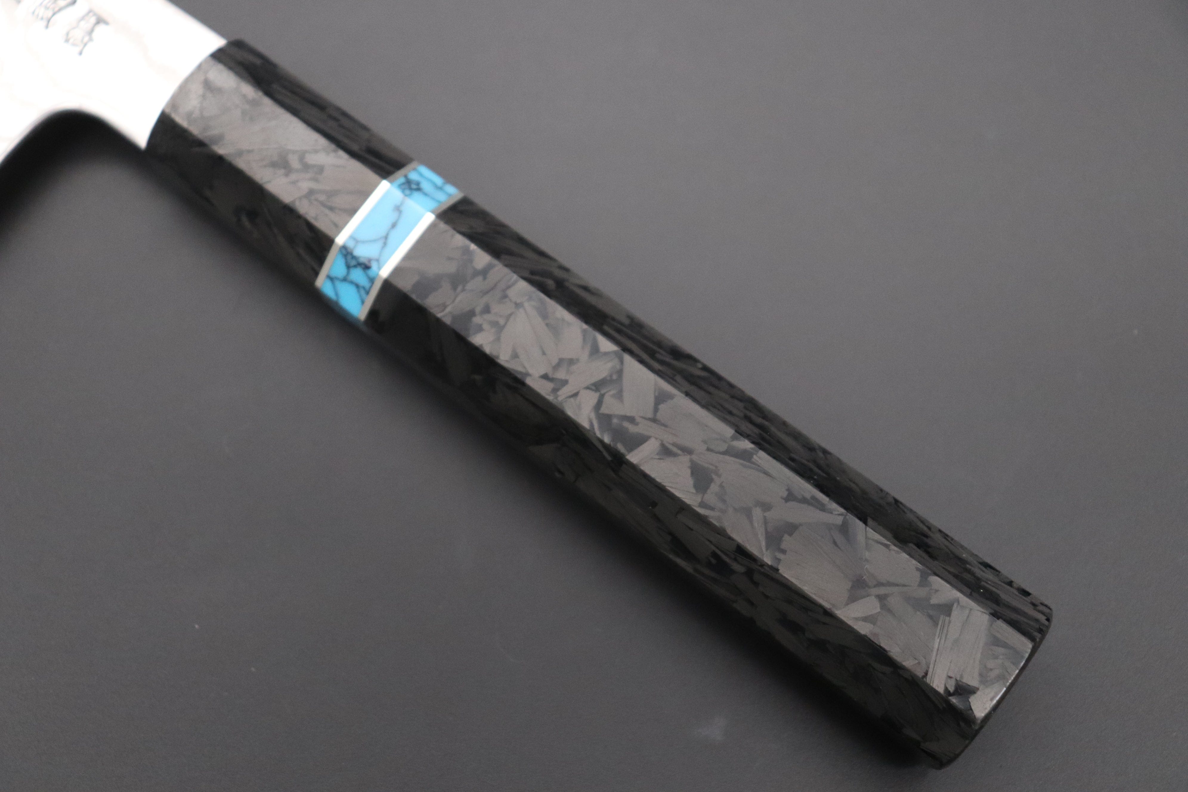 This Custom Limited Edition Sukenari HAP-40 Nickel Damascus Wa Gyuto 240mm knife is fitted with a Innovative Octagonal Carbon Fiber Handle with Composite Blue Turquoise Gemstone Ring and Nickel Silver Spacers. For safekeeping, this knife comes with a matching Black Lacquered wood Saya (Sheath) with a black pakkawood Saya pin.