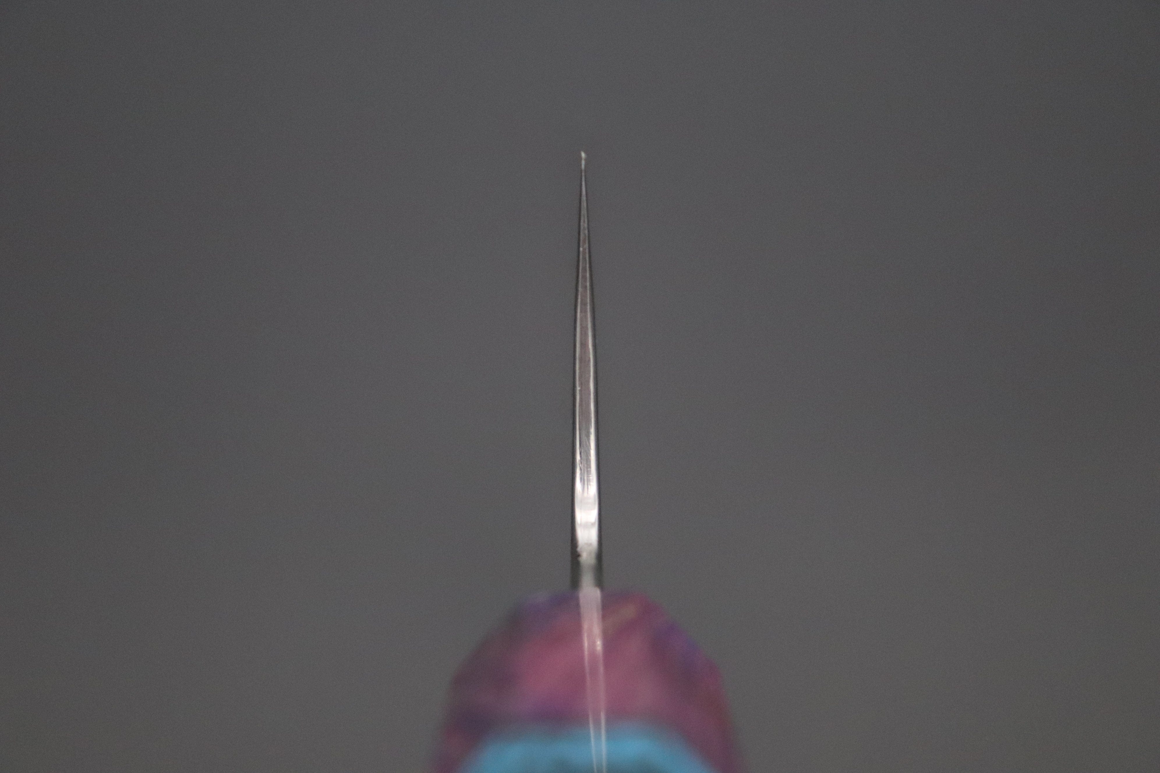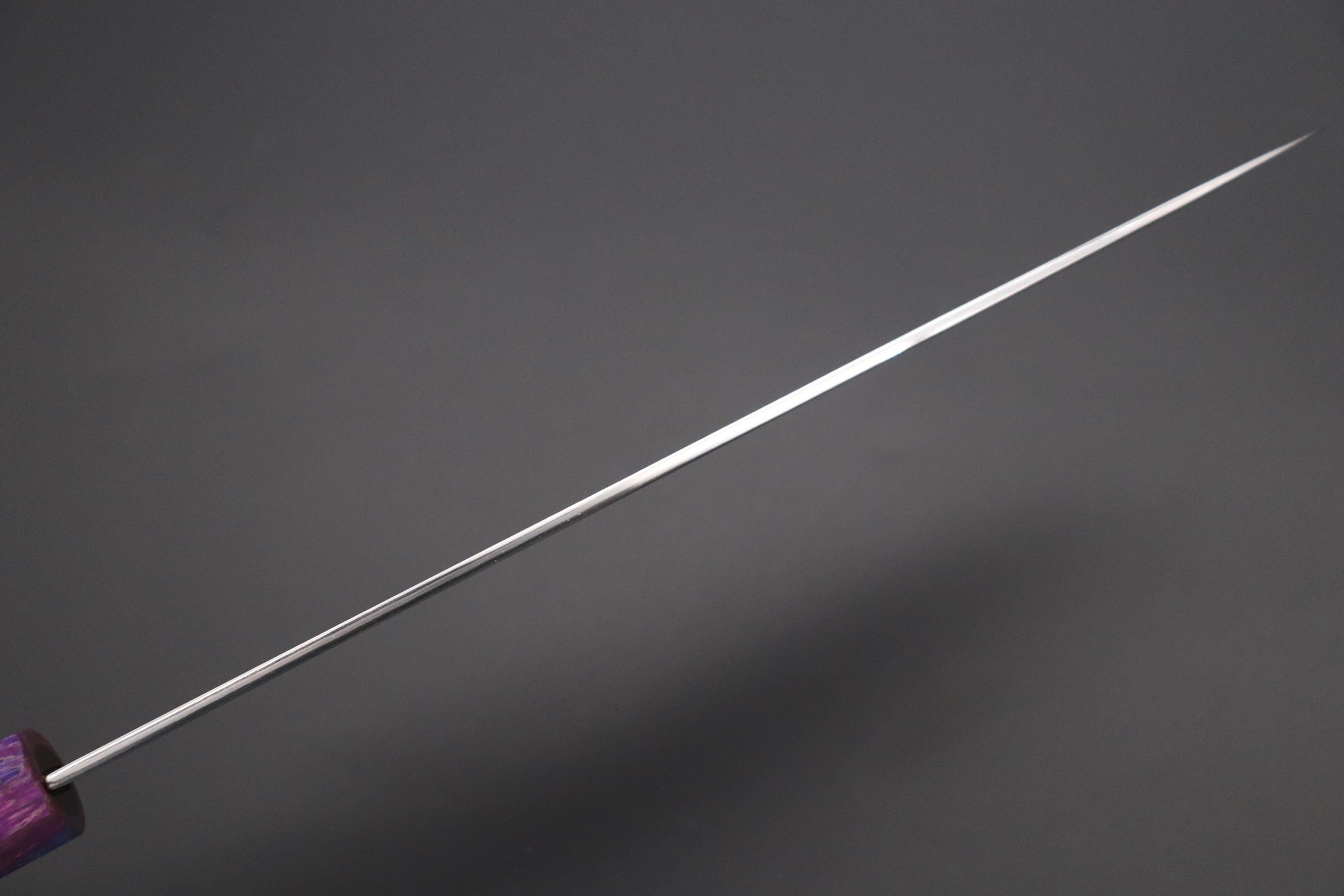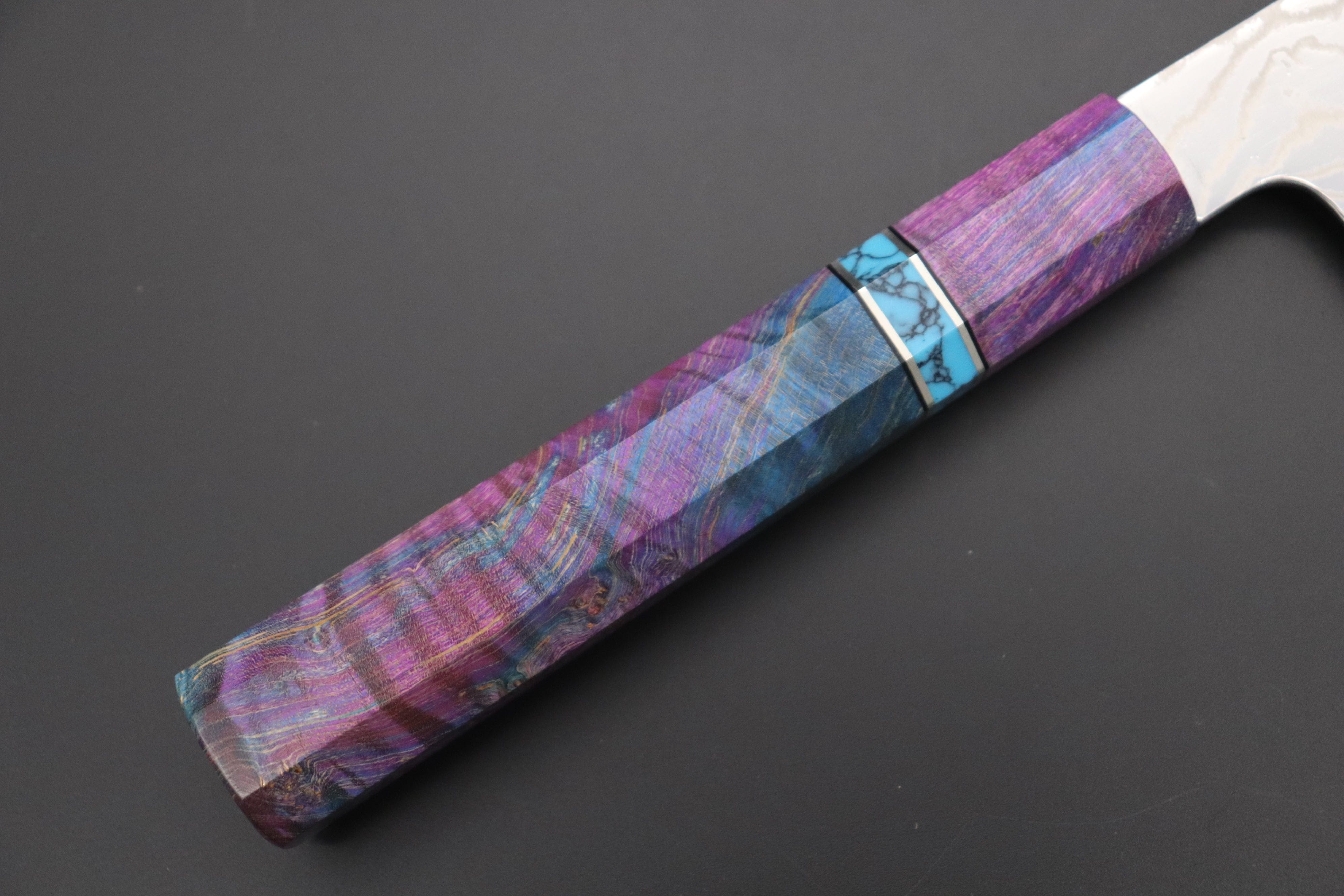 This Custom Limited Edition Sukenari HAP-40 Nickel Damascus Wa Gyuto 240mm knife is fitted with a Innovative Sunset Purple Color Octagonal Stabilized Maple Wood Handle with Composite Turquoise Gemstone Ring and Nickel Silver Spacers. For safekeeping, this knife comes with a matching Black Lacquered wood Saya (Sheath) with a black pakkawood Saya pin.