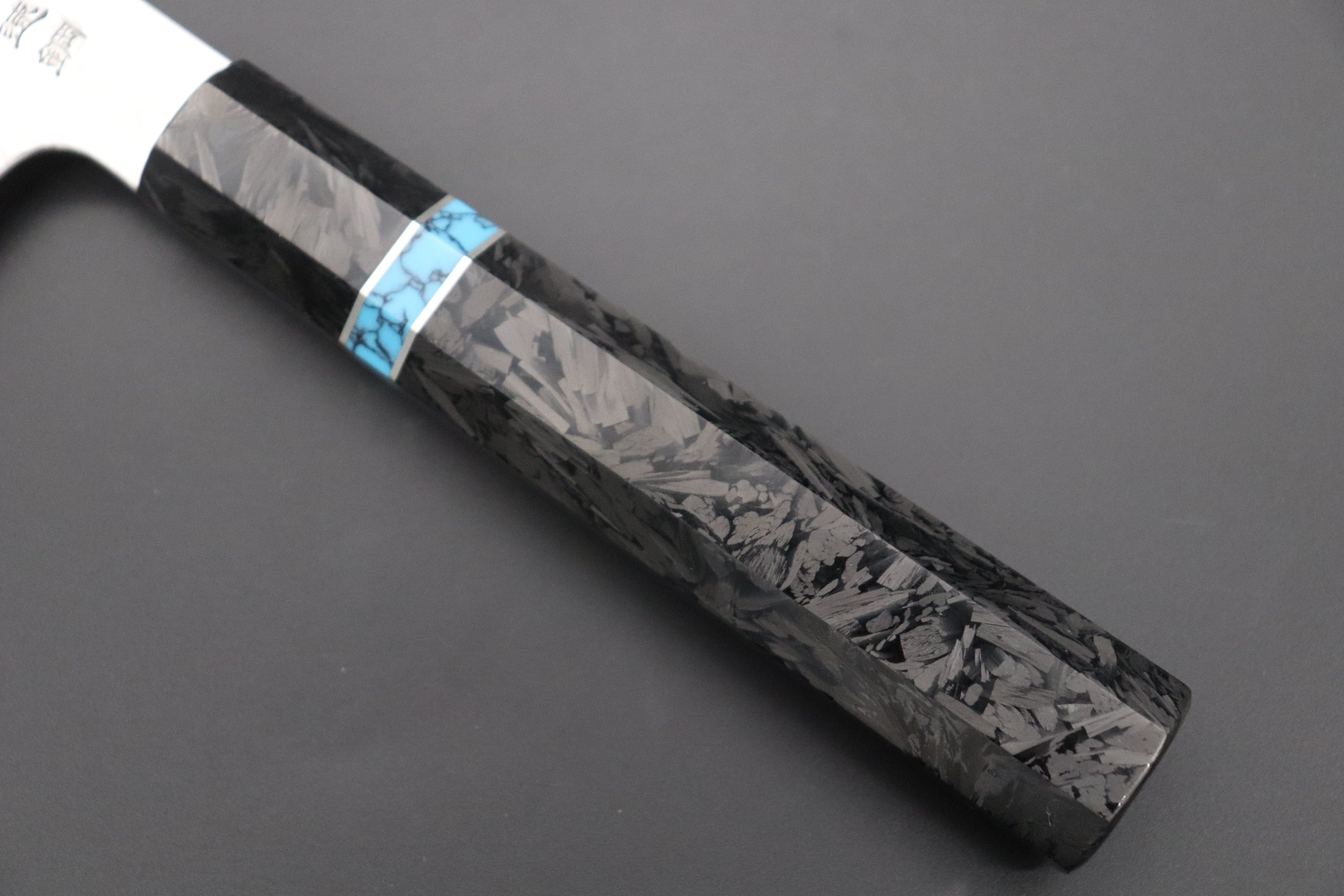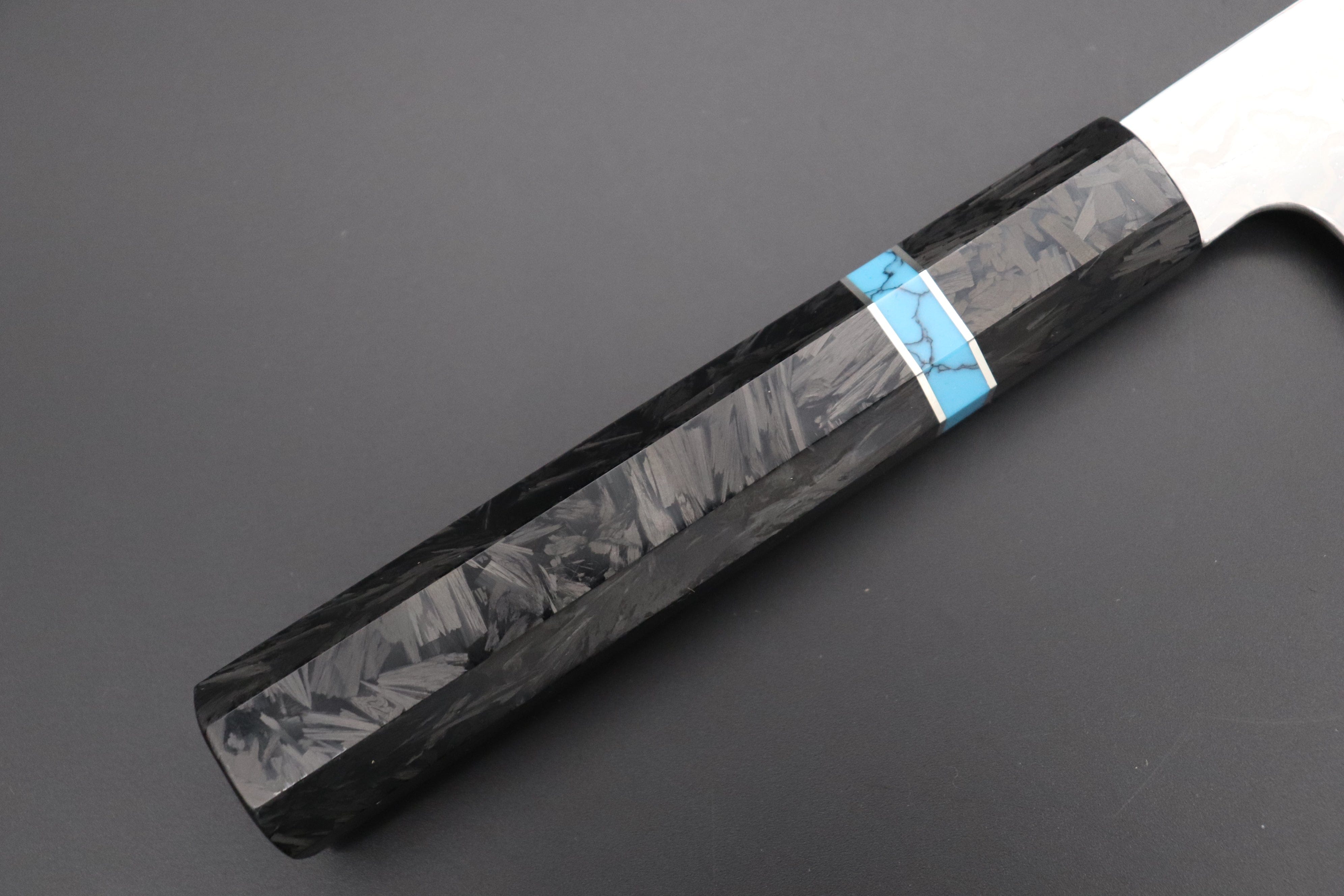 This Custom Limited Edition Sukenari HAP-40 Nickel Damascus Wa Gyuto 270mm knife is fitted with a Innovative Octagonal Carbon Fiber Handle with Composite Blue Color Turquoise Gemstone Ring and Nickel Silver Spacers. For safekeeping, this knife comes with a matching Black Lacquered wood Saya (Sheath) with a black pakkawood Saya pin.