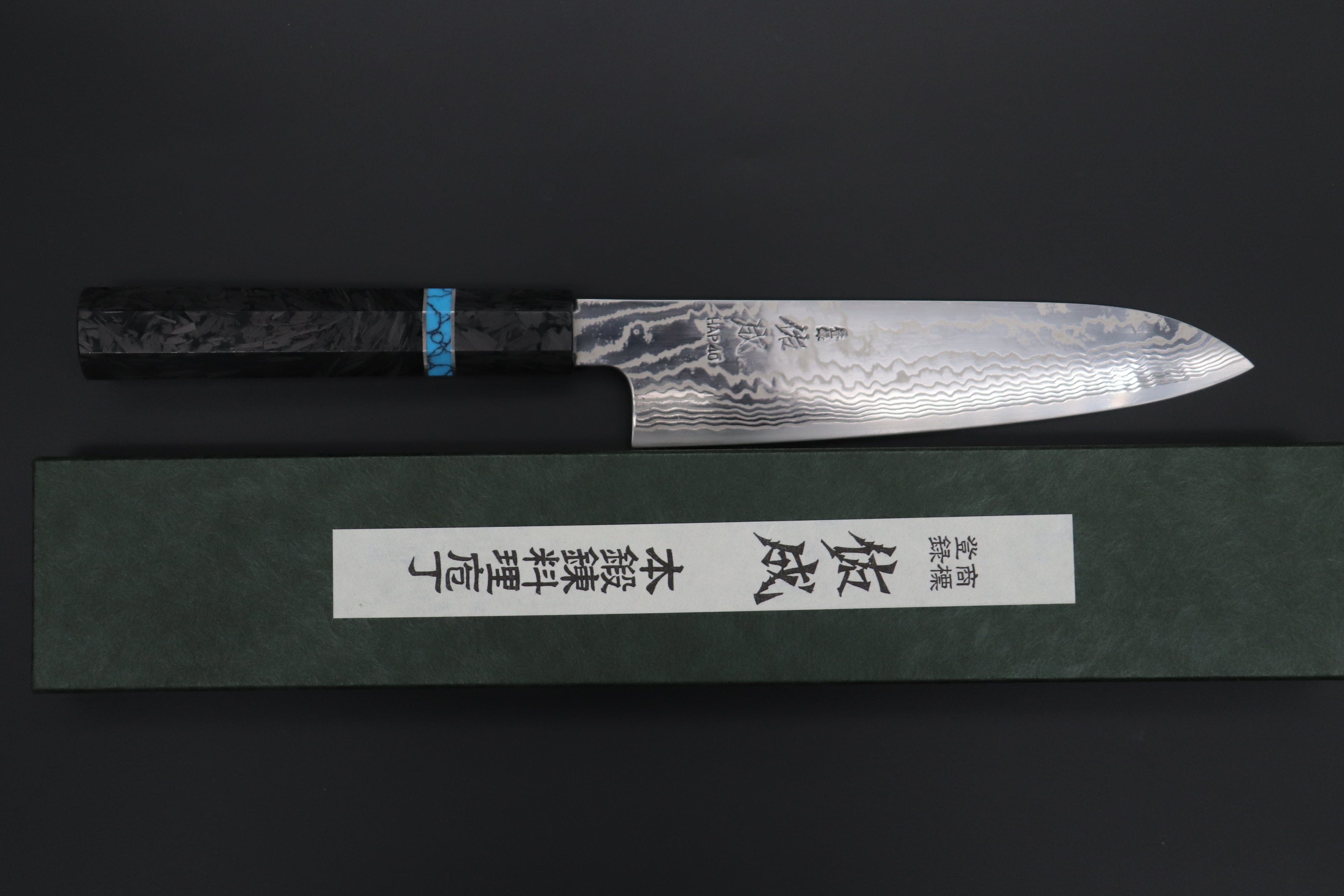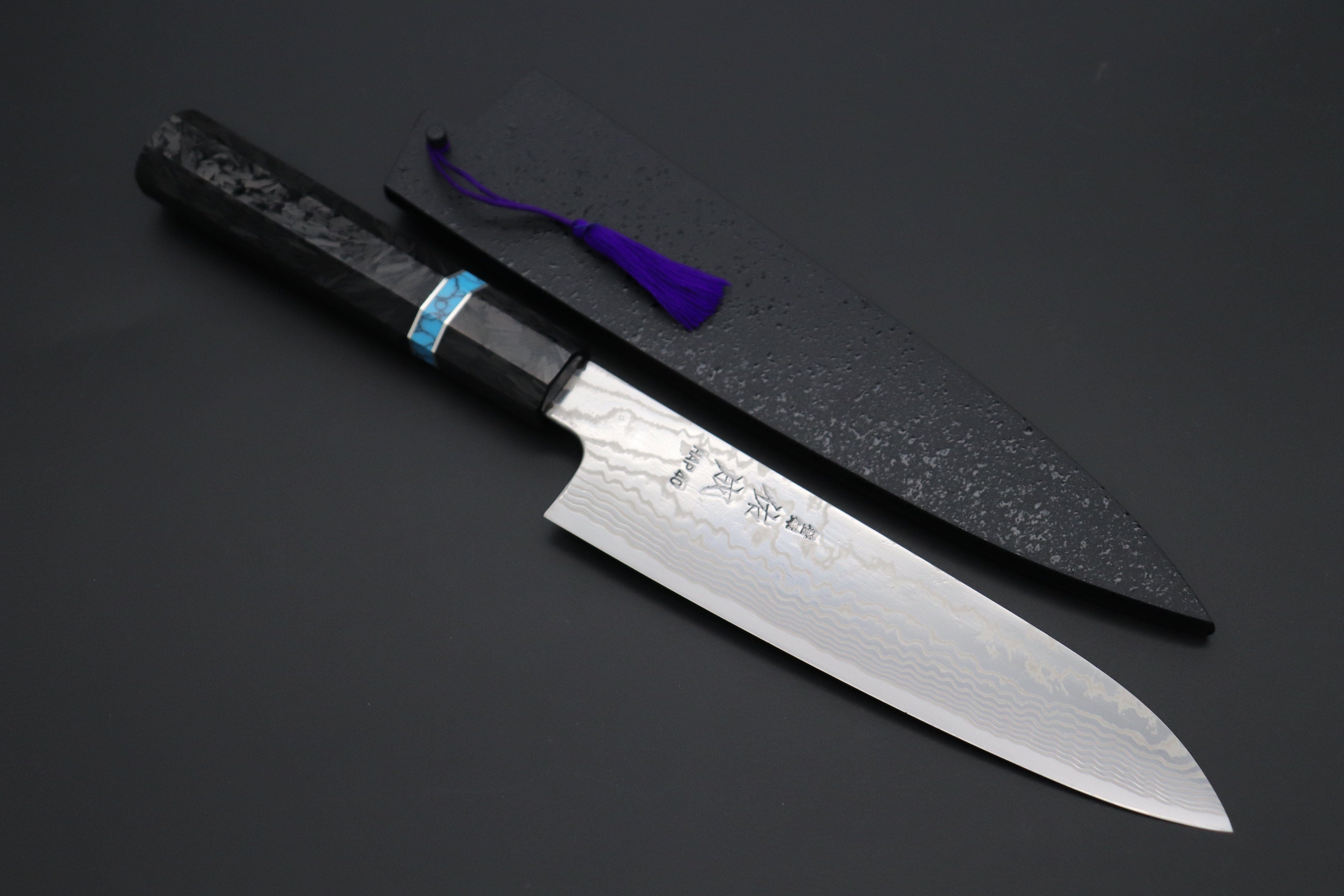 This Custom Limited Edition Sukenari HAP-40 Nickel Damascus Wa Santoku knife is fitted with a Innovative Octagonal Carbon Fiber Handle with Composite Turquoise Gemstone Ring and Nickel Silver Spacers. For safekeeping, this knife comes with a matching Black Lacquered wood Saya (Sheath) with a black pakkawood Saya pin.