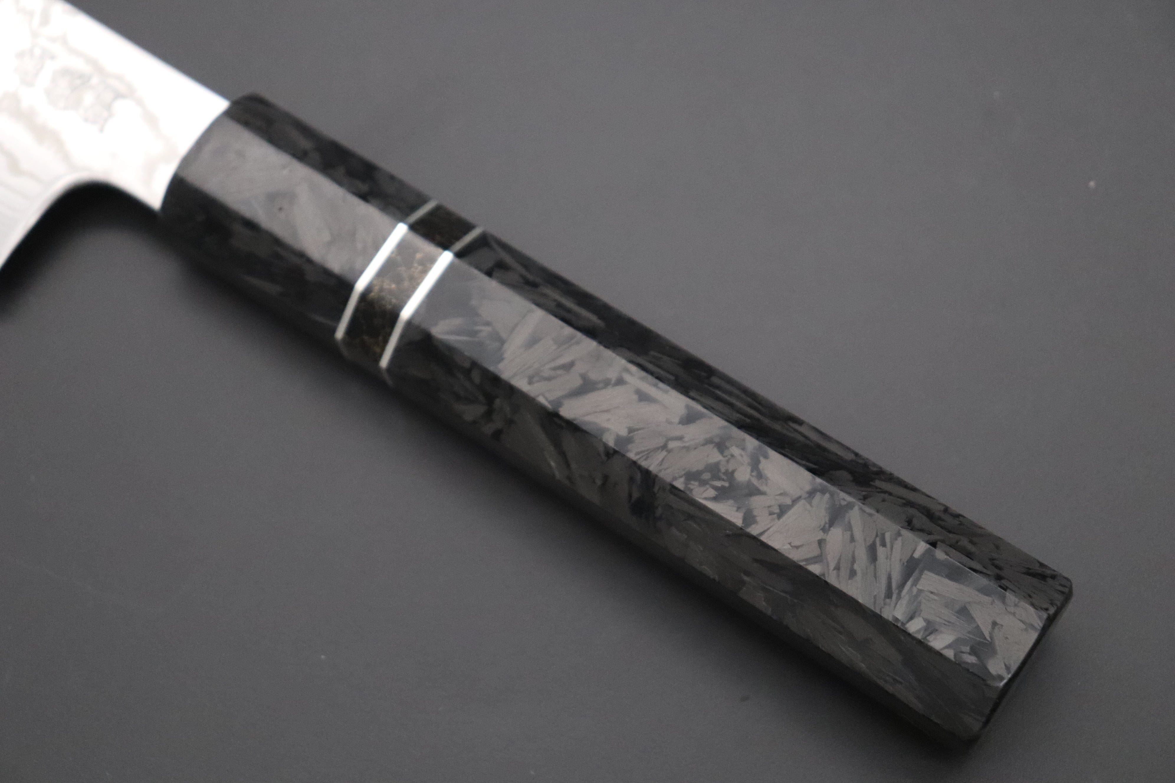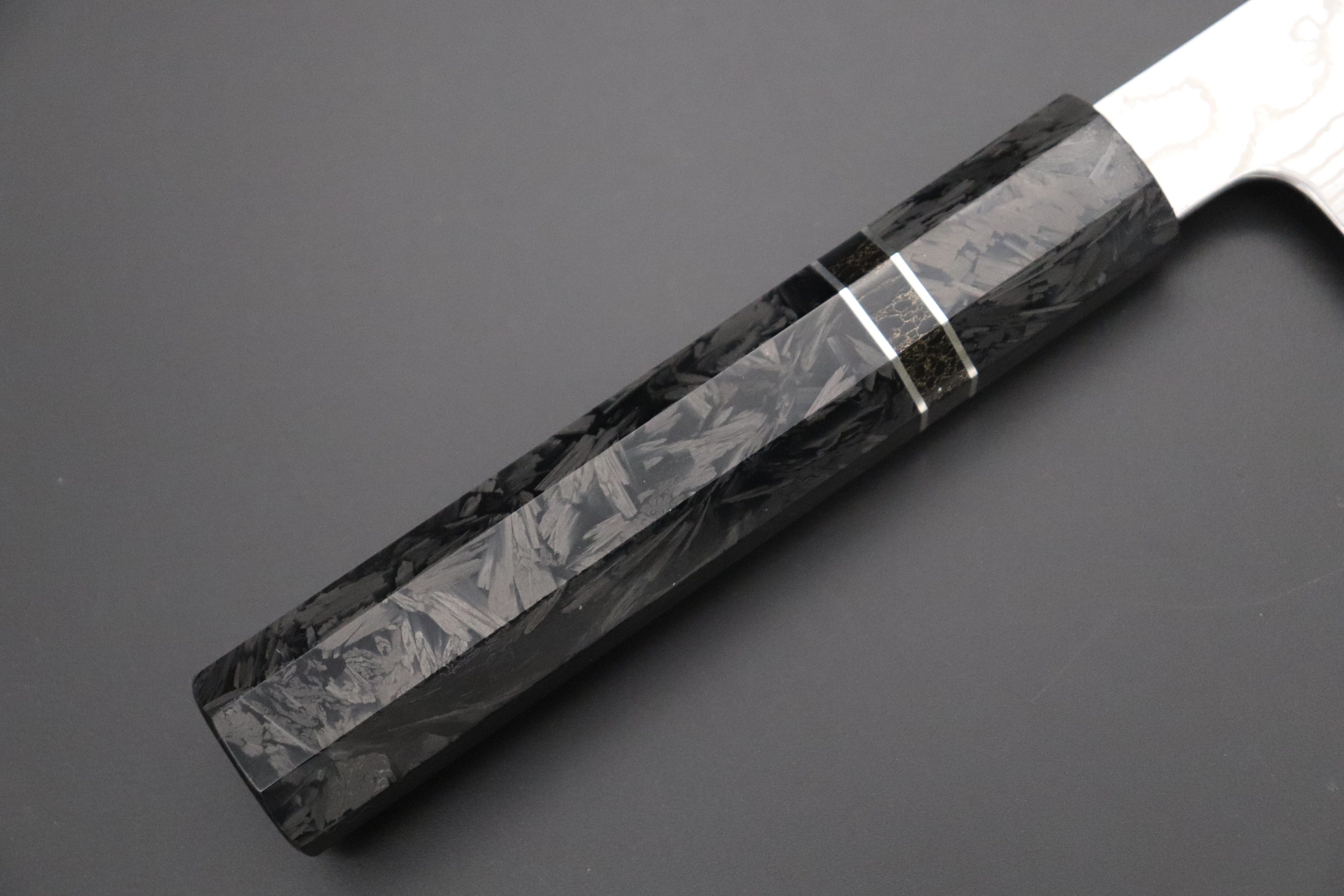 This Custom Limited Edition Sukenari HAP-40 Nickel Damascus Wa Santoku knife is fitted with a Innovative Octagonal Carbon Fiber Handle with Composite Black Color Turquoise Gemstone Ring and Nickel Silver Spacers. For safekeeping, this knife comes with a matching Black Lacquered wood Saya (Sheath) with a black pakkawood Saya pin.