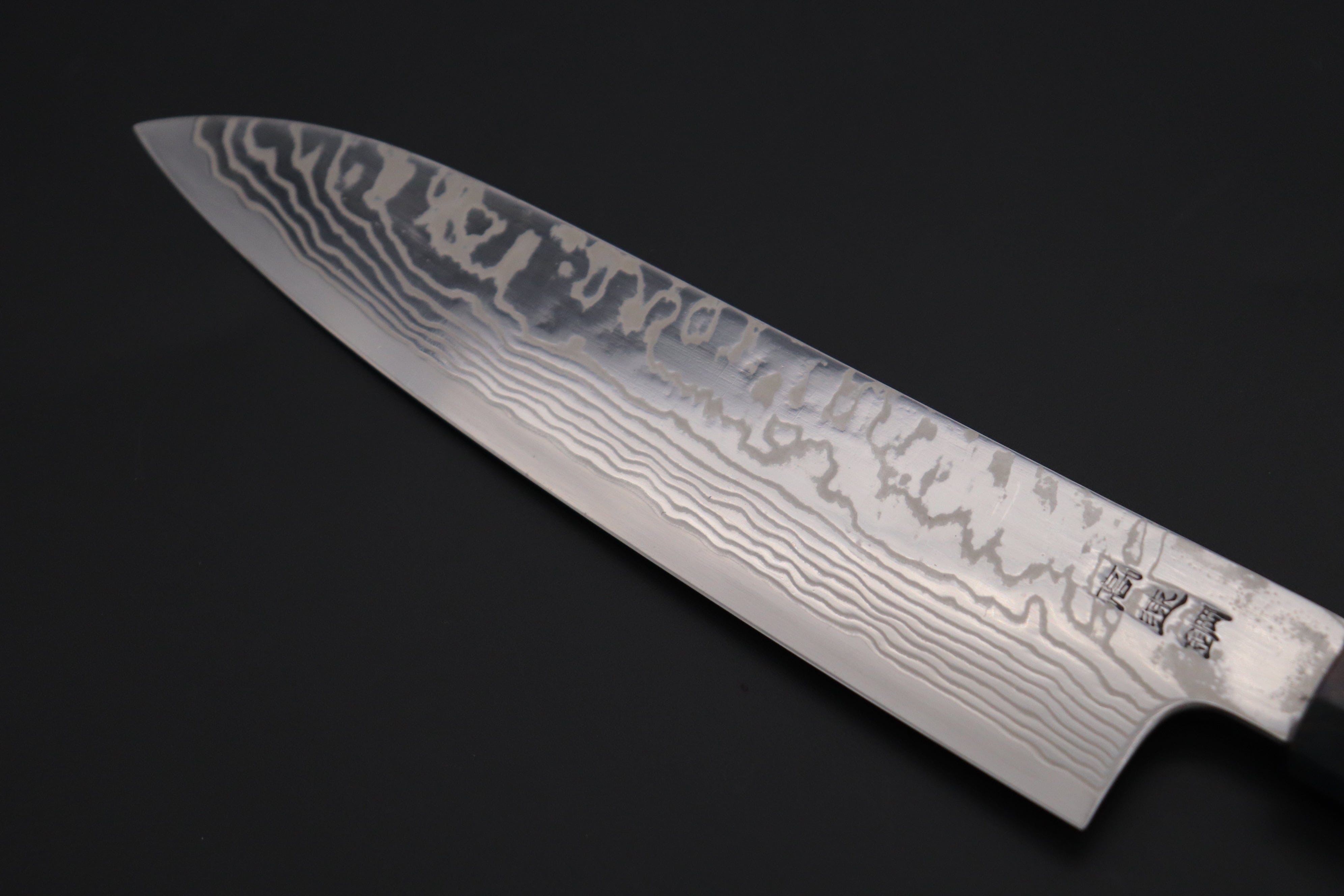 The HAP-40 core blade steel (HRc. 68) is forge-welded with Stainless Damascus steel cladding, which is made with alternating layers of Nickel Steel and Stainless Steel. The blade is beautifully mirror polished and finished so that the white color of Nickel Steel layers vividly contrast with the glossy silver color of the Stainless Steel layers.