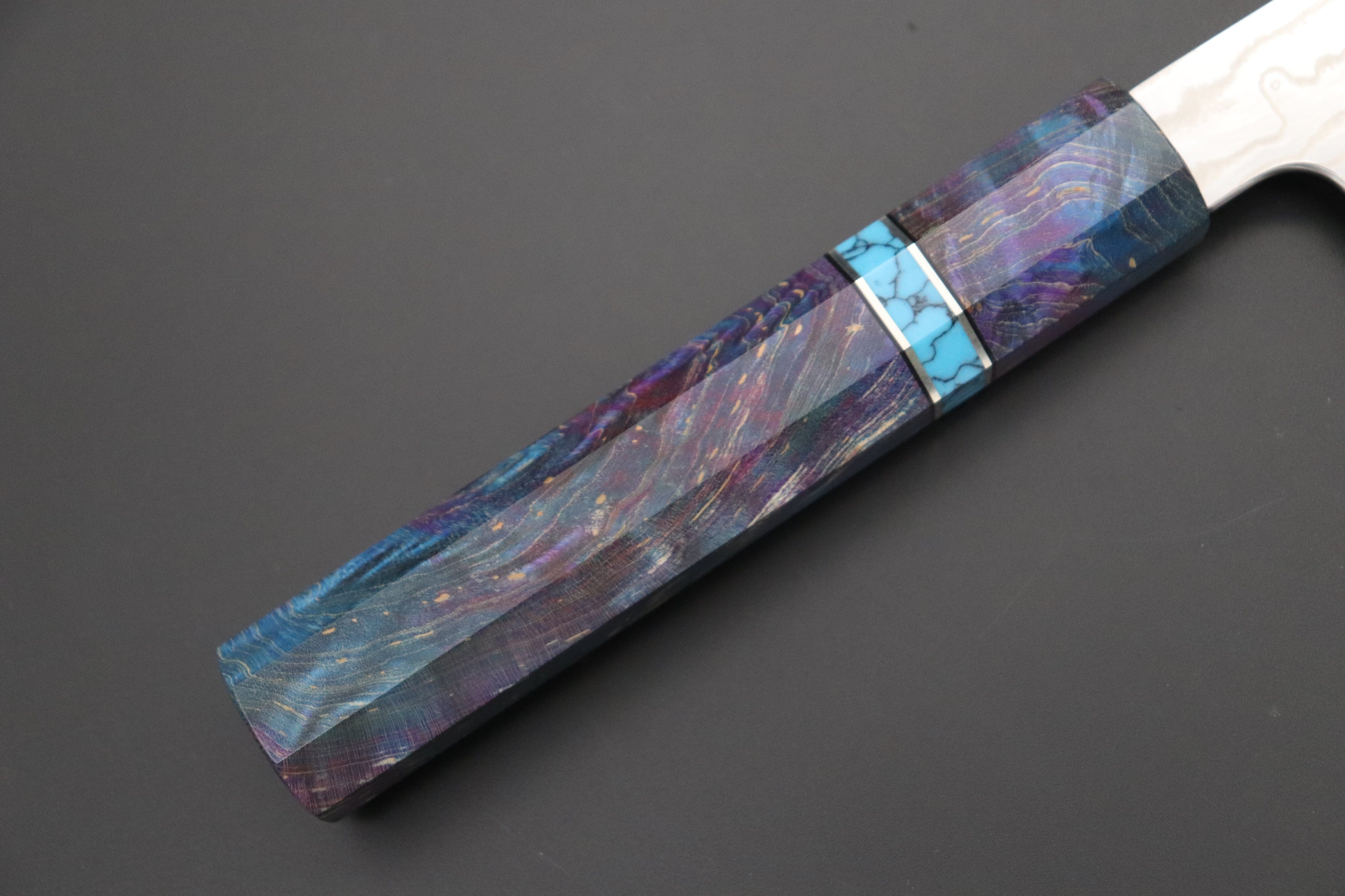 This Custom Limited Edition Sukenari HAP-40 Nickel Damascus Wa Santoku knife is fitted with a Innovative Sunset Purple Color Octagonal Stabilized Maple Wood Handle with Composite Turquoise Gemstone Ring and Nickel Silver Spacers. For safekeeping, this knife comes with a matching Black Lacquered wood Saya (Sheath) with a black pakkawood Saya pin.