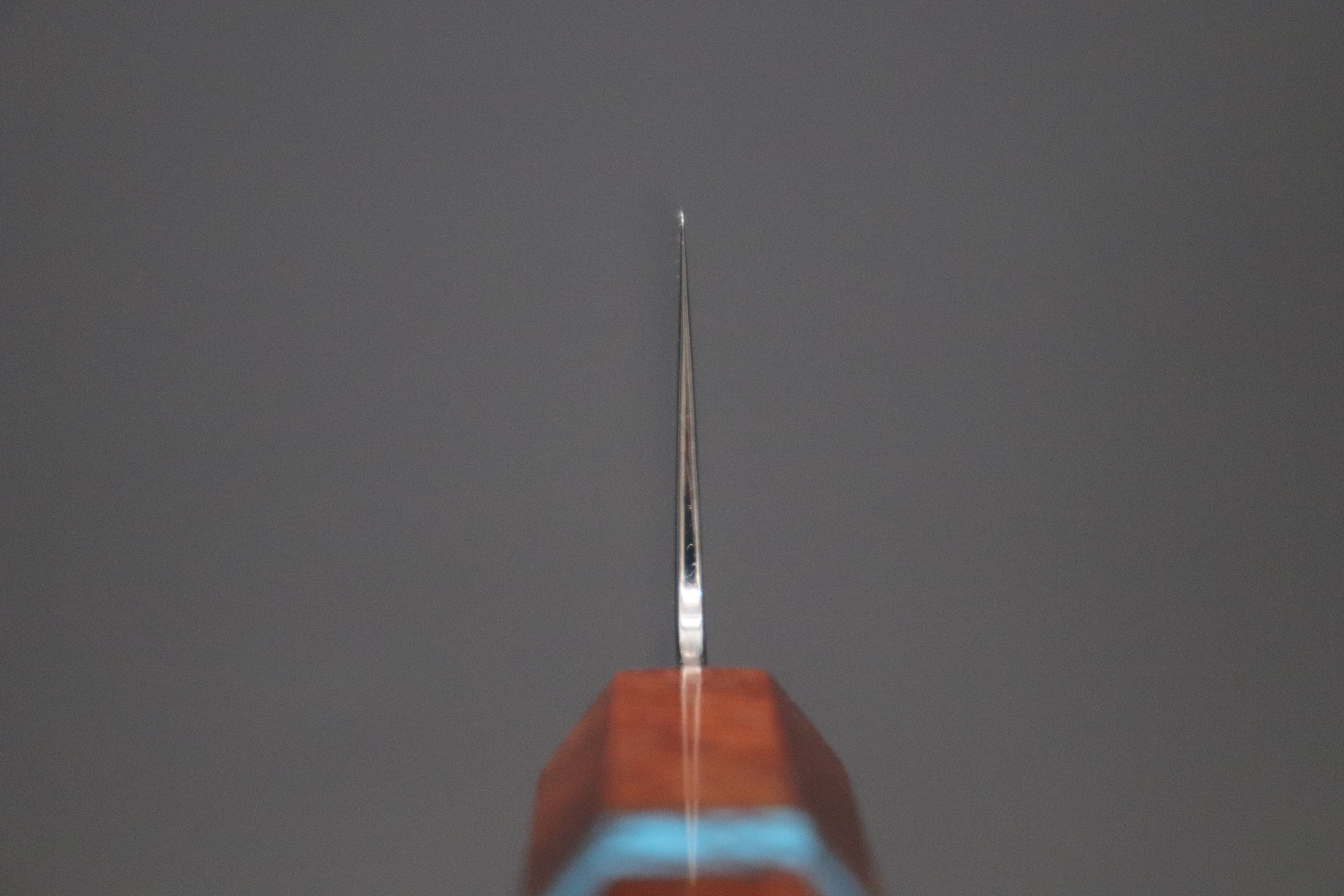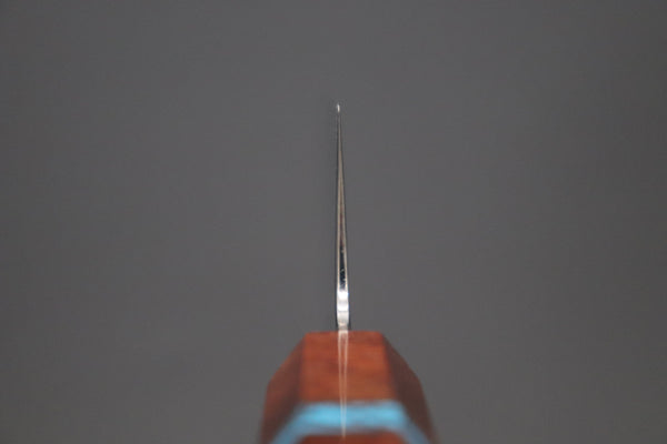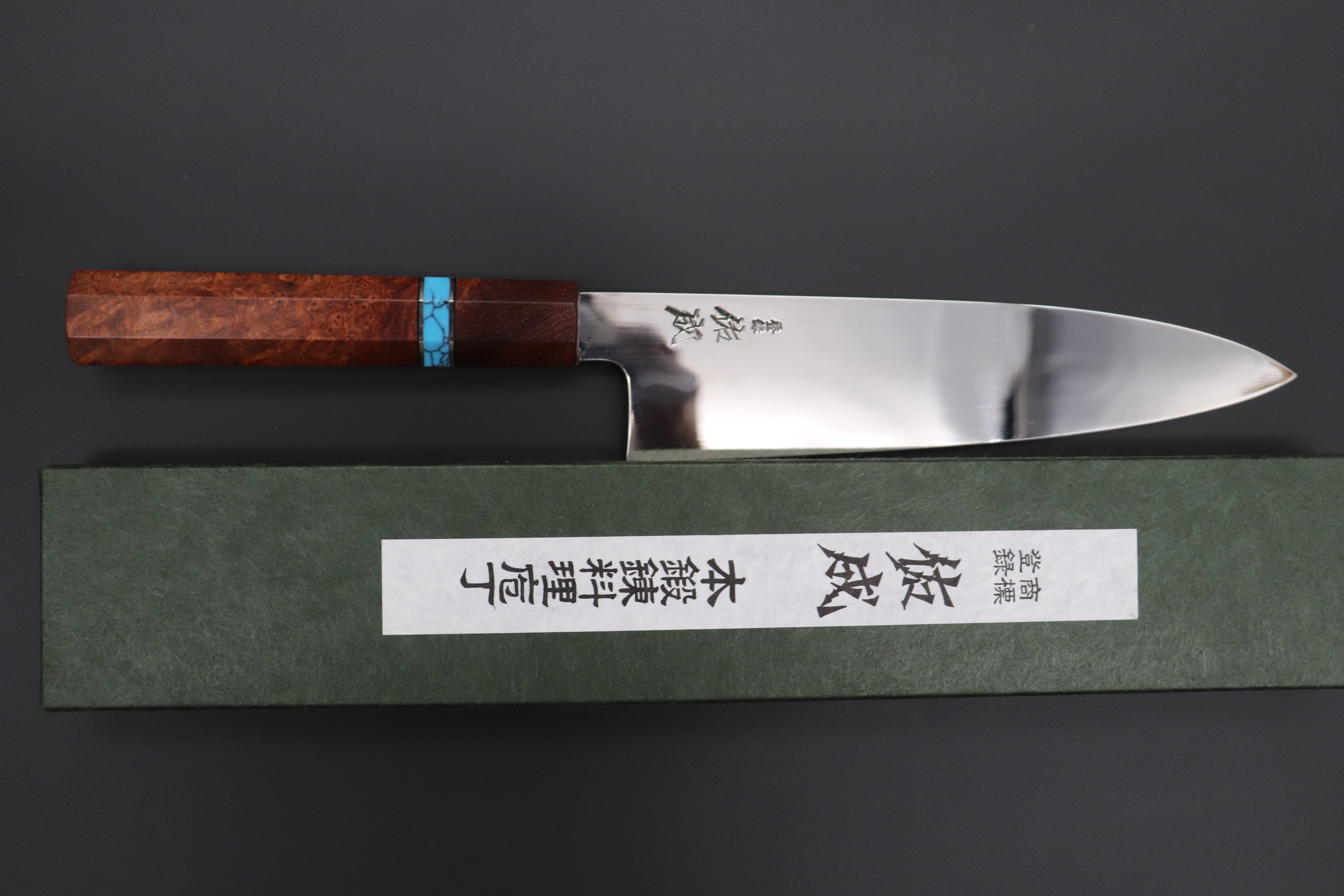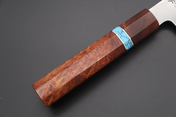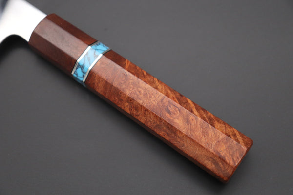 Each one of Sukenari’s Shirogami #2 Honyaki knives is beautifully mirror-polished and has an impressive wavy Hamon pattern. The blades are very thin just behind the cutting edge and have a rounded finger choil that is very comfortable. This Custom Limited Edition Sukenari Honyaki Wa Gyuto Knife is fitted with a Innovative Octagonal Bubinga Burl Wood Handle with Composite Turquoise Gemstone Ring and Nickel Silver Spacers. For safekeeping, this knife comes with a matching Black Lacquered wood Saya (Sheath) with a black pakkawood Saya pin.