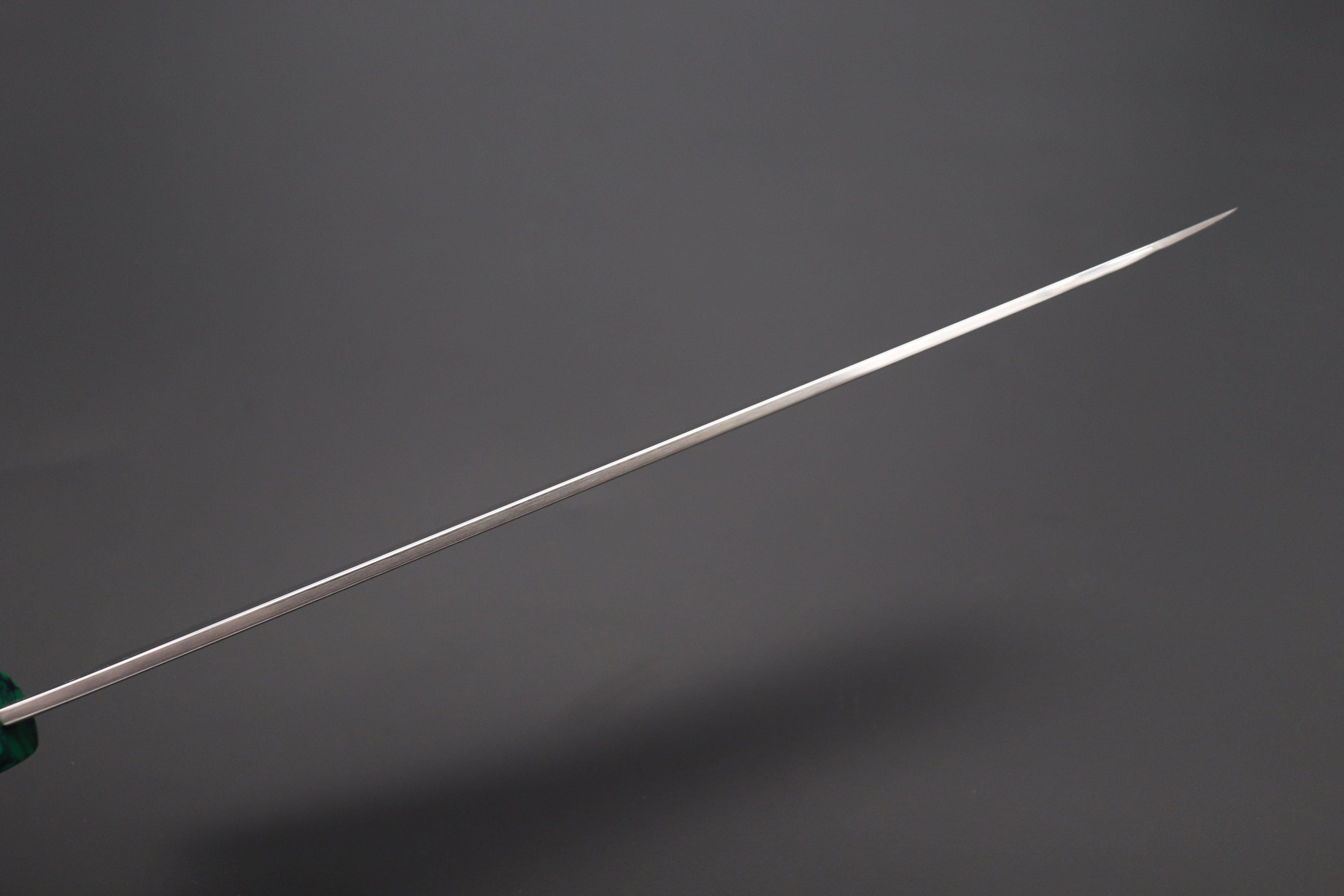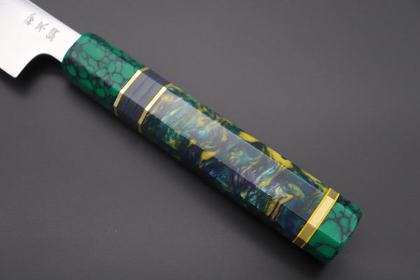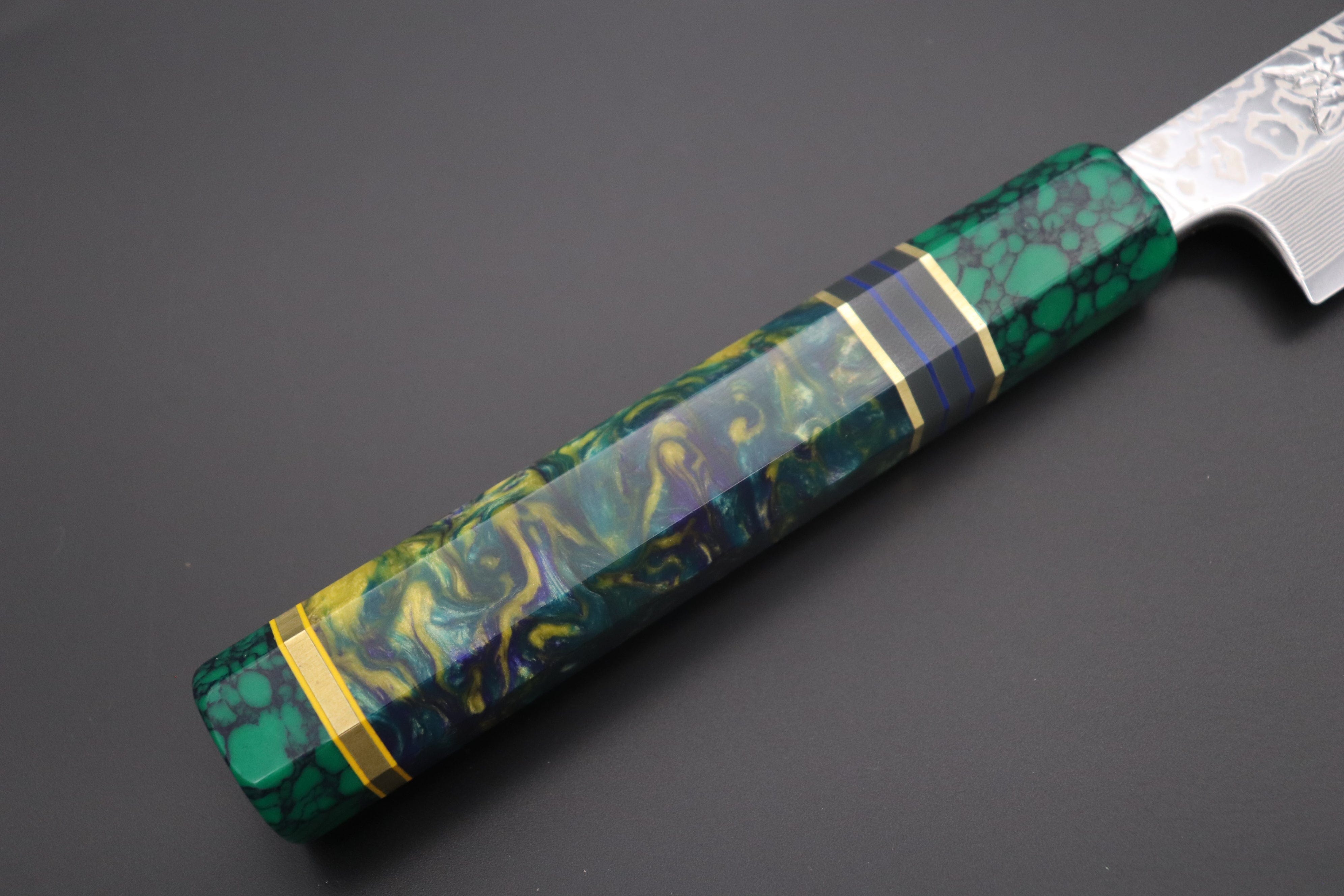 We decided to fit this new, futuristic generation of high-end SRS-13 Nickel Damascus Kiritsuke Yanagiba knife with Custom Handmade Octagonal Handle (Resin body, Composite Stone ferrule and endcap, G10 collar with Brass and Blue and Yellow Liner spacers).