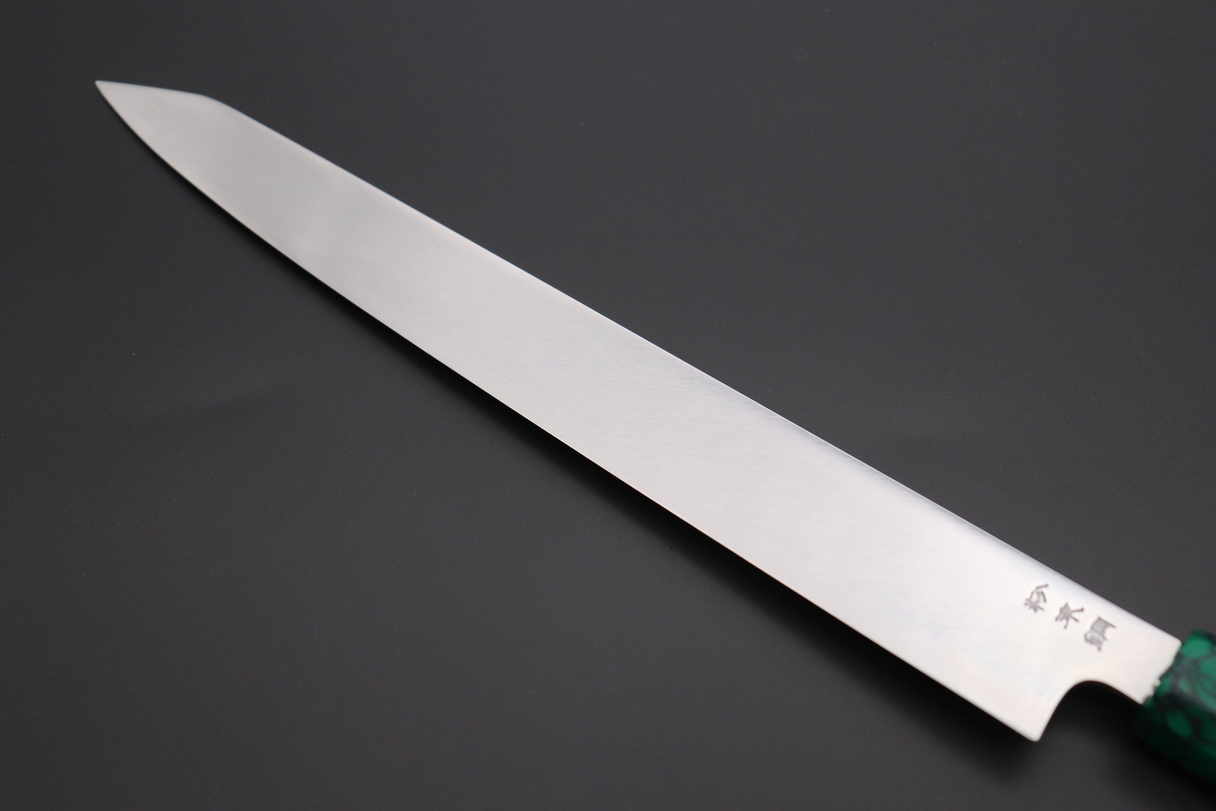 The Kirisuke Yanagiba has a very similar blade profile to the ‘regular’ Yanagiba, but it has what is commonly known as a 'reverse tanto' tip, or ‘clipped point’, which is very useful for precision cutting. Apart from this difference, the Kirisuke Yanagiba functions in the same way as the ‘plain' Yanagiba or the Takohiki.