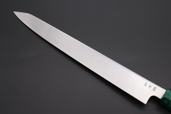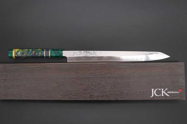 This Sukenari SRS-13 Nickel Damascus Kiritsuke Yanagiba 300mm is a Custom Limited Edition, one-of-a-kind knife.