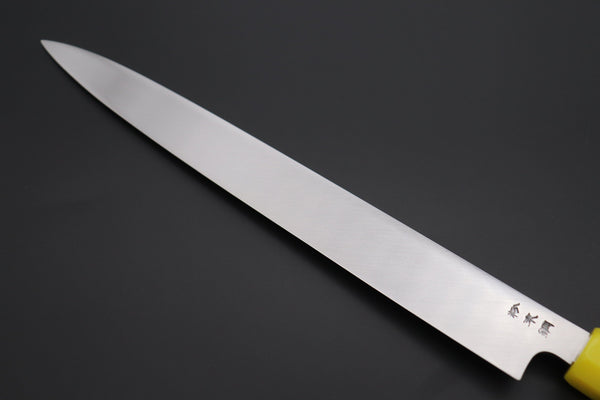 Yanagiba knives are primarily used to slice boneless fish fillets for Sashimi and Sushi dishes, but they can also be used to fillet small to medium-sized fish and are often used for skinning fish. The narrow blade and relatively acute edge angle of the Yanagiba are features which greatly reduce the effort required to cut through ingredients. As with the Sujihiki, the long blade allows the fish to be cut in one single drawing motion, from heel to tip.
