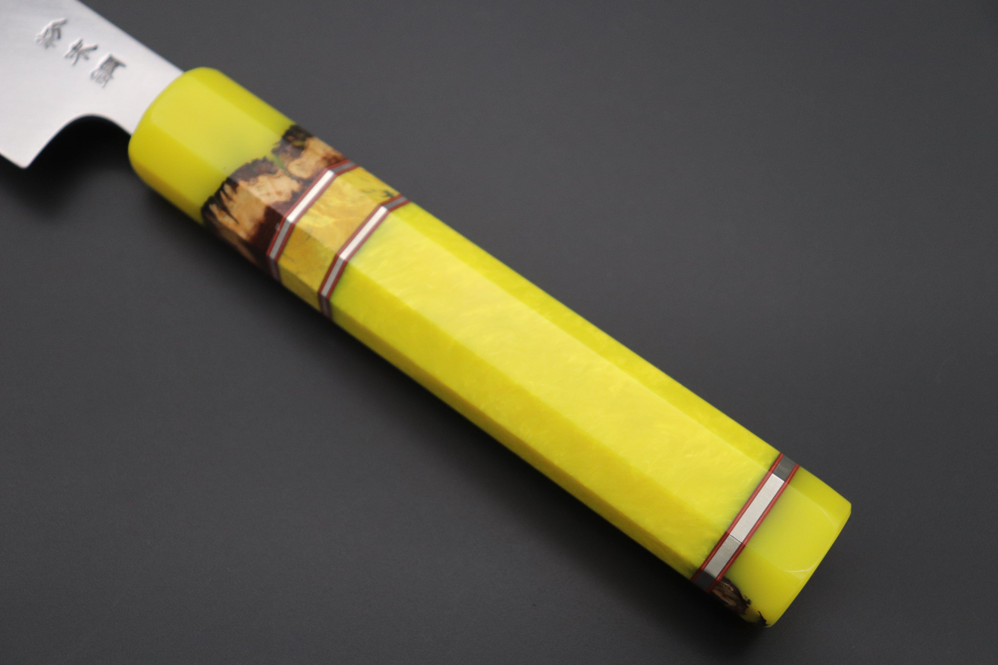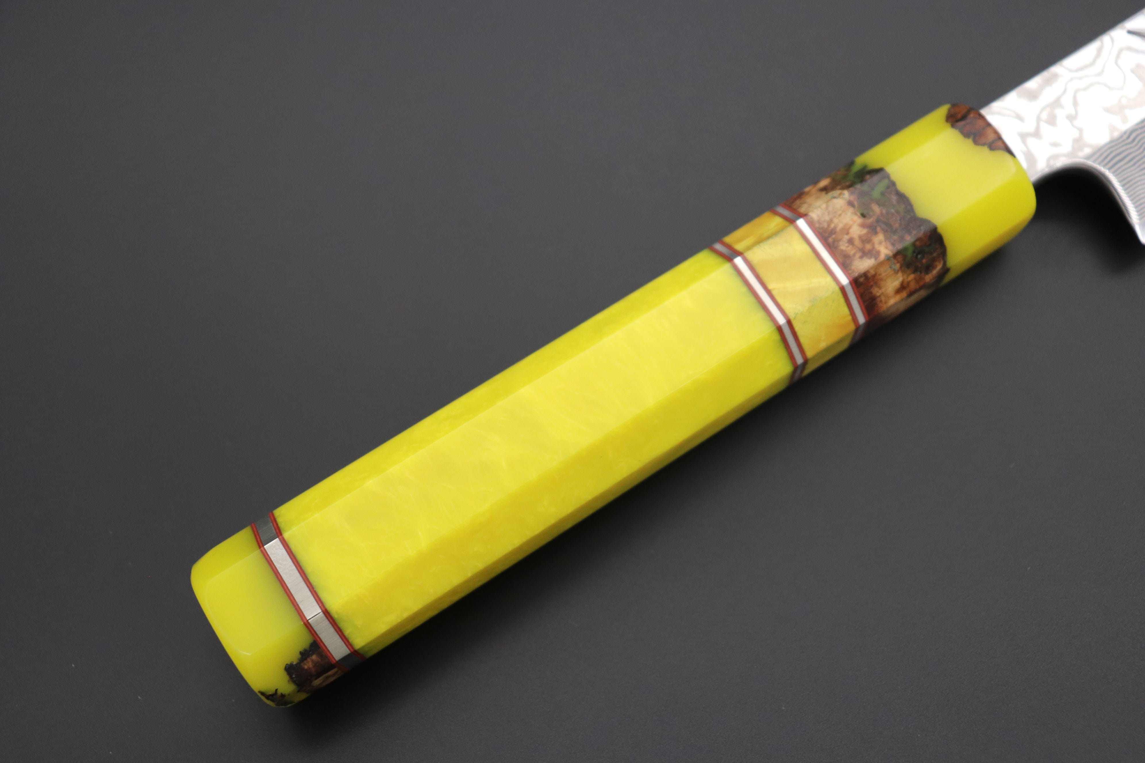We decided to fit this new, futuristic generation of high-end SRS-13 Nickel Damascus Yanagiba knife with Custom Handmade Octagonal Handle (Resin body, Resin Wood Hybrid ferrule and endcap, Stabilized and Dyed Maple Burl collar with Nickel Silver and Red Liner spacers). For safekeeping, this knife comes with a matching Black Lacquered Wooden Saya (Sheath) with a black pakkawood Saya pin.