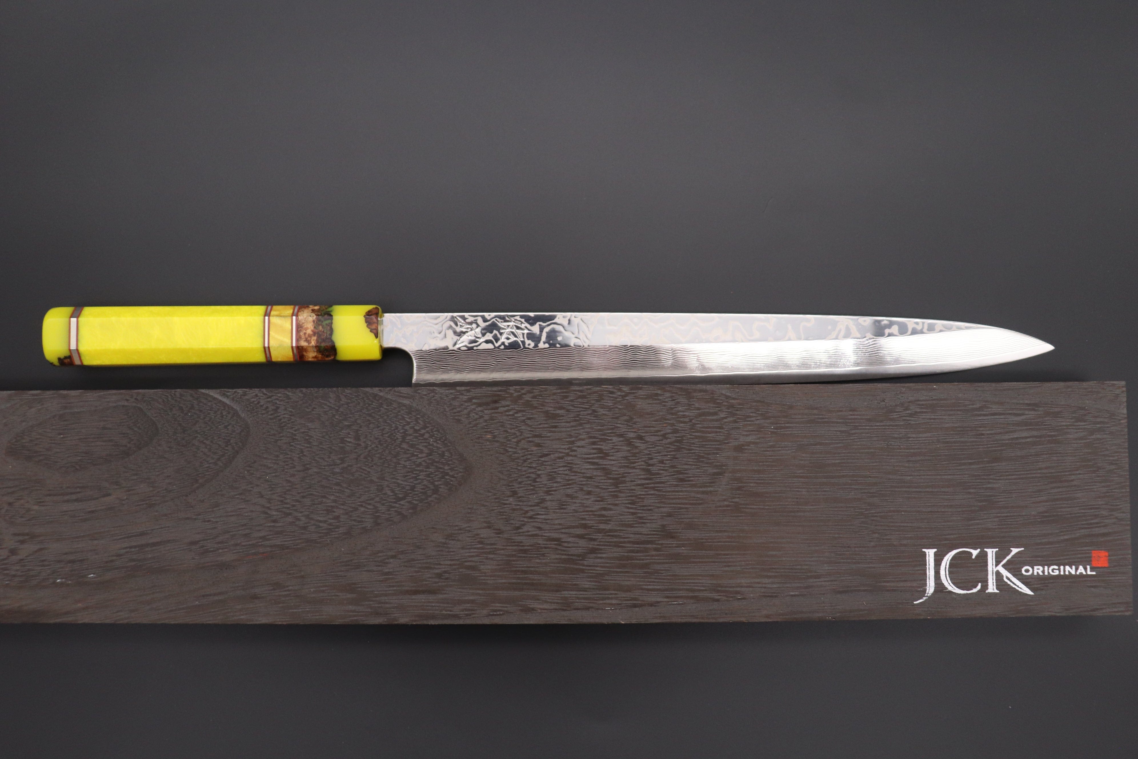 This Sukenari SRS-13 Nickel Damascus Yanagiba 300mm is a Custom Limited Edition, one-of-a-kind knife.