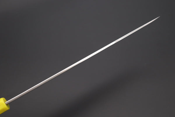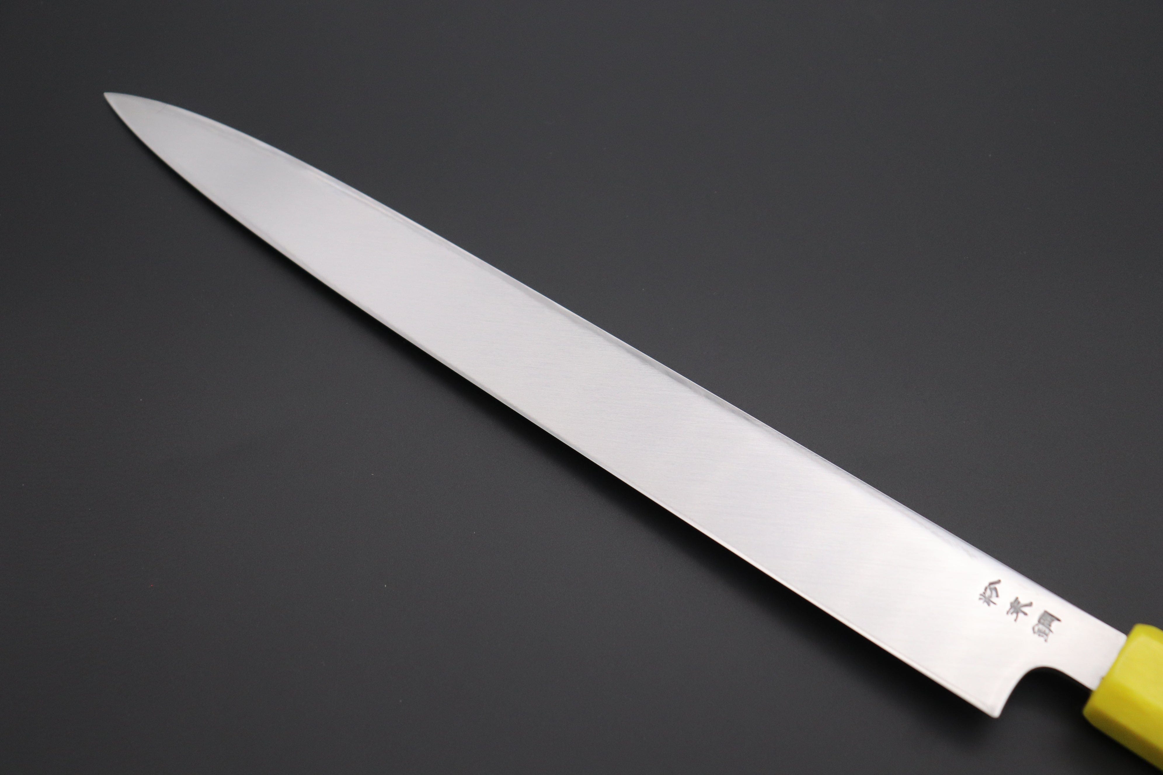 Yanagiba knives are primarily used to slice boneless fish fillets for Sashimi and Sushi dishes, but they can also be used to fillet small to medium-sized fish and are often used for skinning fish. The narrow blade and relatively acute edge angle of the Yanagiba are features which greatly reduce the effort required to cut through ingredients. As with the Sujihiki, the long blade allows the fish to be cut in one single drawing motion, from heel to tip.