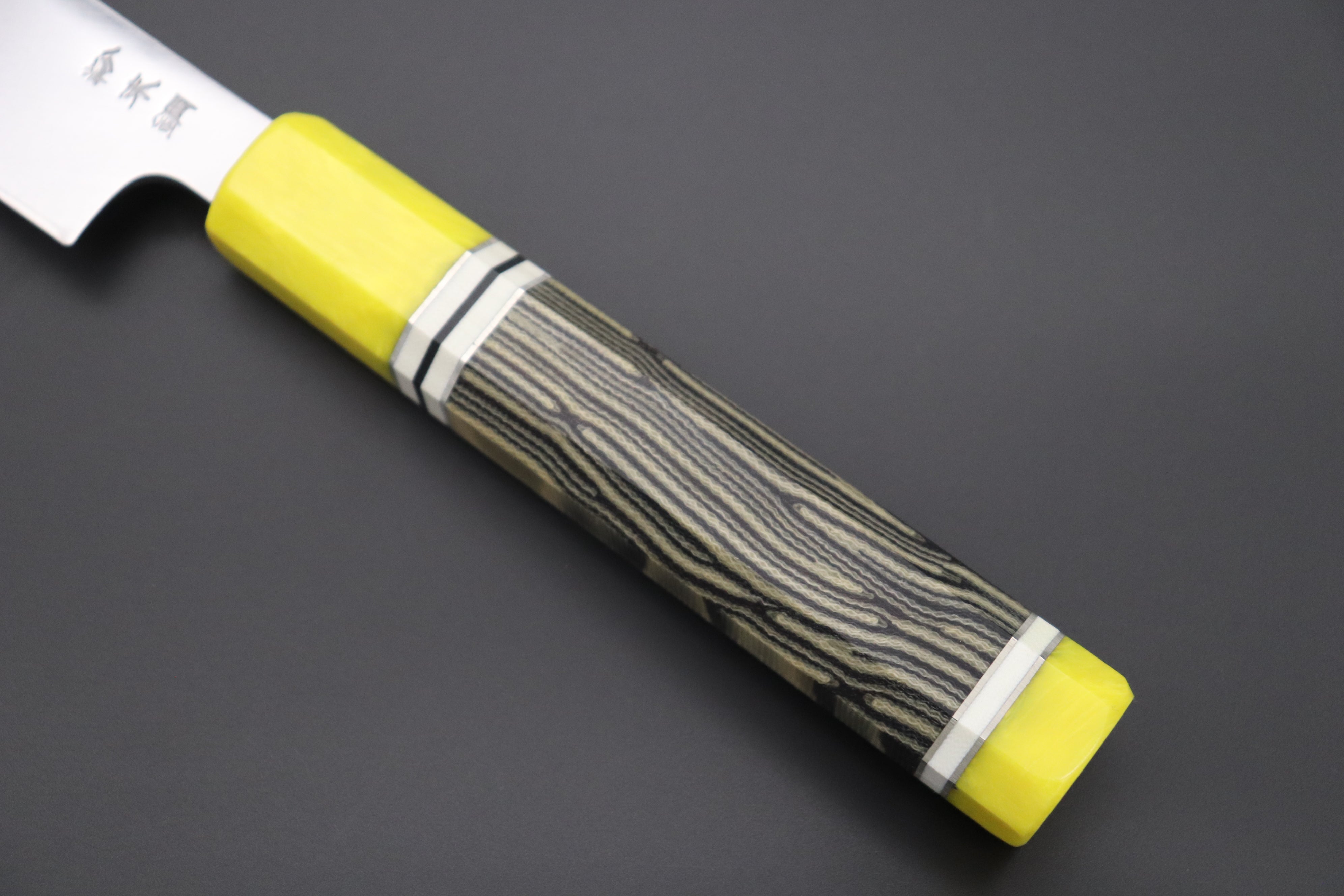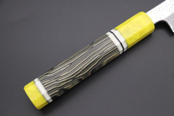 We decided to fit this new, futuristic generation of high-end SRS-13 Nickel Damascus Yanagiba knife with Custom Handmade Octagonal Handle (G-Carta body (A canvas micarta), Resin ferrule and endcap, G10 collar, with Nickle Silver, G10 and Black Liner spacers). For safekeeping, this knife comes with a matching Black Lacquered Wooden Saya (Sheath) with a black pakkawood Saya pin.