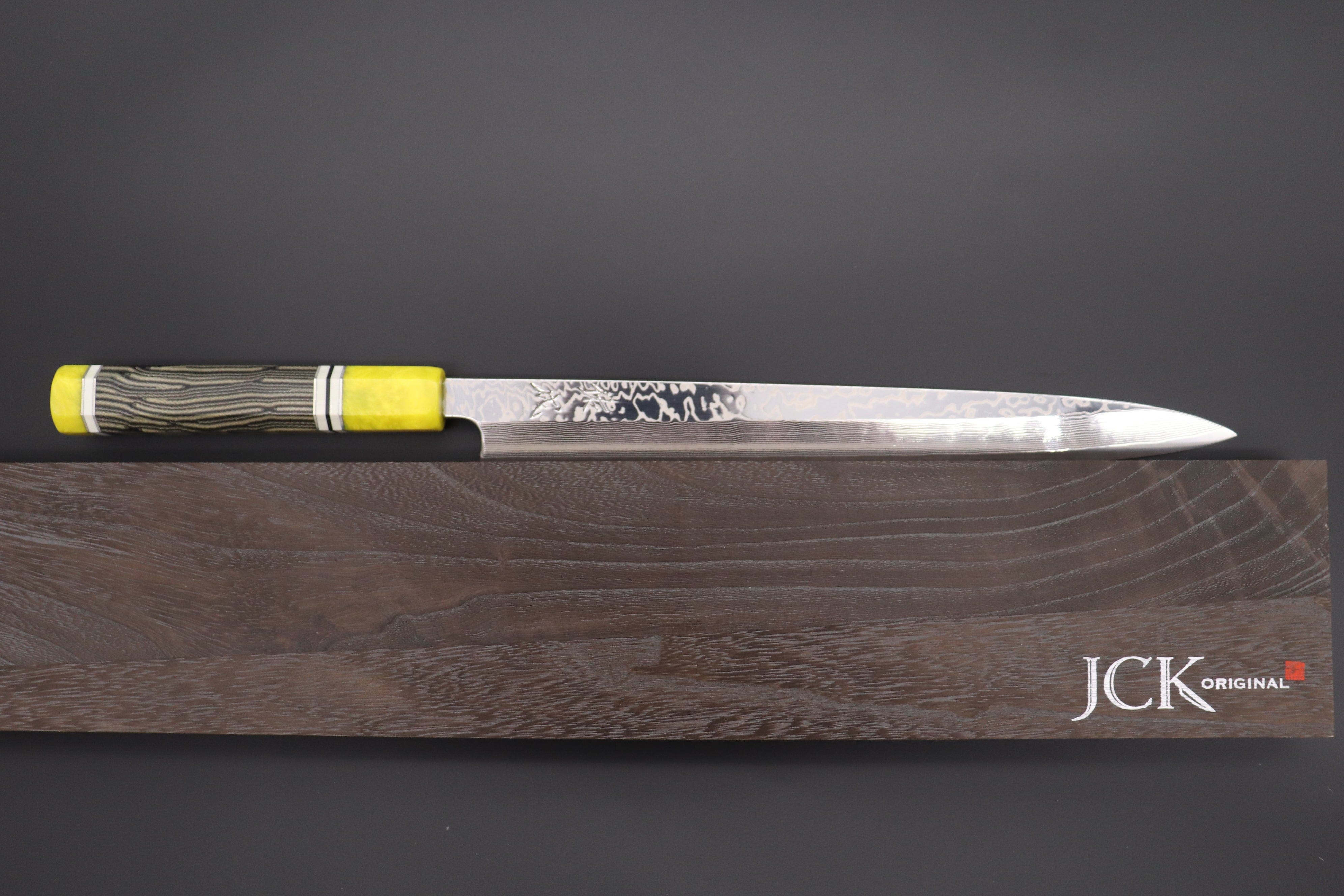 This Sukenari SRS-13 Nickel Damascus Yanagiba 300mm is a Custom Limited Edition, one-of-a-kind knife.