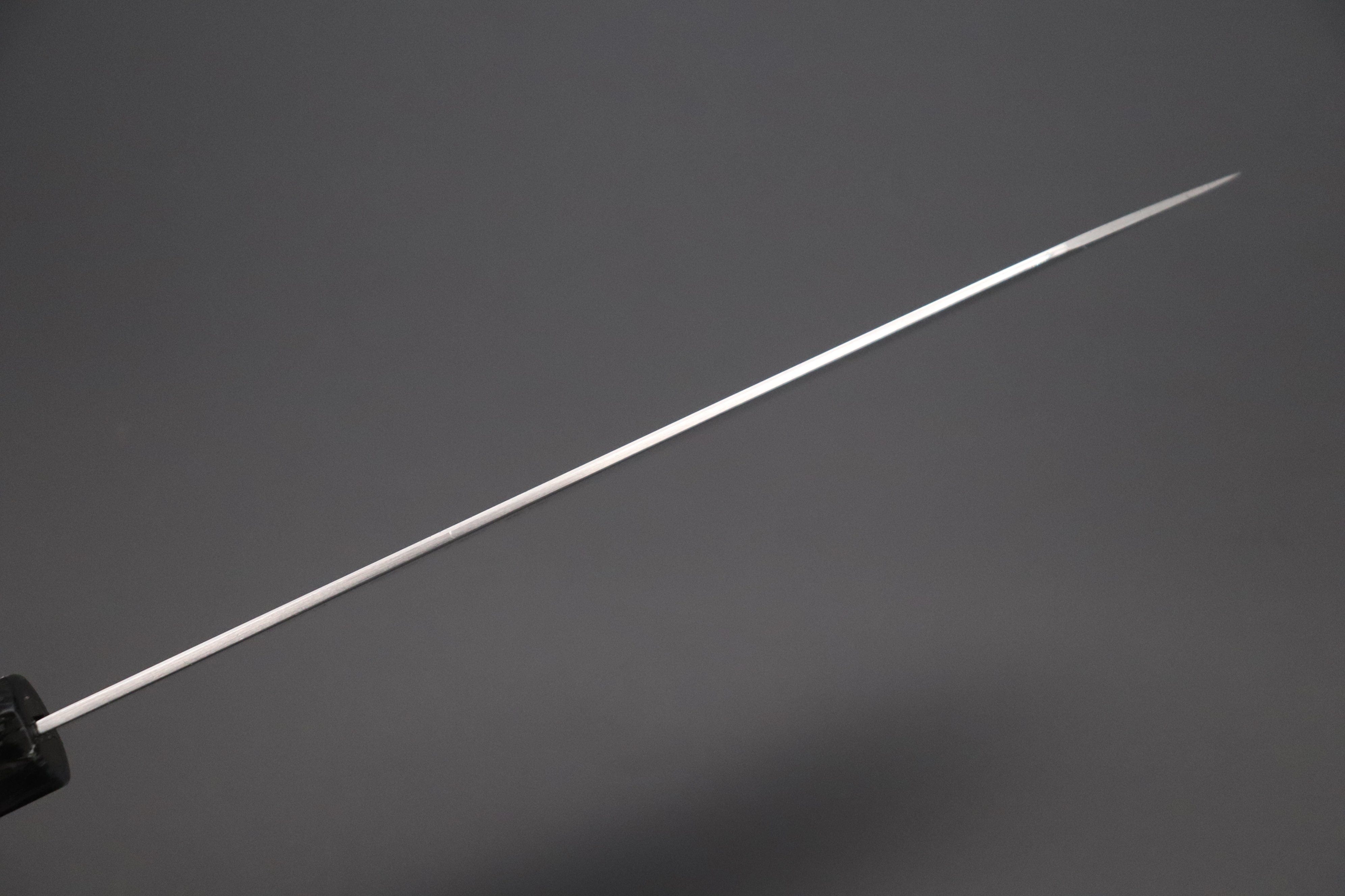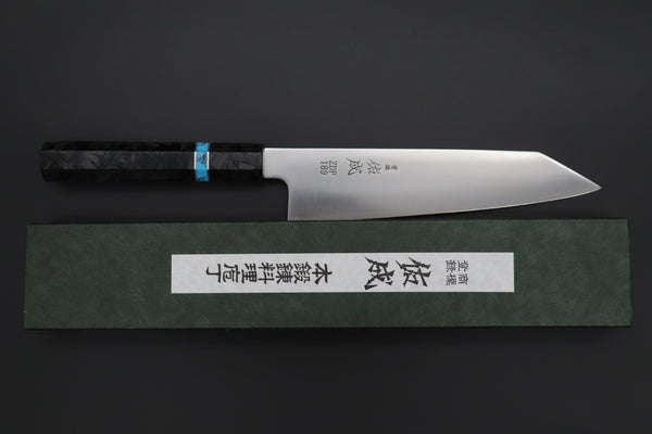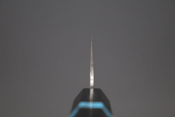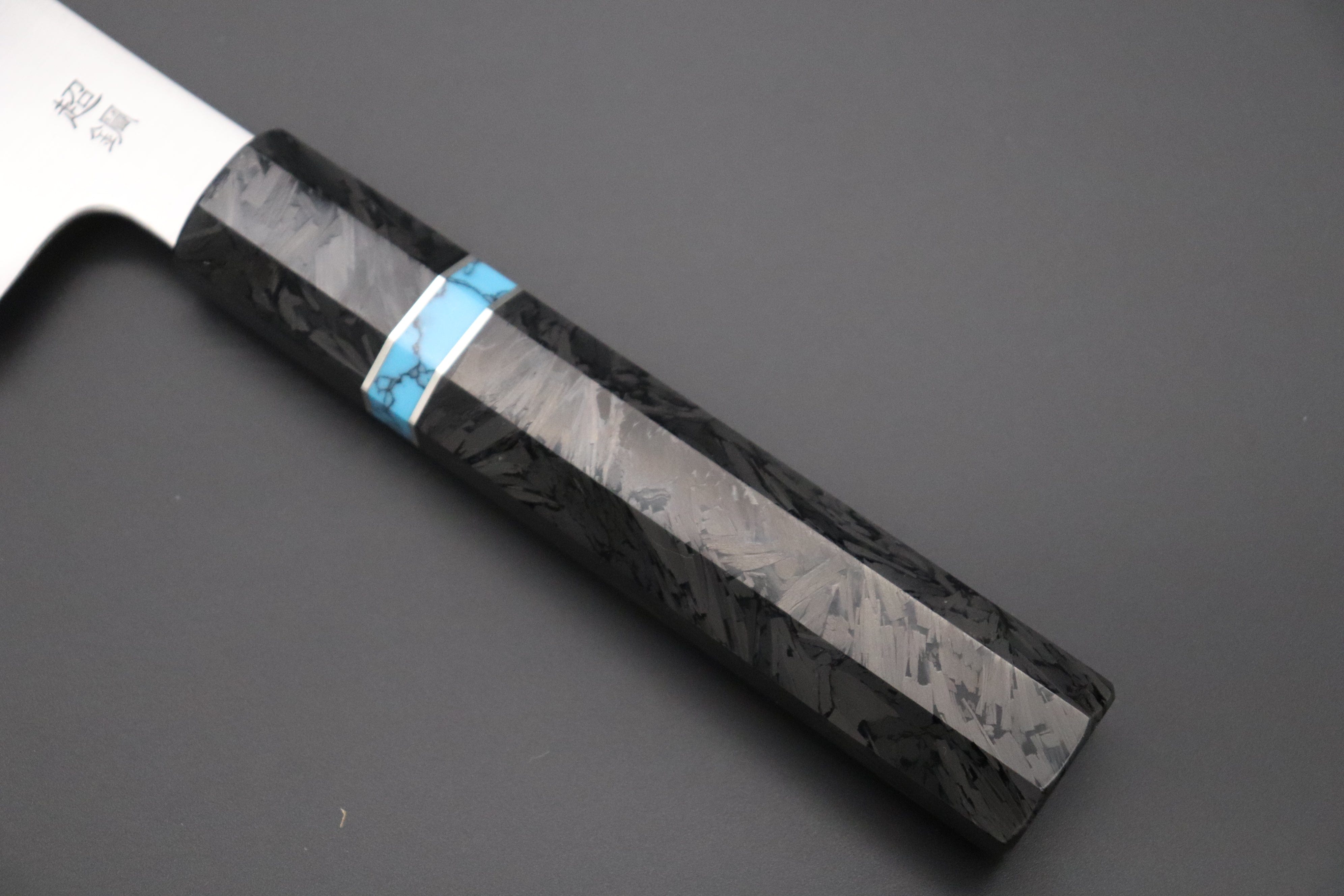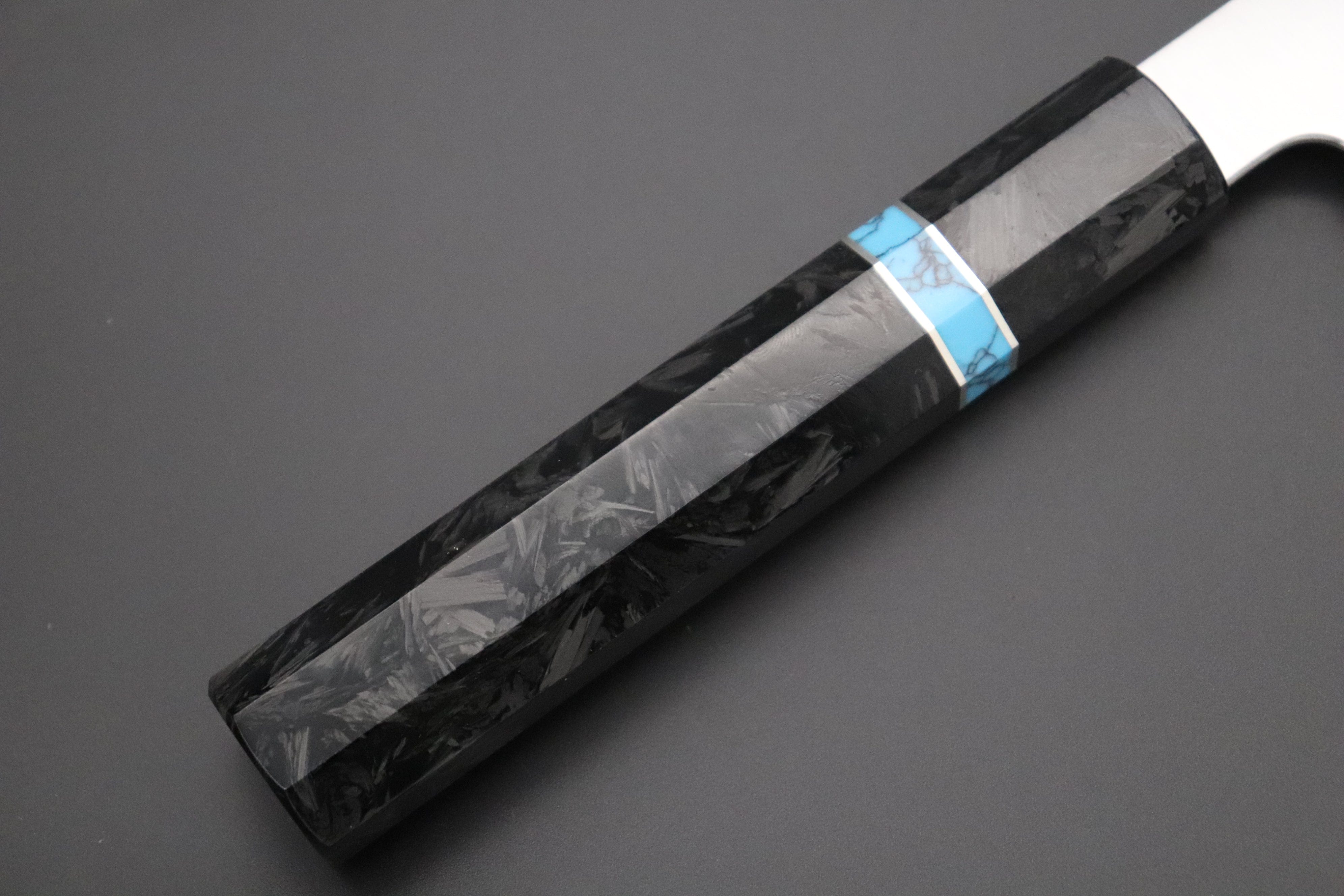 This Custom Limited Edition Sukenari ZDP-189 Clad Kiritsuke 210mm knife is fitted with a beautiful and innovative Octagonal Carbon Fiber Handle with Composite Turquoise Gemstone Ring and Nickel Silver Spacers. A matching Handcrafted Magnolia wood Saya (Sheath) with a black pakkawood Saya pin is also included with the knife.