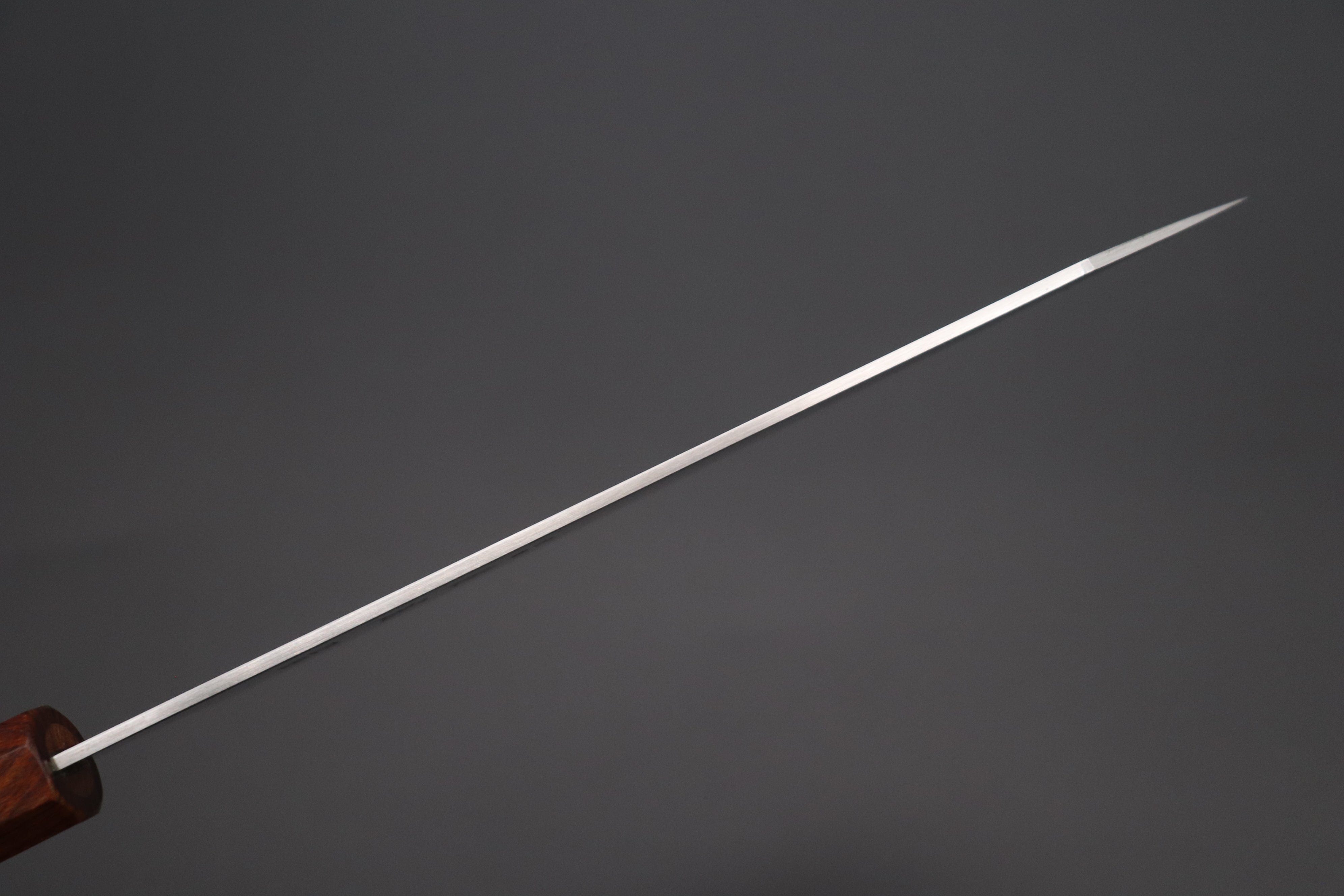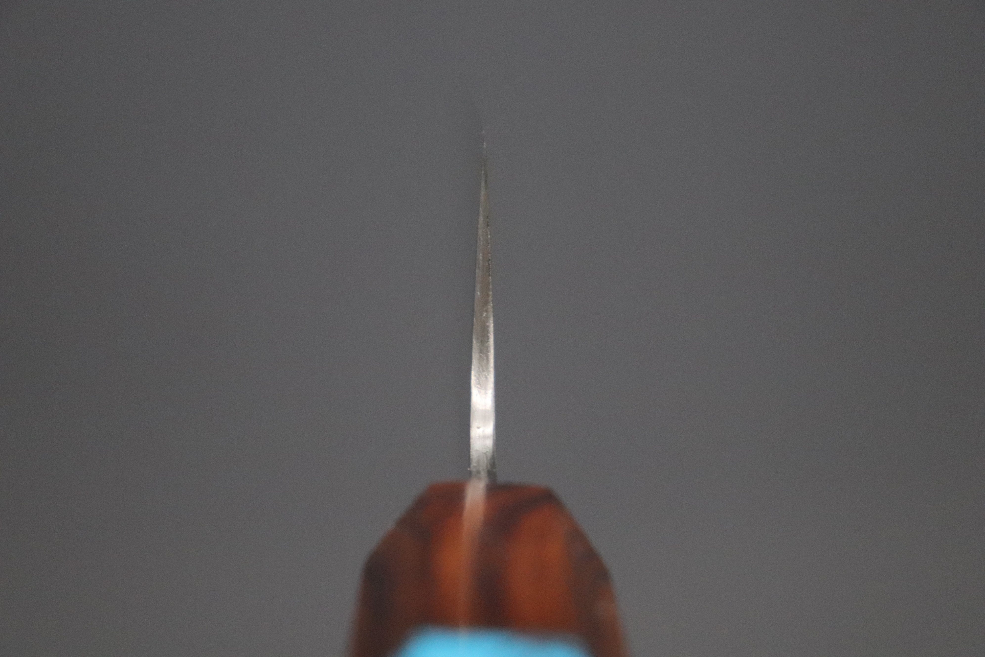 This Custom Limited Edition Sukenari ZDP-189 Clad Kiritsuke 210mm knife is fitted with a beautiful and innovative Octagonal Desert Ironwood Handle with Composite Turquoise Gemstone Ring and Nickel Silver Spacers. A matching Handcrafted Magnolia wood Saya (Sheath) with a black pakkawood Saya pin is also included with the knife.