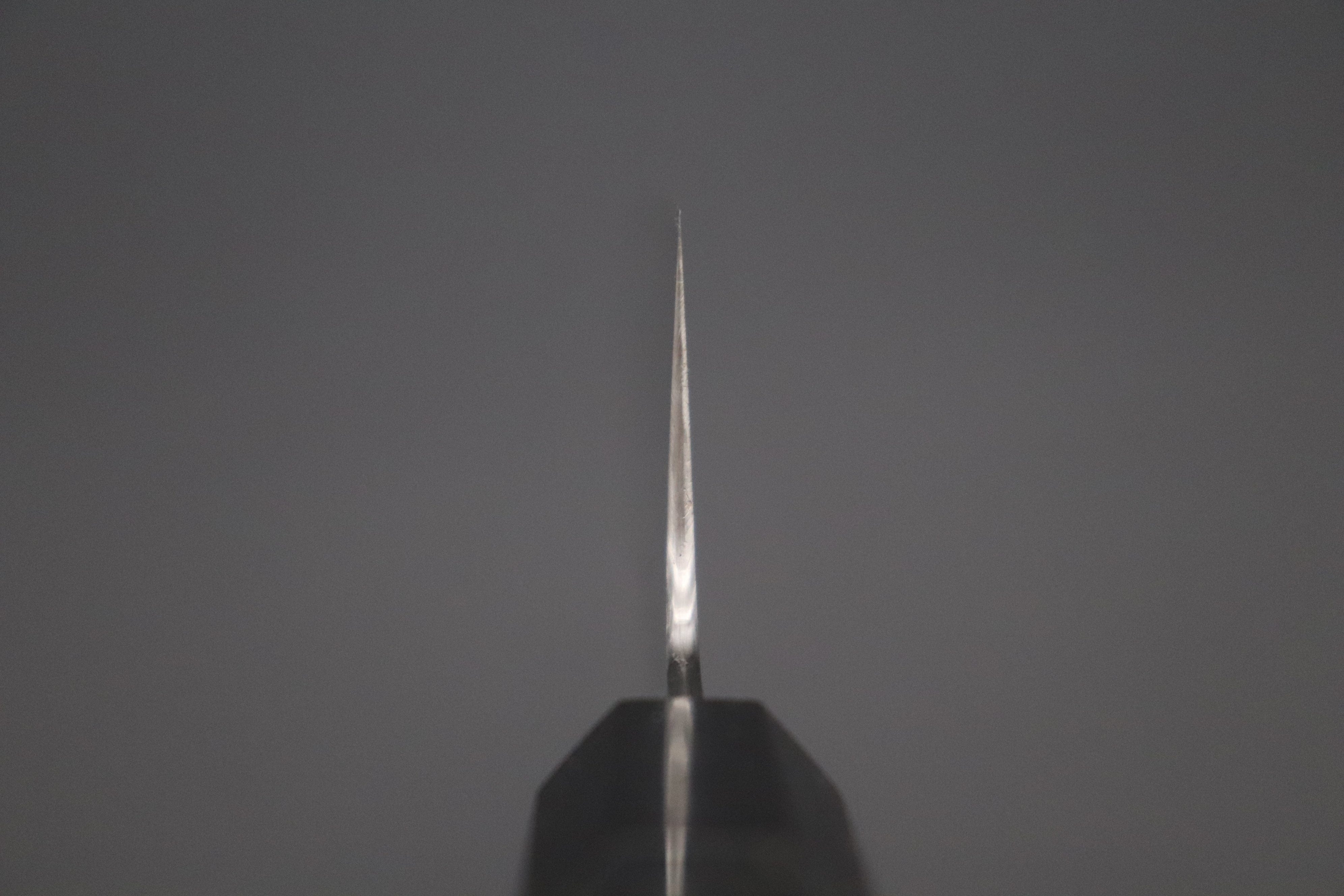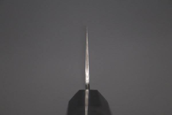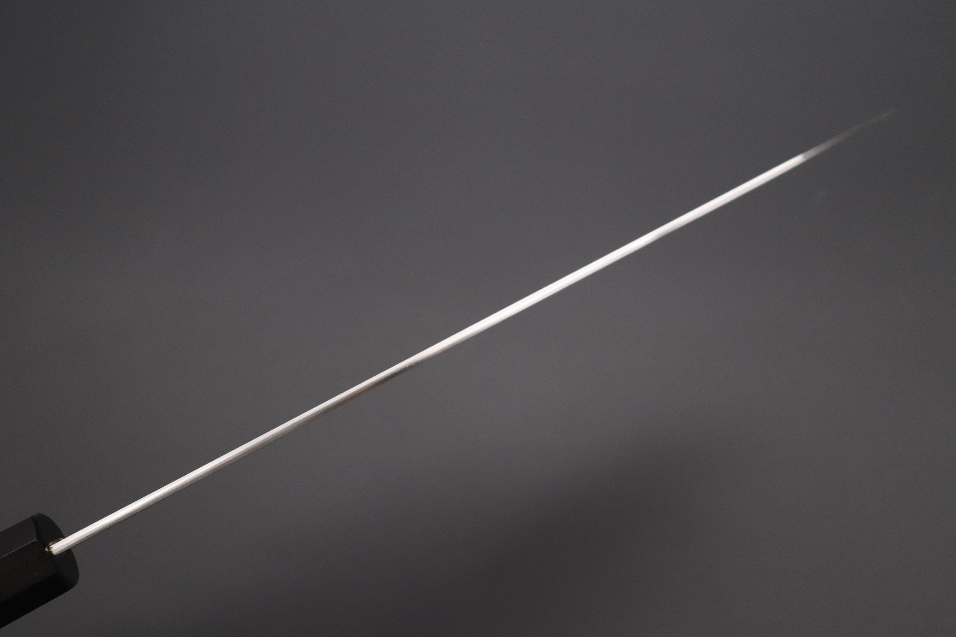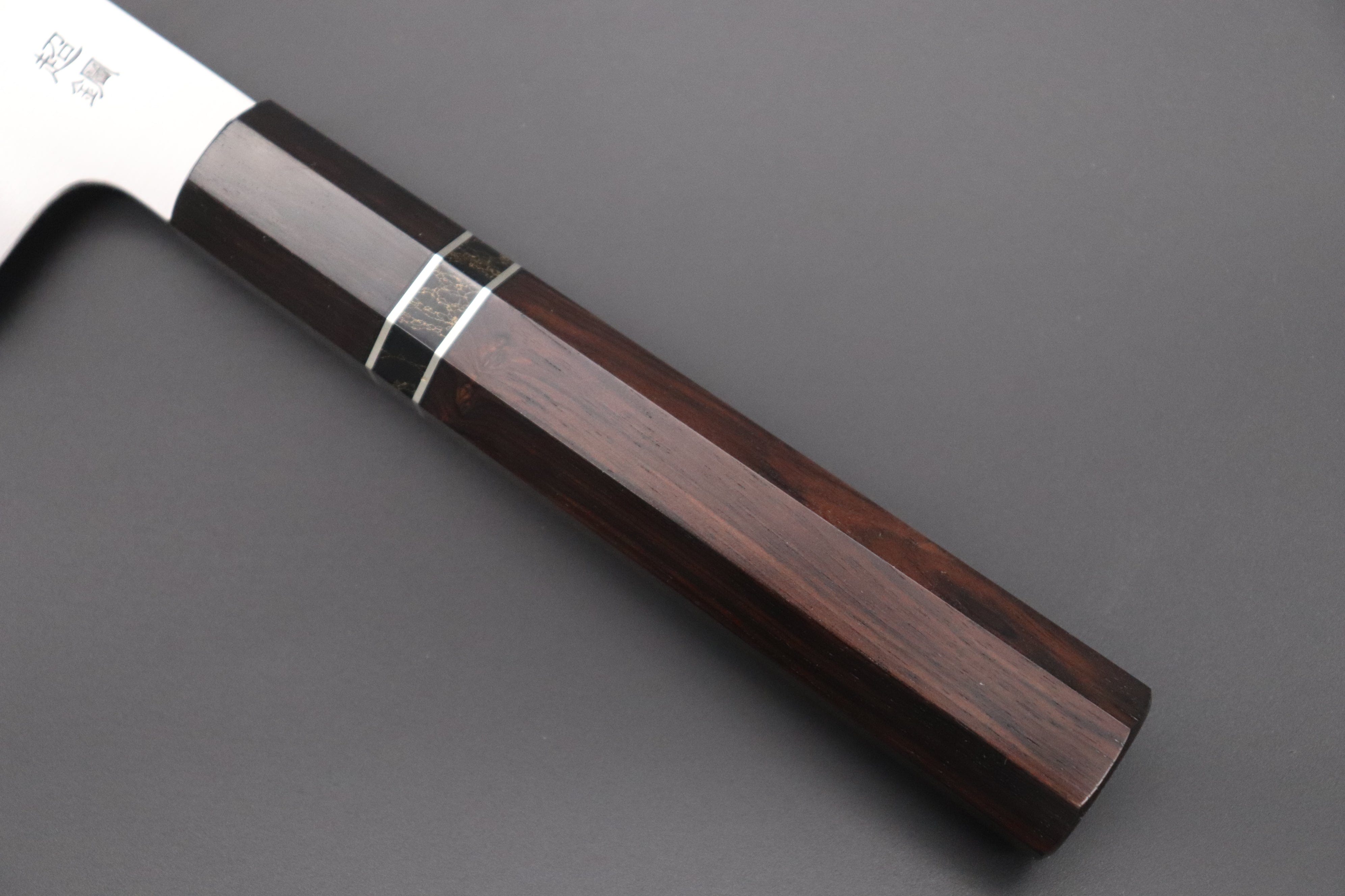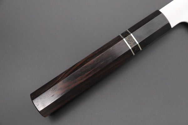 This Custom Limited Edition Sukenari ZDP-189 Clad Kiritsuke 240mm knife is fitted with a beautiful and innovative Octagonal Ebonywood Handle with Composite Black Turquoise Gemstone Ring and Nickel Silver Spacers. A matching handcrafted Magnolia wood Saya (Sheath) with a black pakkawood Saya pin is also included with the knife.