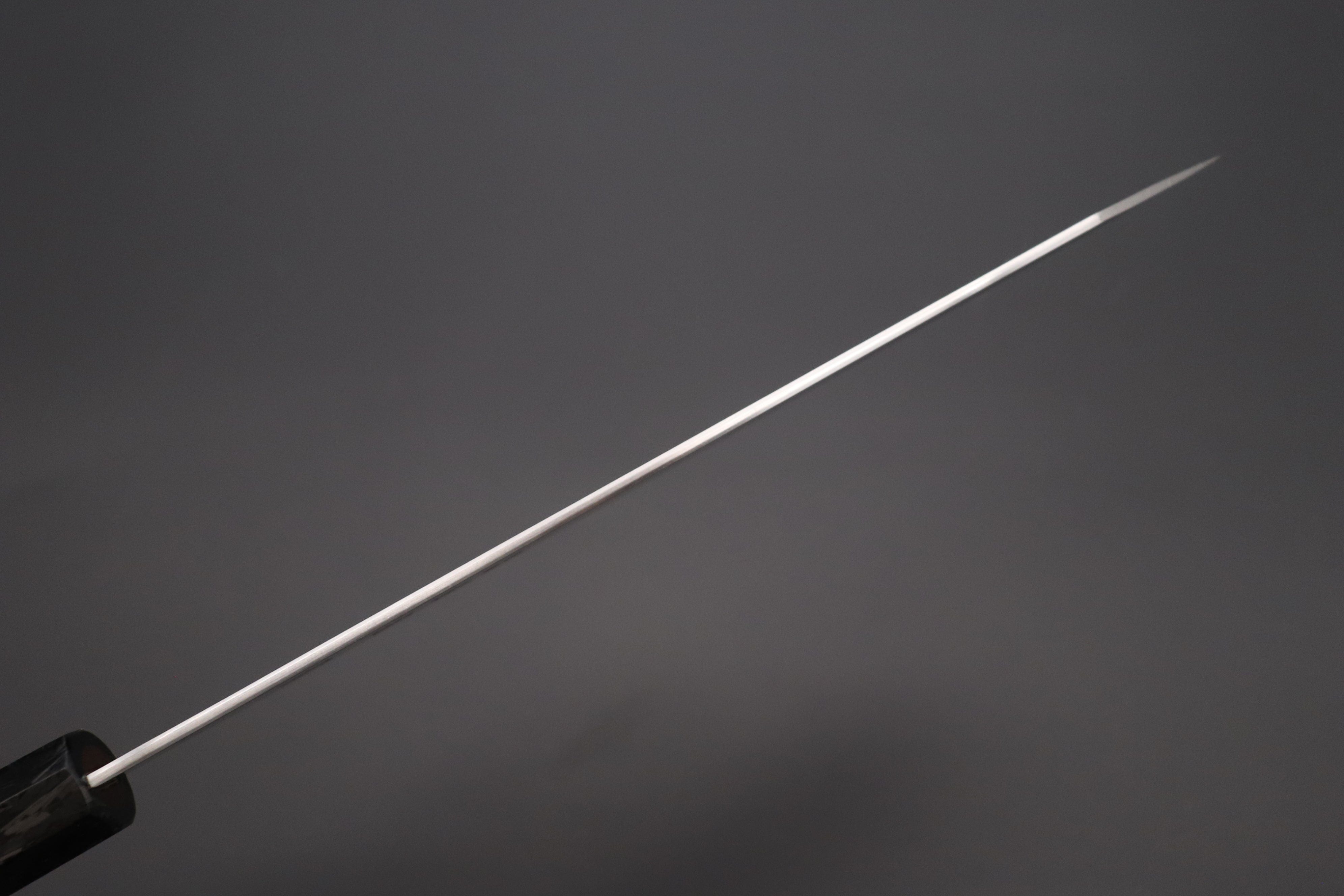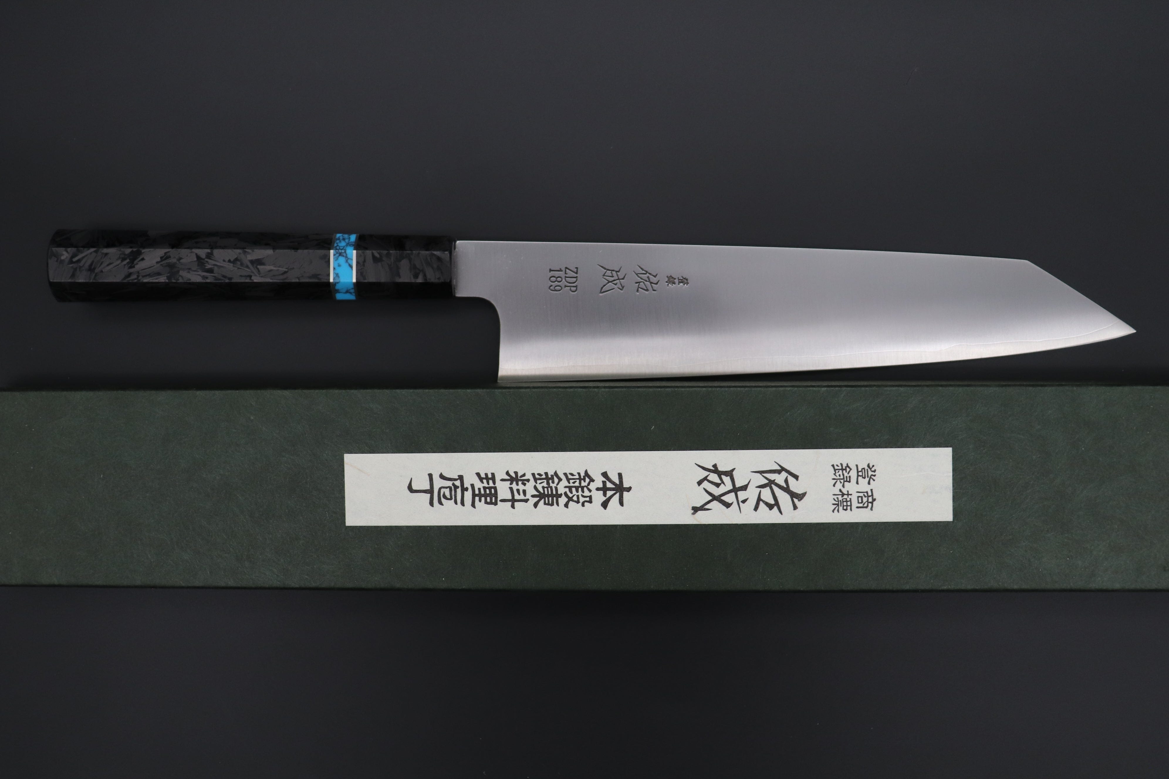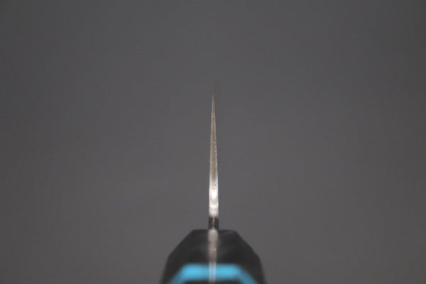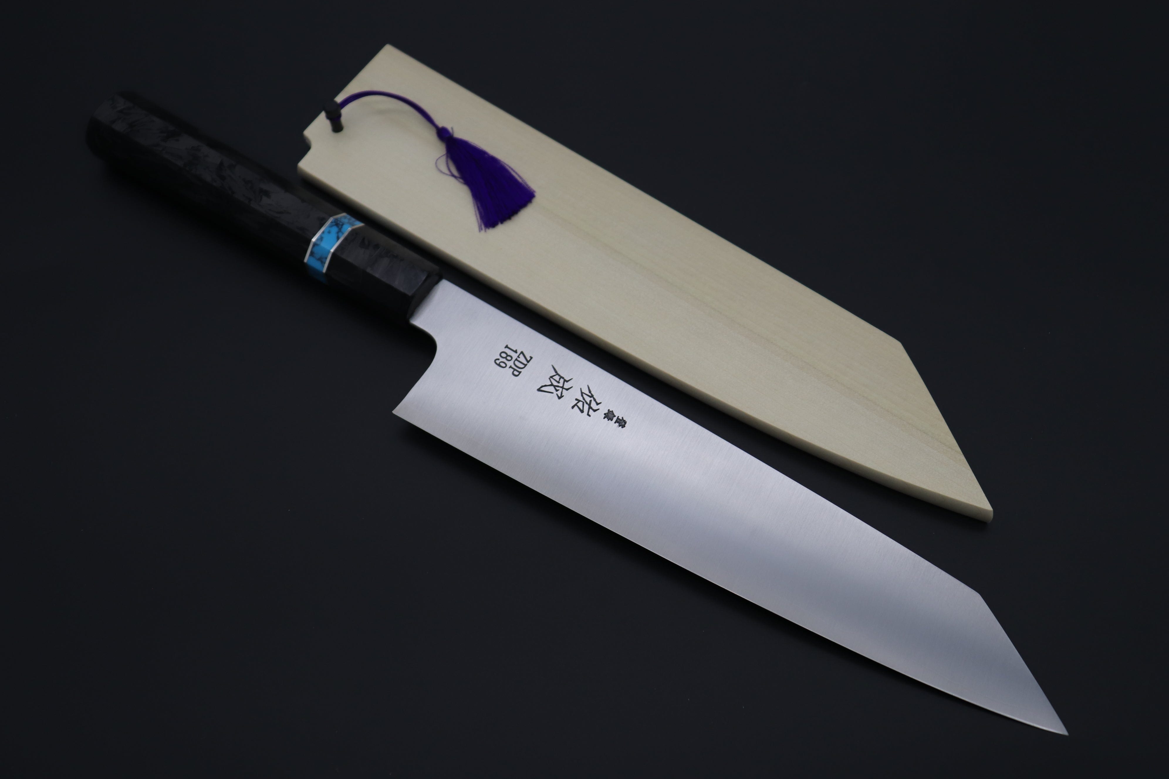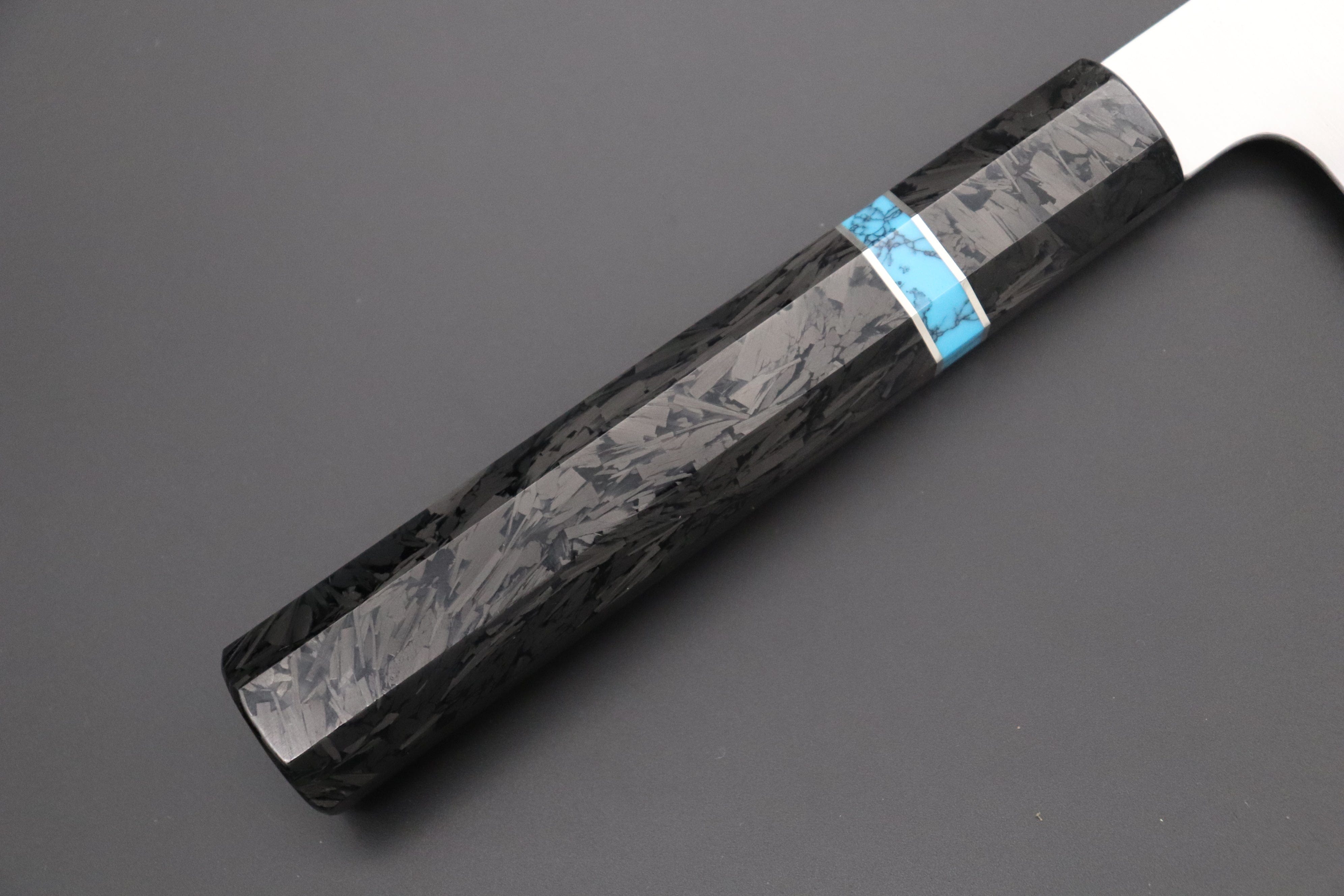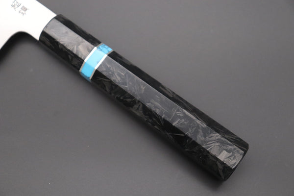 This Custom Limited Edition Sukenari ZDP-189 Clad Kiritsuke 240mm knife is fitted with a beautiful and innovative Octagonal Carbon Fiber Handle with Composite Turquoise Gemstone Ring and Nickel Silver Spacers. A matching Handcrafted Magnolia wood Saya (Sheath) with a black pakkawood Saya pin is also included with the knife.