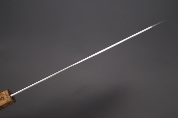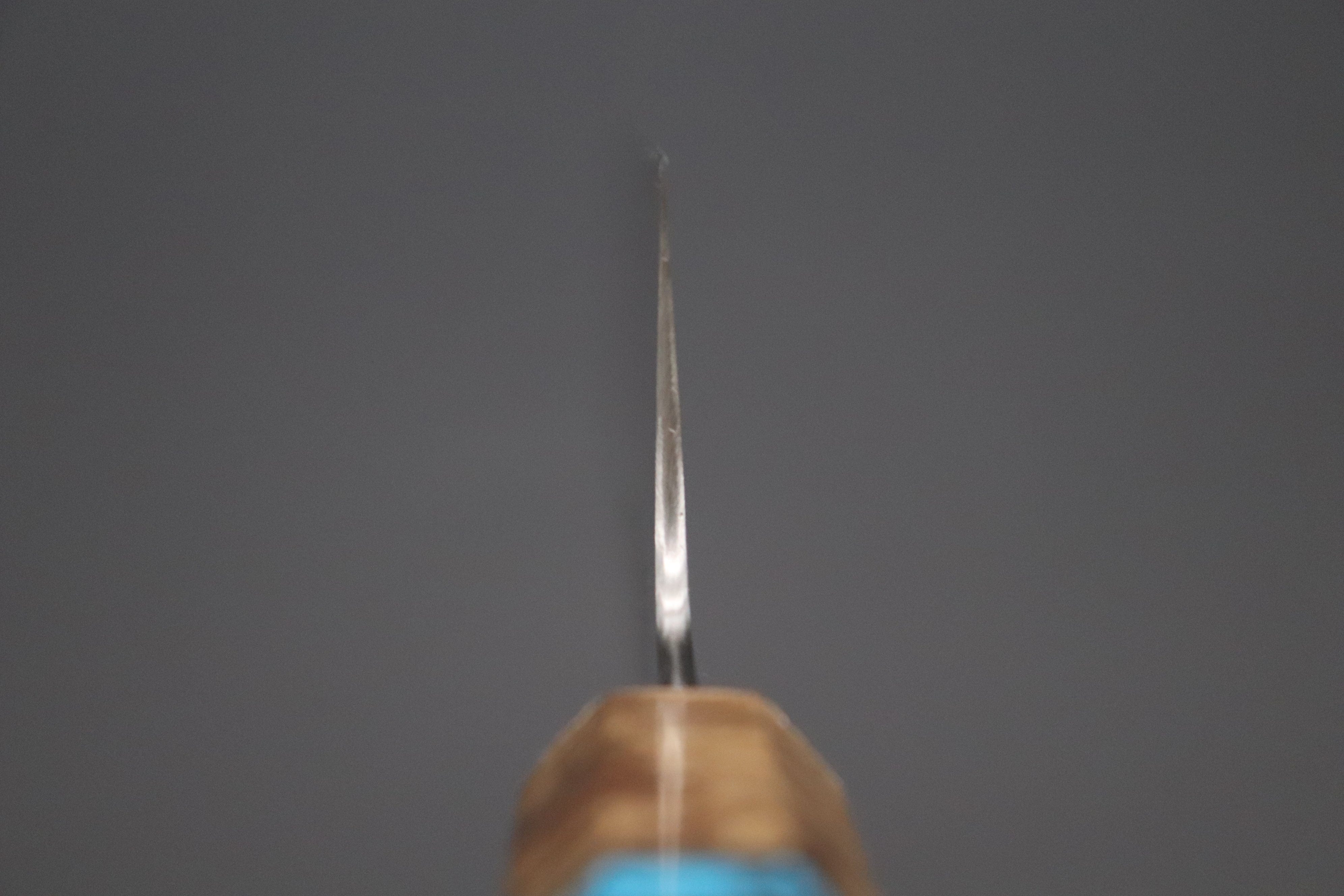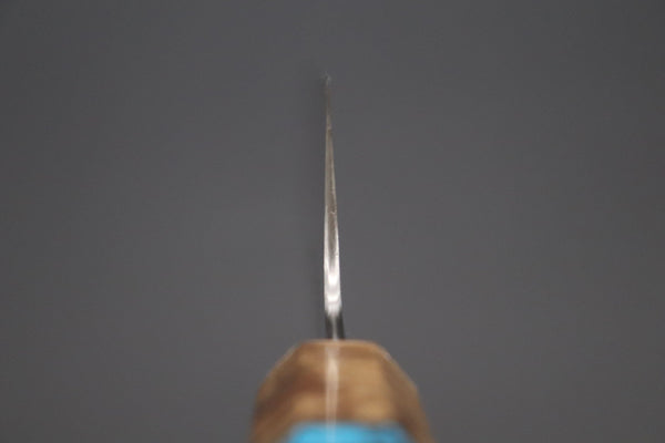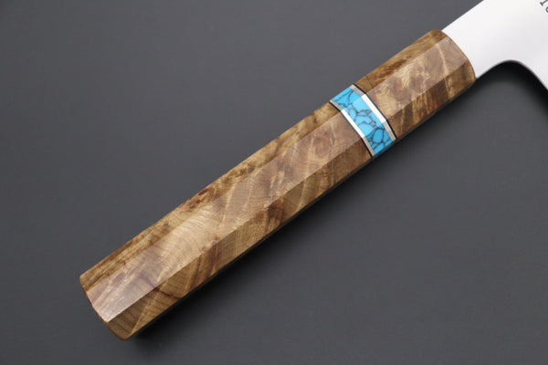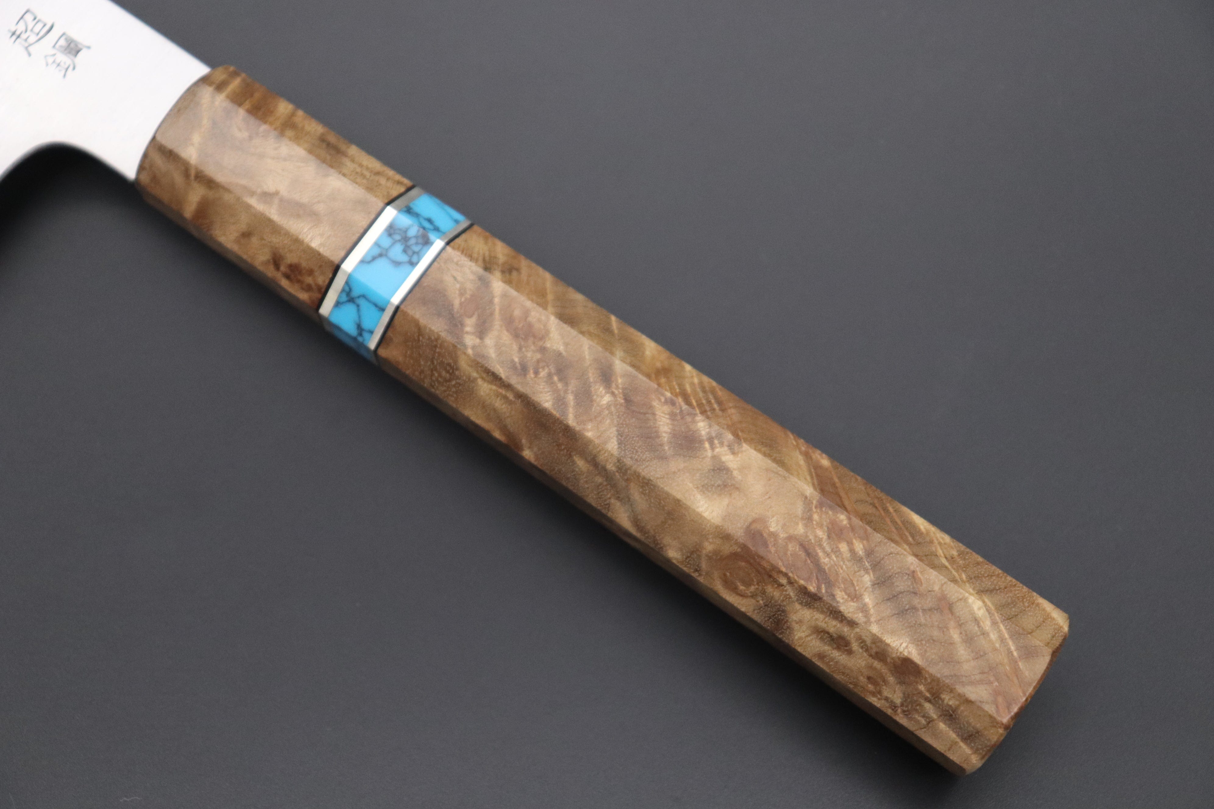 This Custom Limited Edition Sukenari ZDP-189 Clad Kiritsuke 240mm knife is fitted with a Innovative Octagonal Camphor Burl Wood Handle with Composite Turquoise Gemstone Ring and Nickel Silver Spacers. A matching Handcrafted Magnolia wood Saya (Sheath) with a black pakkawood Saya pin is also included with the knife.