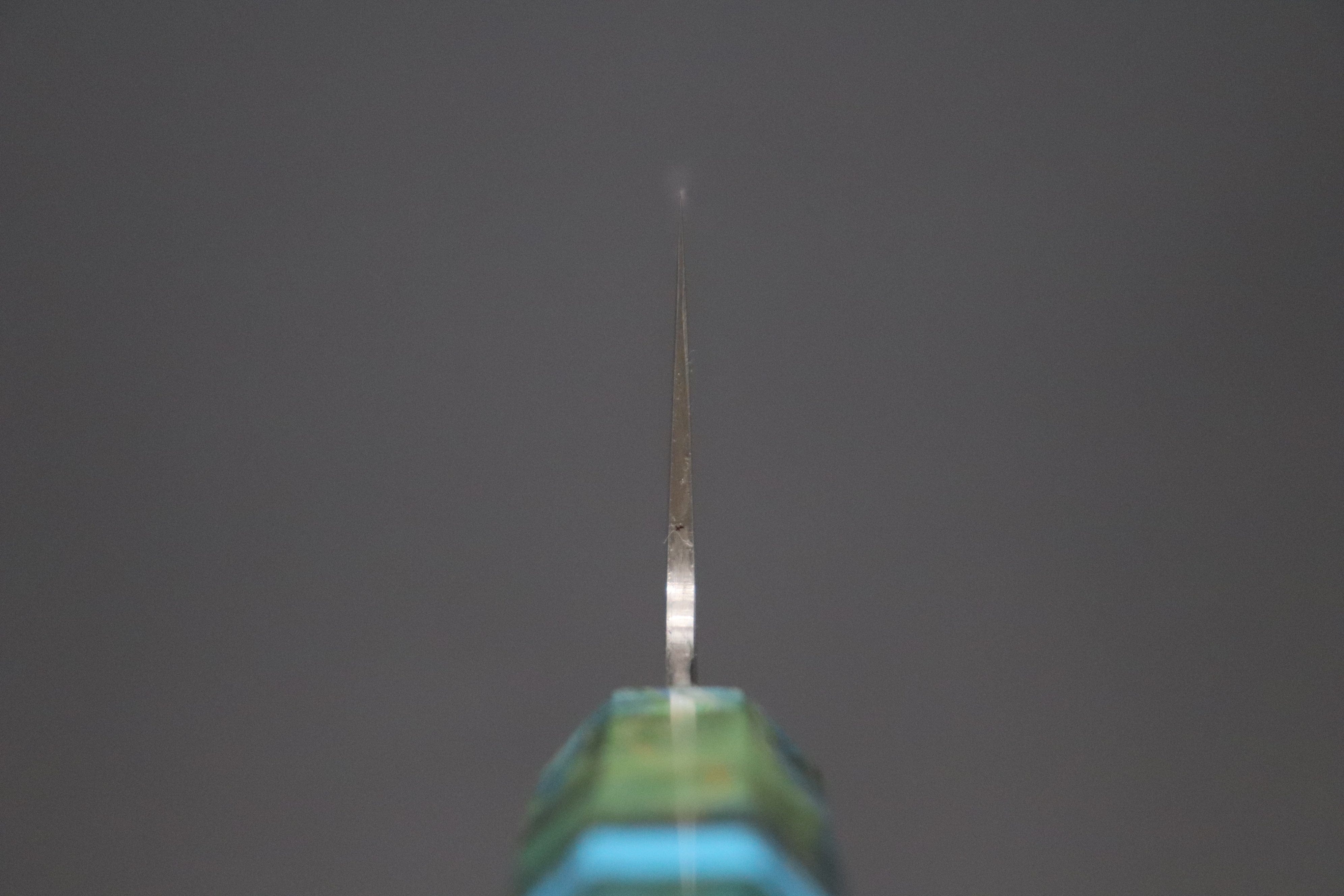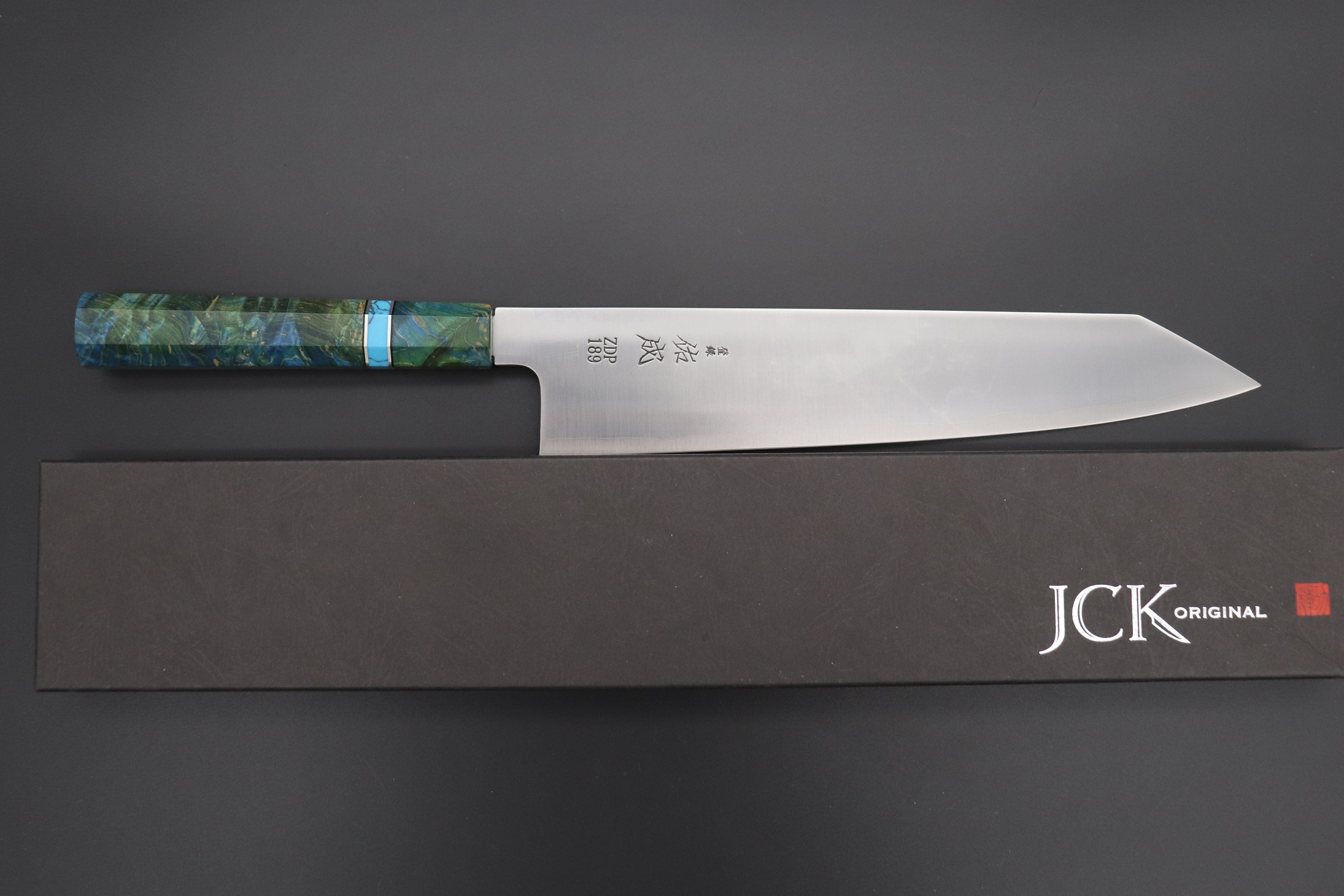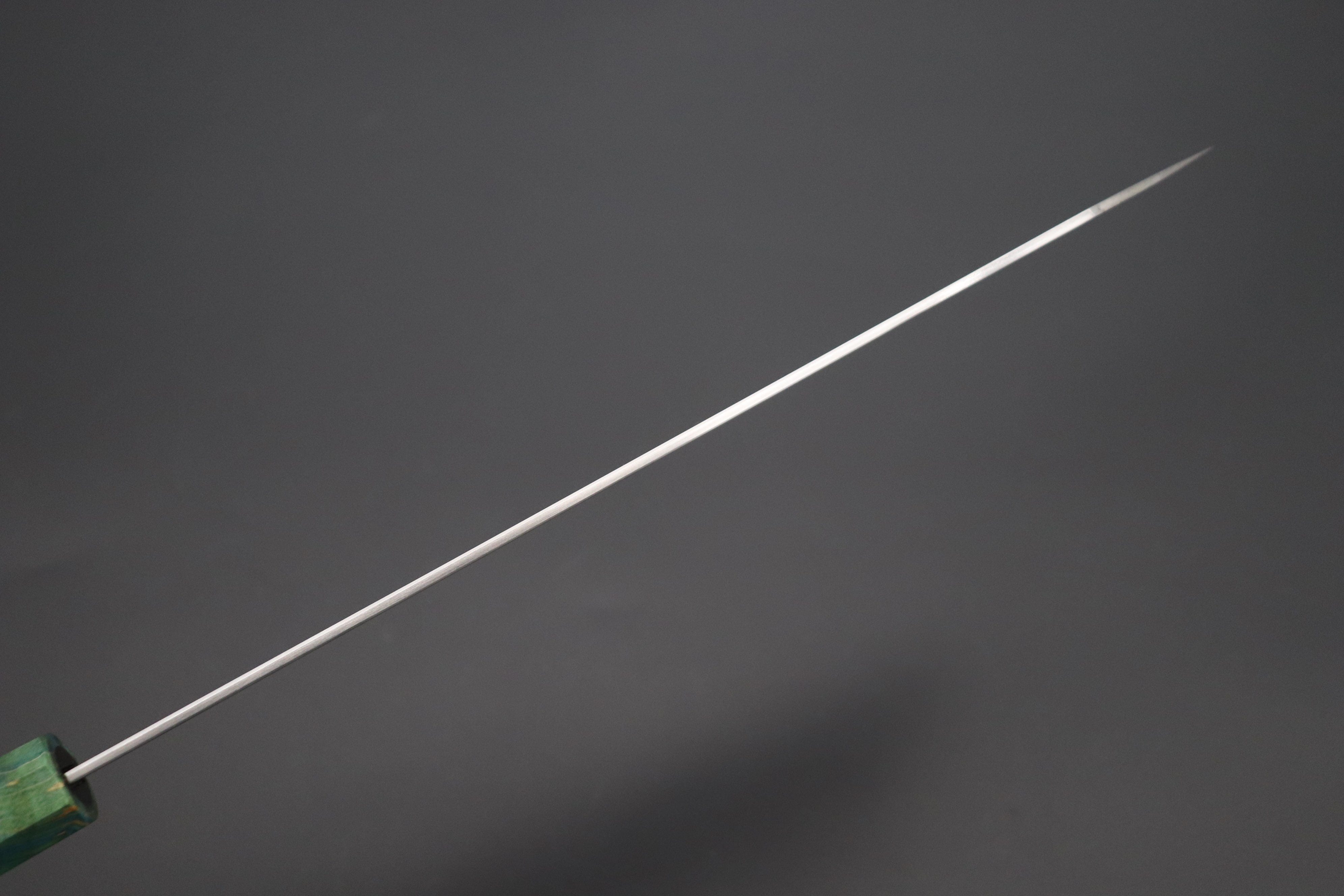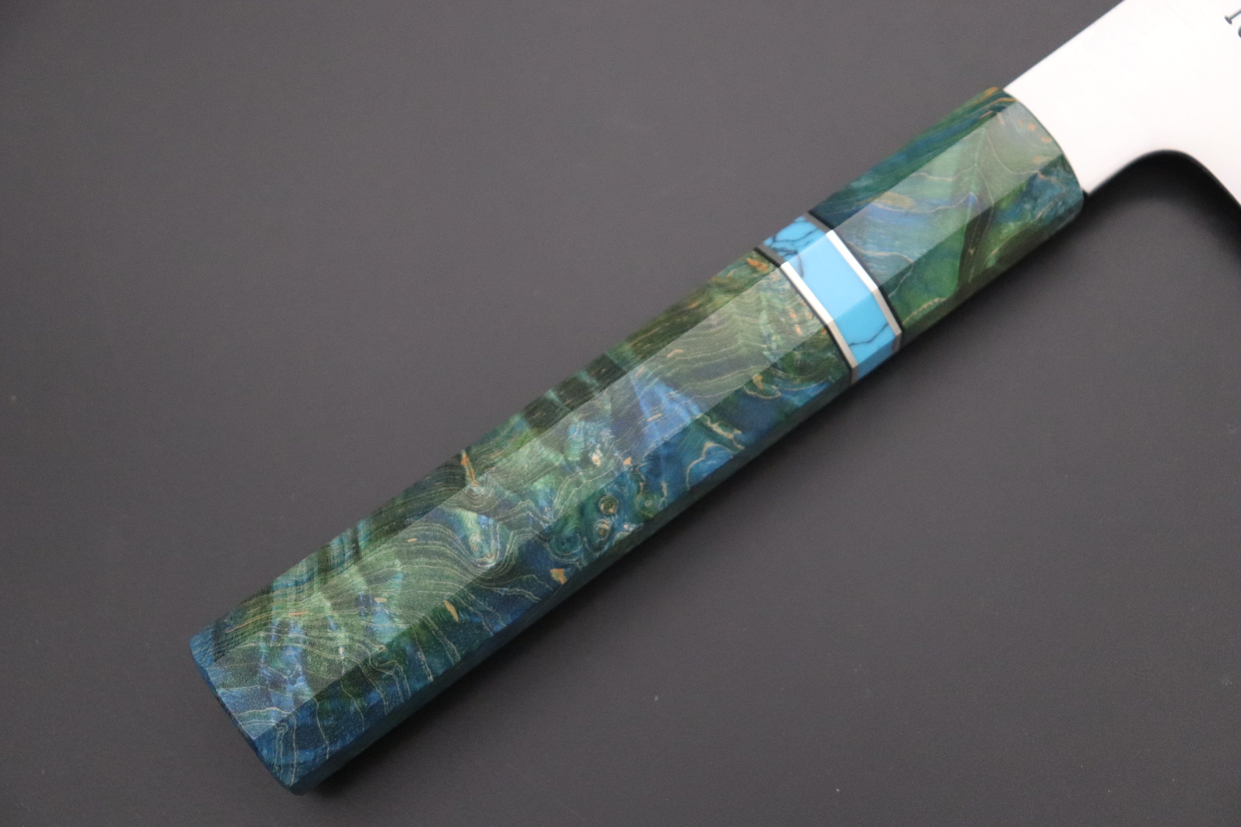 This Custom Limited Edition Sukenari ZDP-189 Clad Kiritsuke knife is fitted with a Innovative Emerald Ocean Blue Color Octagonal Stabilized Maple Wood Handle with Composite Blue Turquoise Gemstone Ring and Nickel Silver Spacers.  A matching Handcrafted Magnolia wood Saya (Sheath) with a black pakkawood Saya pin is also included with the knife.