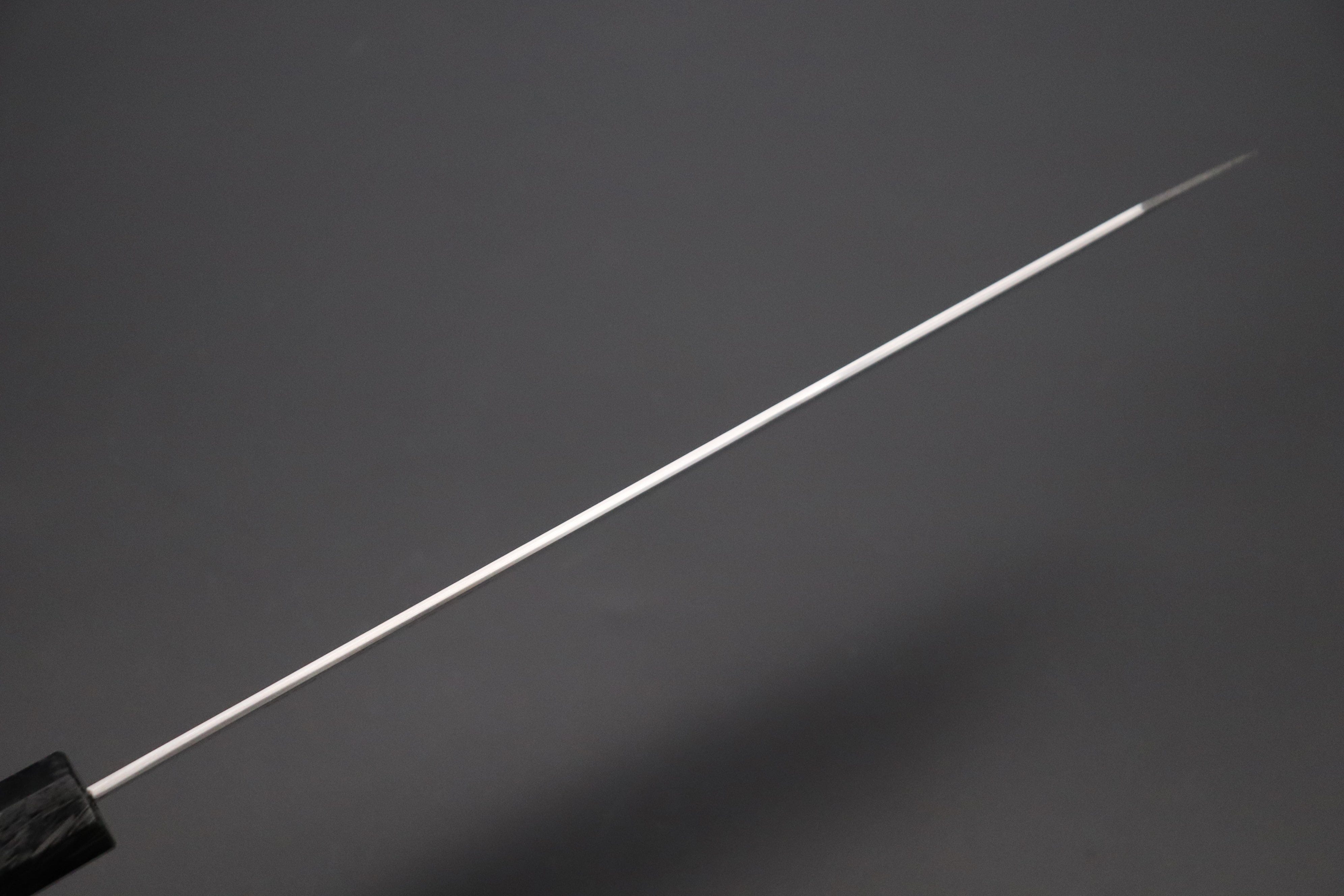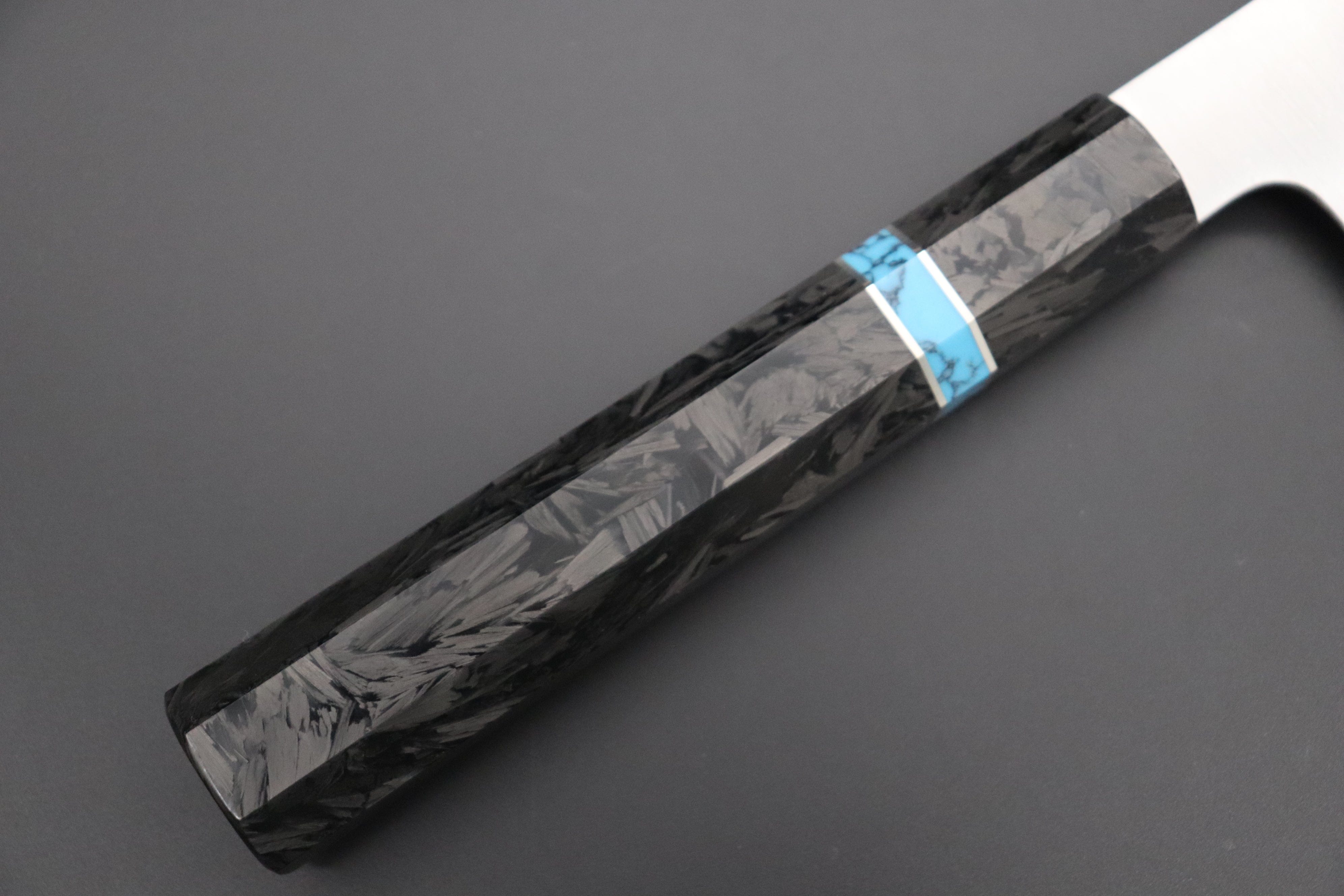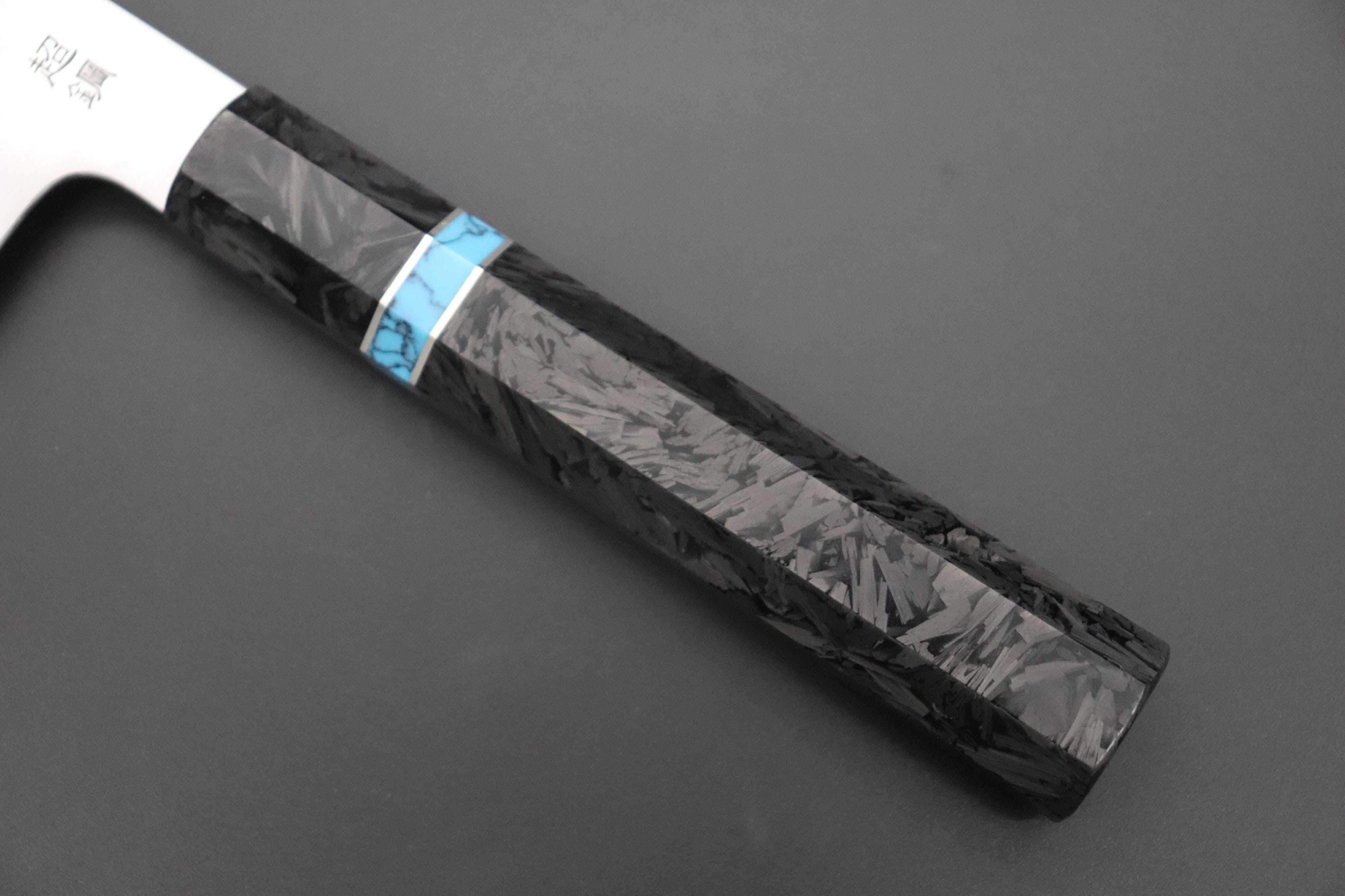 This Custom Limited Edition Sukenari ZDP-189 Clad Kiritsuke knife is fitted with a Innovative Octagonal Carbon Fiber Handle with Composite Turquoise Gemstone Ring and Nickel Silver Spacers.. A matching Handcrafted Magnolia wood Saya (Sheath) with a black pakkawood Saya pin is also included with the knife.