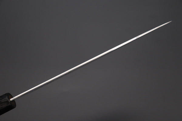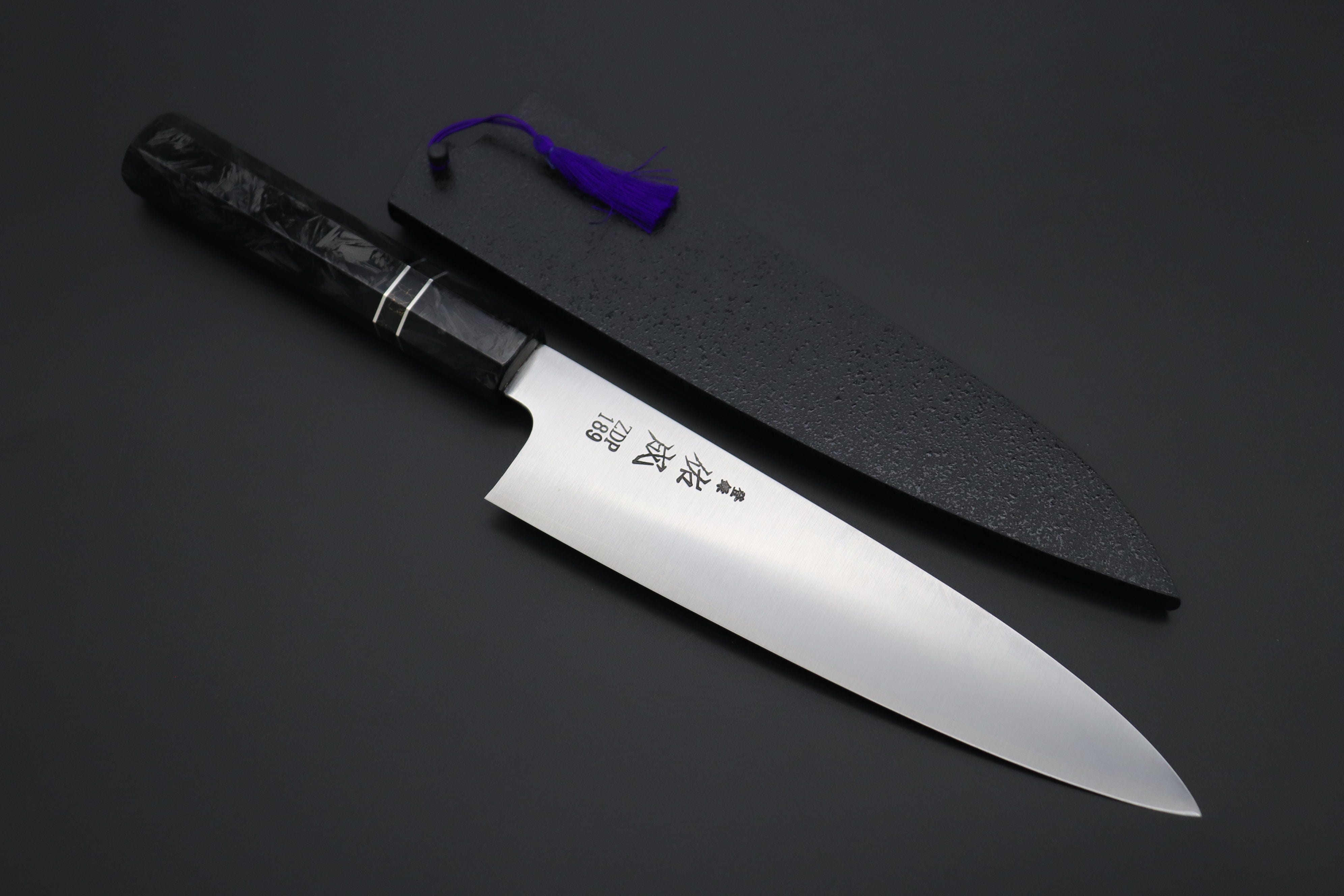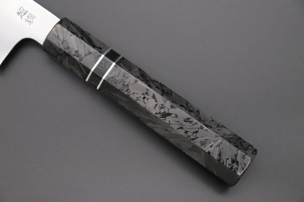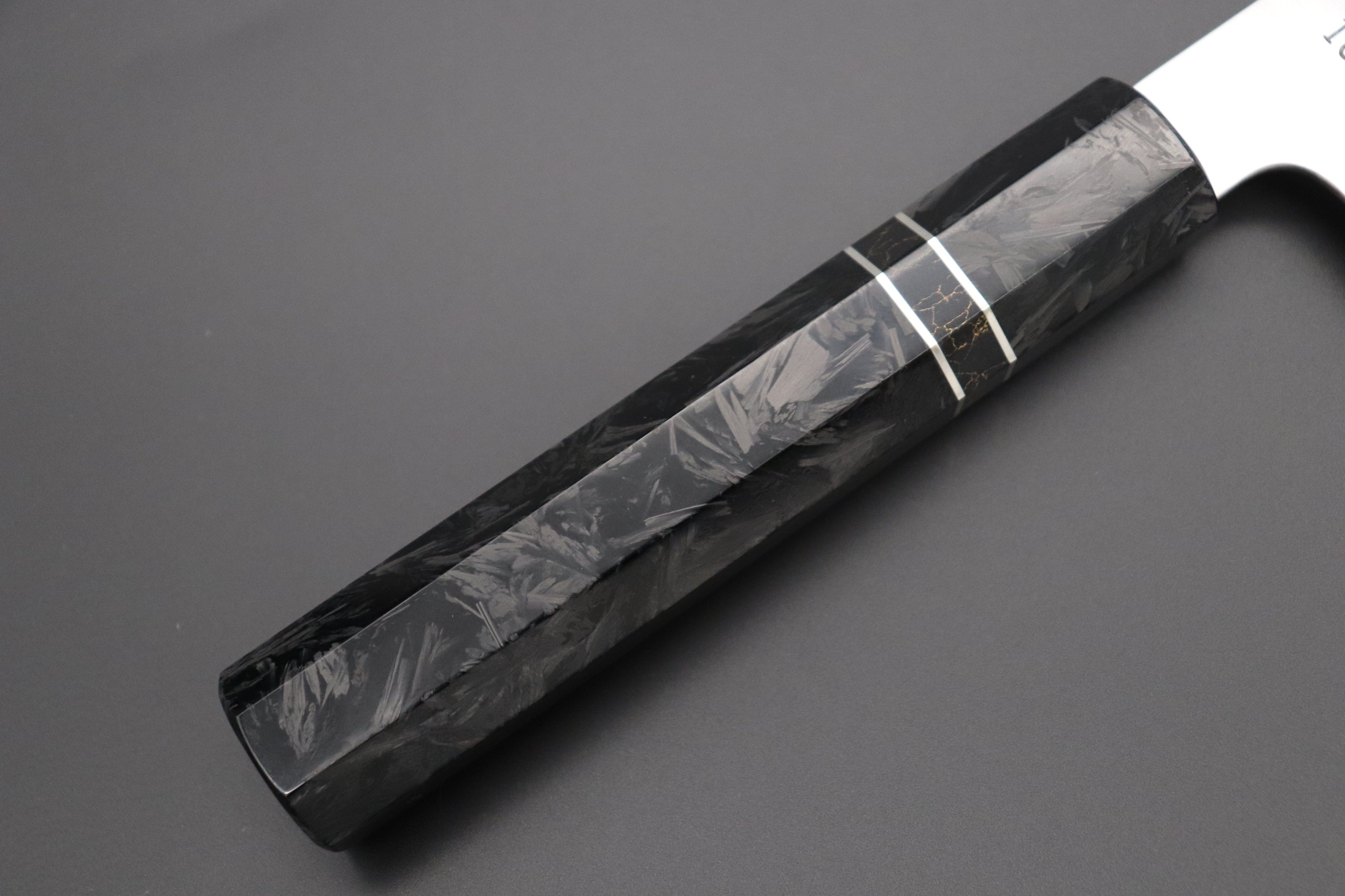 This Custom Limited Edition Sukenari ZDP-189 Clad Wa Gyuto knife is fitted with a beautiful and innovative Octagonal Carbon Fiber Handle with Composite Black Color Turquoise Gemstone Ring and Nickel Silver Spacers. A matching Black Lacquered wood Saya (Sheath) with a black pakkawood Saya pin is also included with the knife.