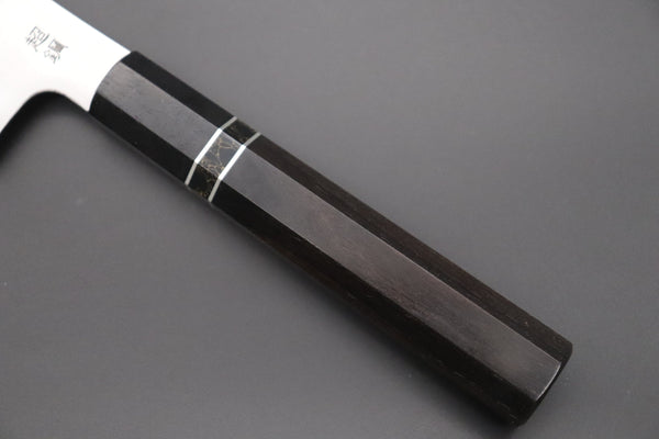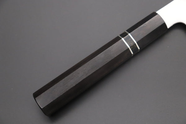 This Custom Limited Edition Sukenari ZDP-189 Clad Wa Gyuto 240mm knife is fitted with a beautiful and innovative Octagonal Ebonywood Handle with Composite Black Turquoise Gemstone Ring and Nickel Silver Spacers. A matching Black Lacquered wood Saya (Sheath) with a black pakkawood Saya pin is also included with the knife.