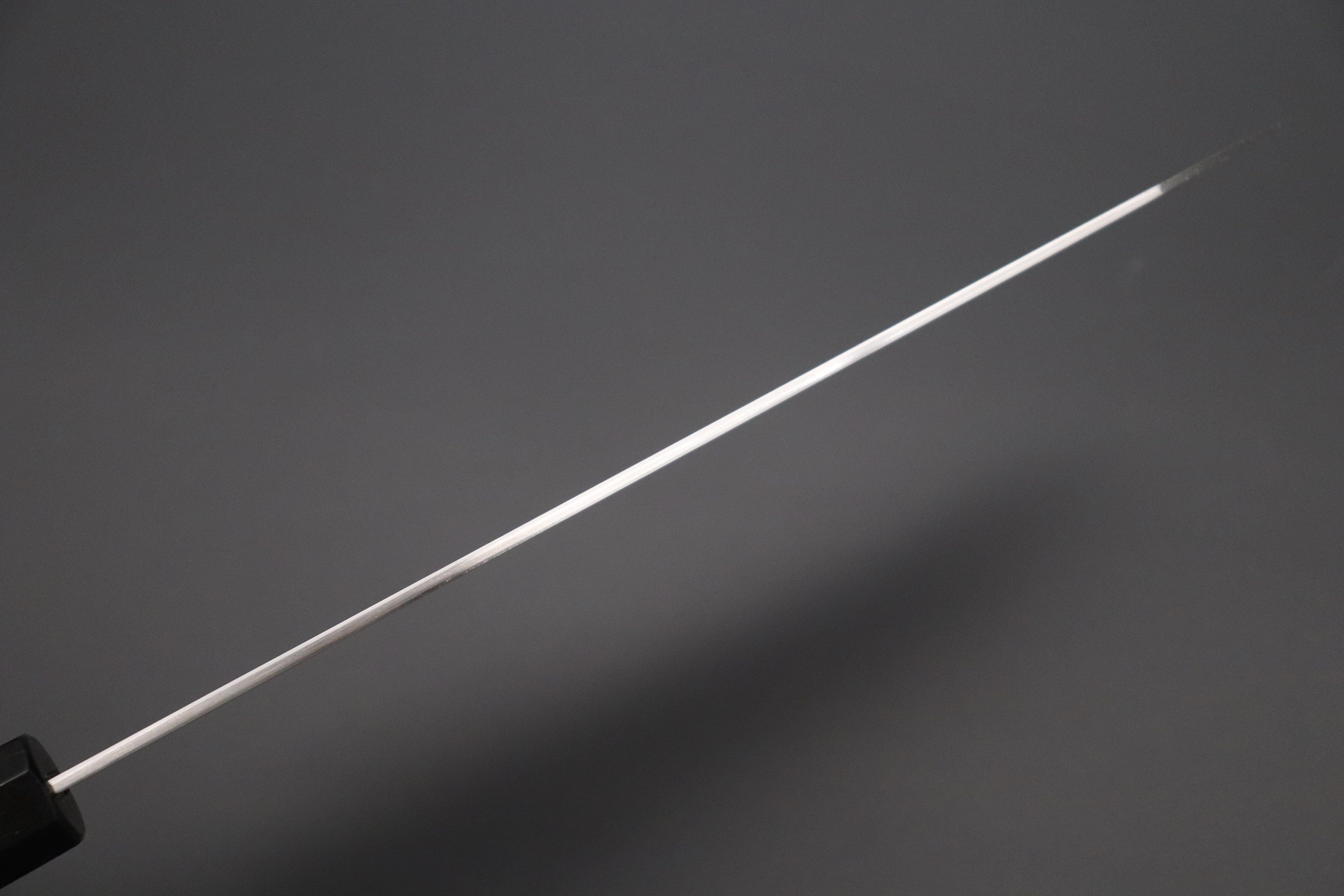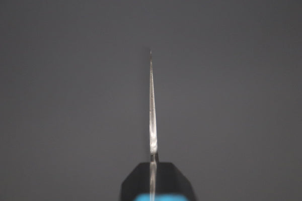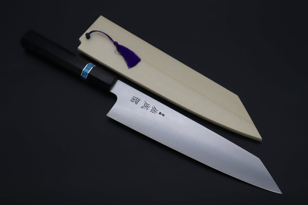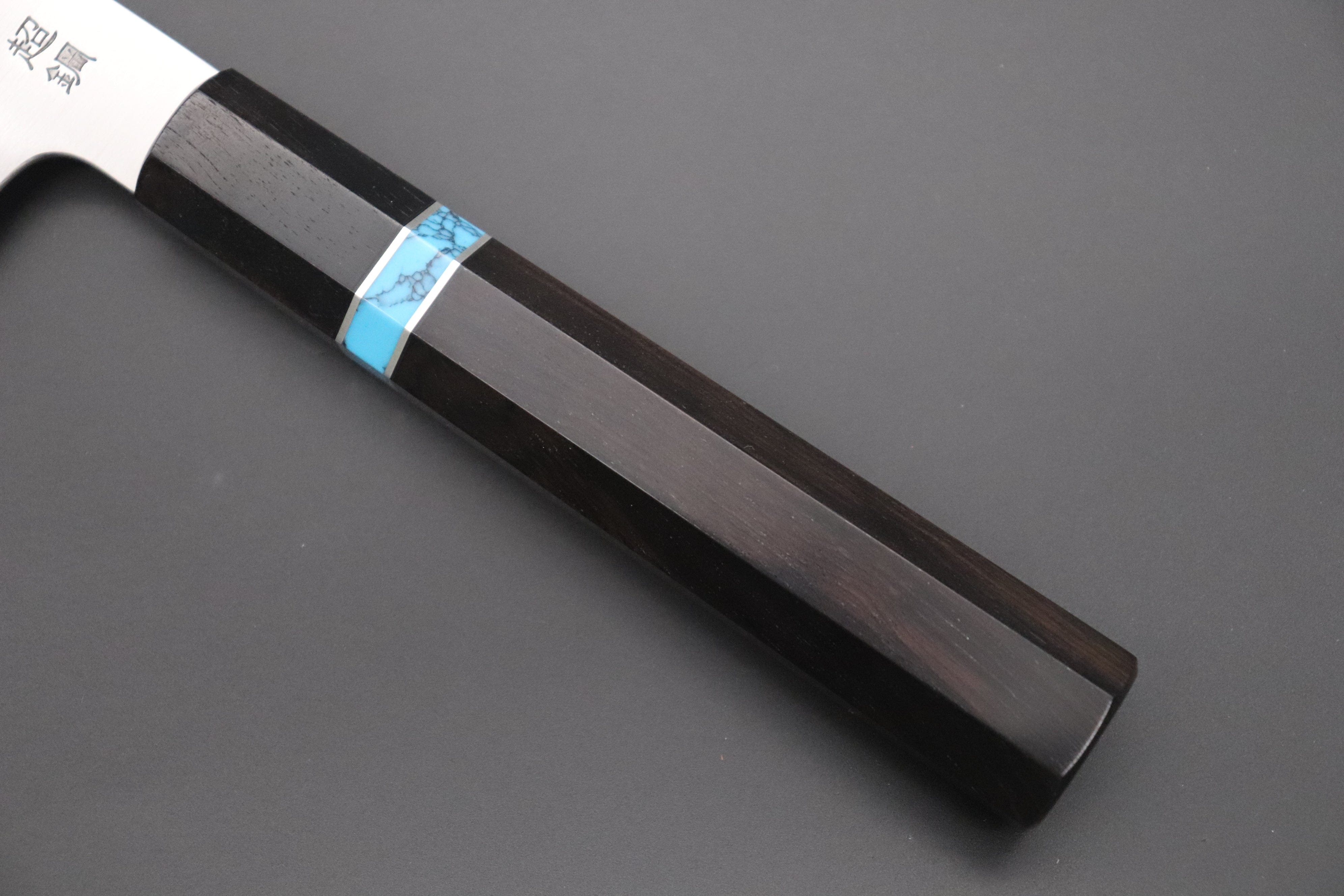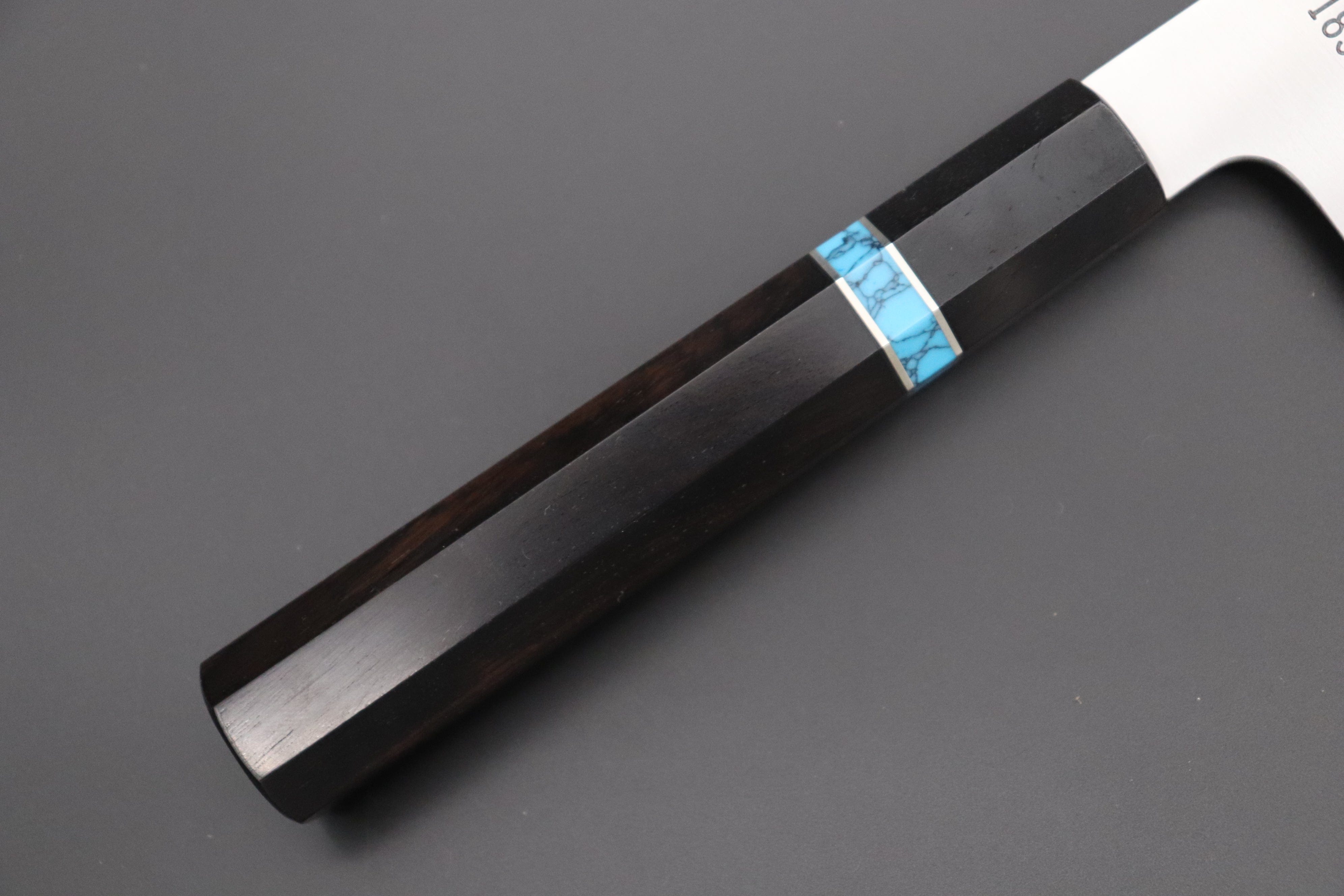 This Custom Limited Edition Sukenari ZDP-189 Clad Kiritsuke 240mm knife is fitted with a beautiful and innovative Octagonal Ebonywood Handle with Composite Turquoise Gemstone Ring and Nickel Silver Spacers. A matching handcrafted Magnolia wood Saya (Sheath) with a black pakkawood Saya pin is also included with the knife.