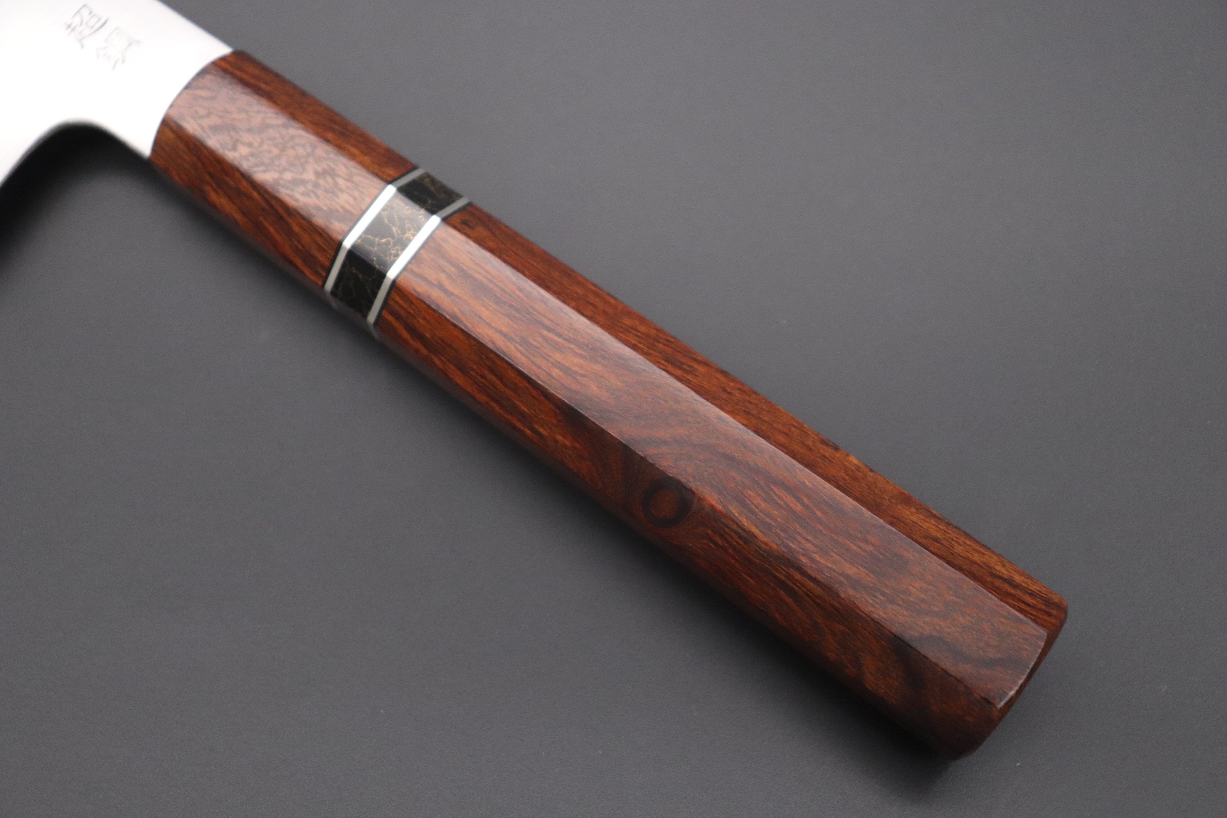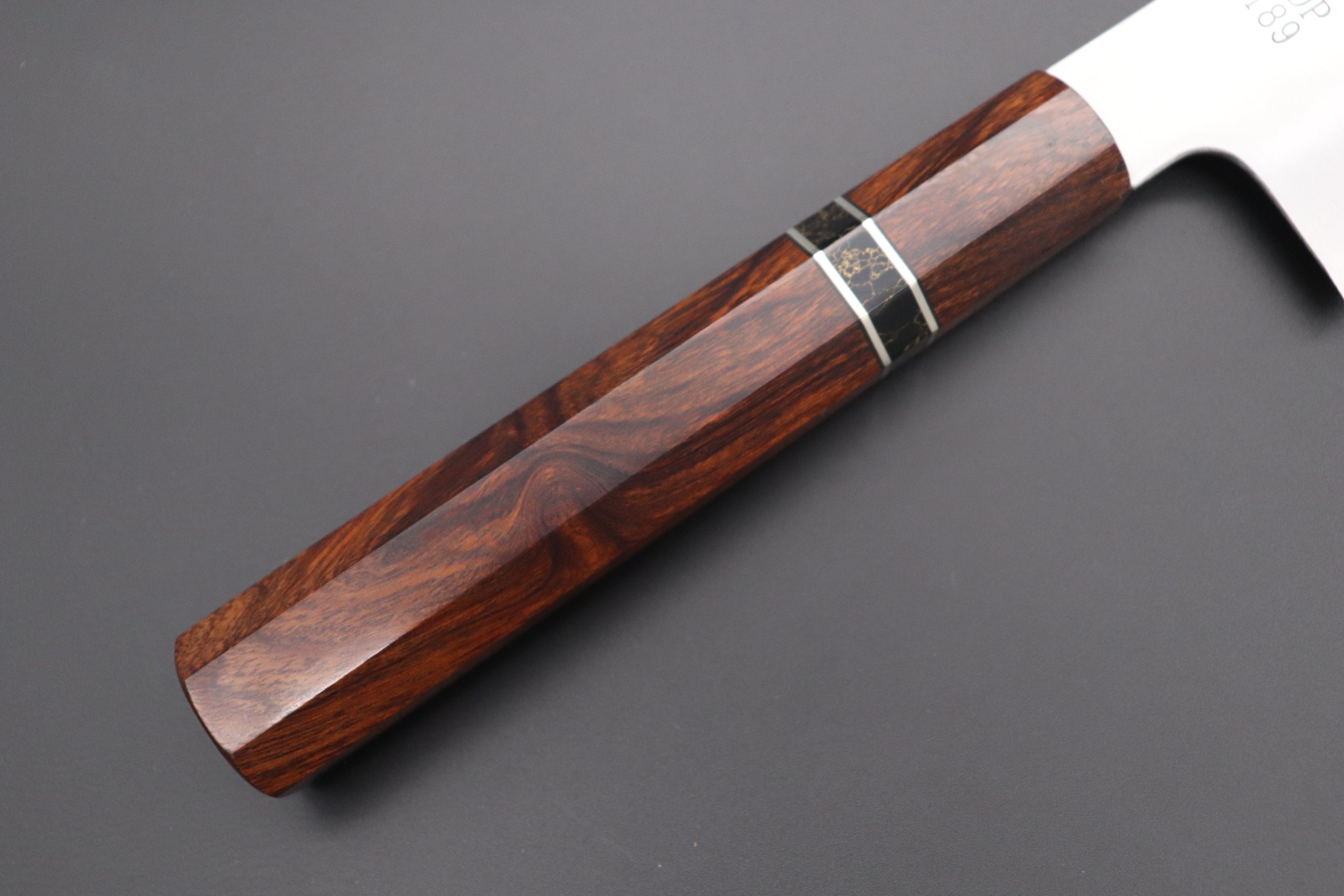 This Custom Limited Edition Sukenari ZDP-189 Clad Wa Gyuto knife is fitted with a beautiful and innovative Octagonal Desert Ironwood Handle with Composite Black Color Turquoise Gemstone Ring and Nickel Silver Spacers. A matching Black Lacquered wood Saya (Sheath) with a black pakkawood Saya pin is also included with the knife.