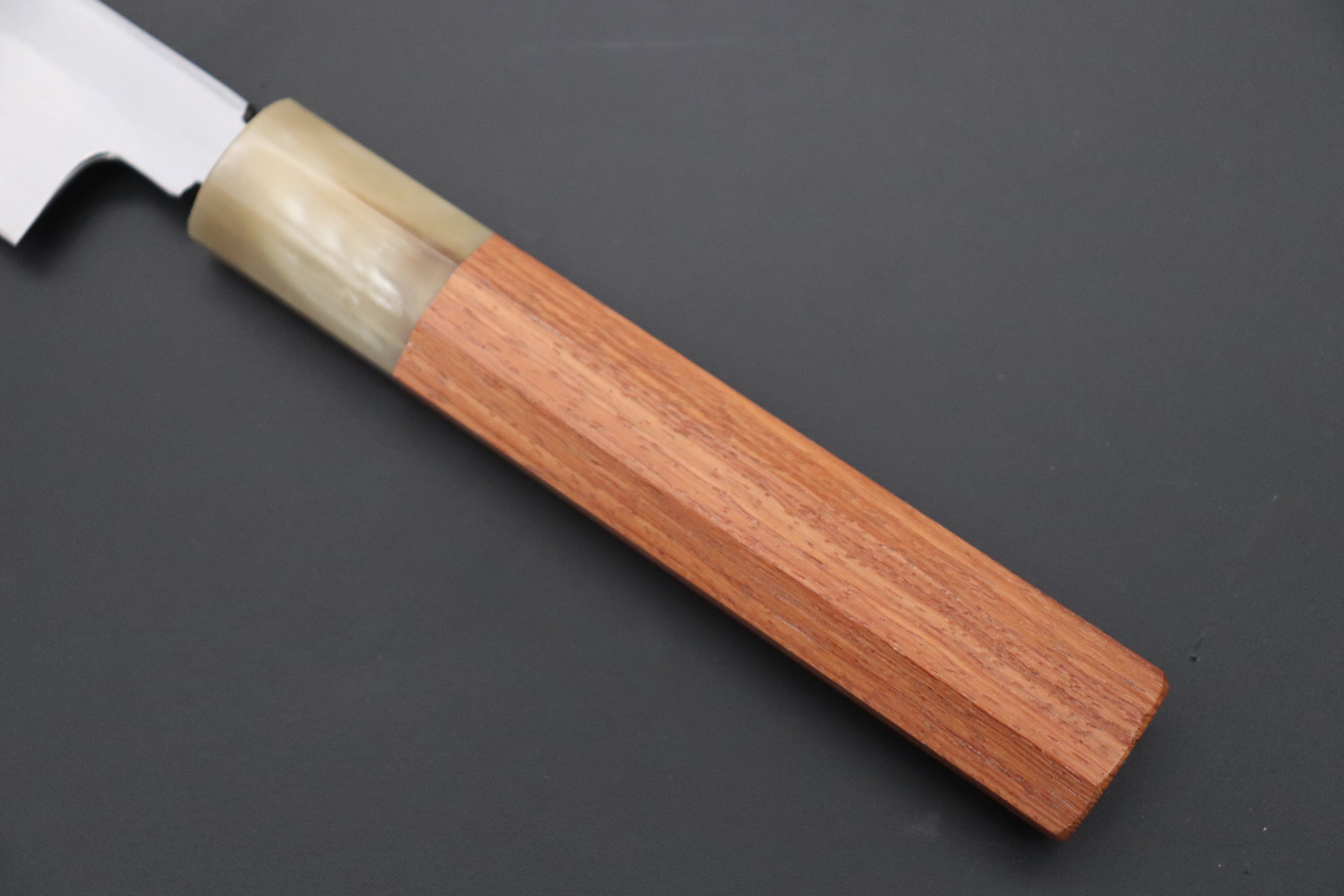 Japanese Traditional Style “Wa-Bocho” knives generally come with Single bevel edge for right handed use (the opposite side of blade is ground flat with slightly concaved shape). The reverse grinding left handed version is also available at 50% extra of regular price. (Sorry for much extra! Due to a small demand for the left handed version in Japan, it is costly to run a special small production from the beginning step). We try to keep the left handed versions in stock, but once sold out, it may take 60 to 90 days for delivery. Please contact us first for the availability at email.
