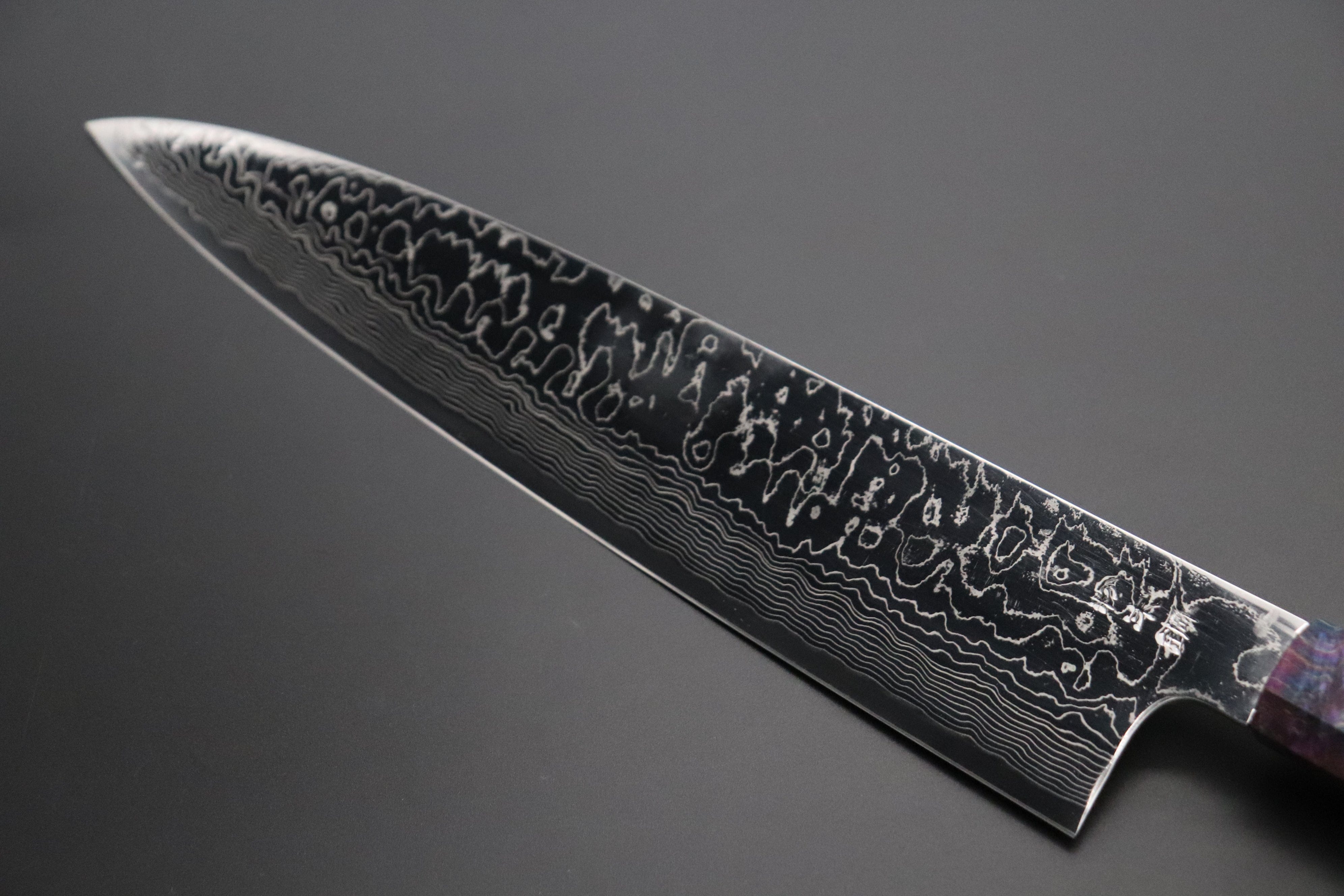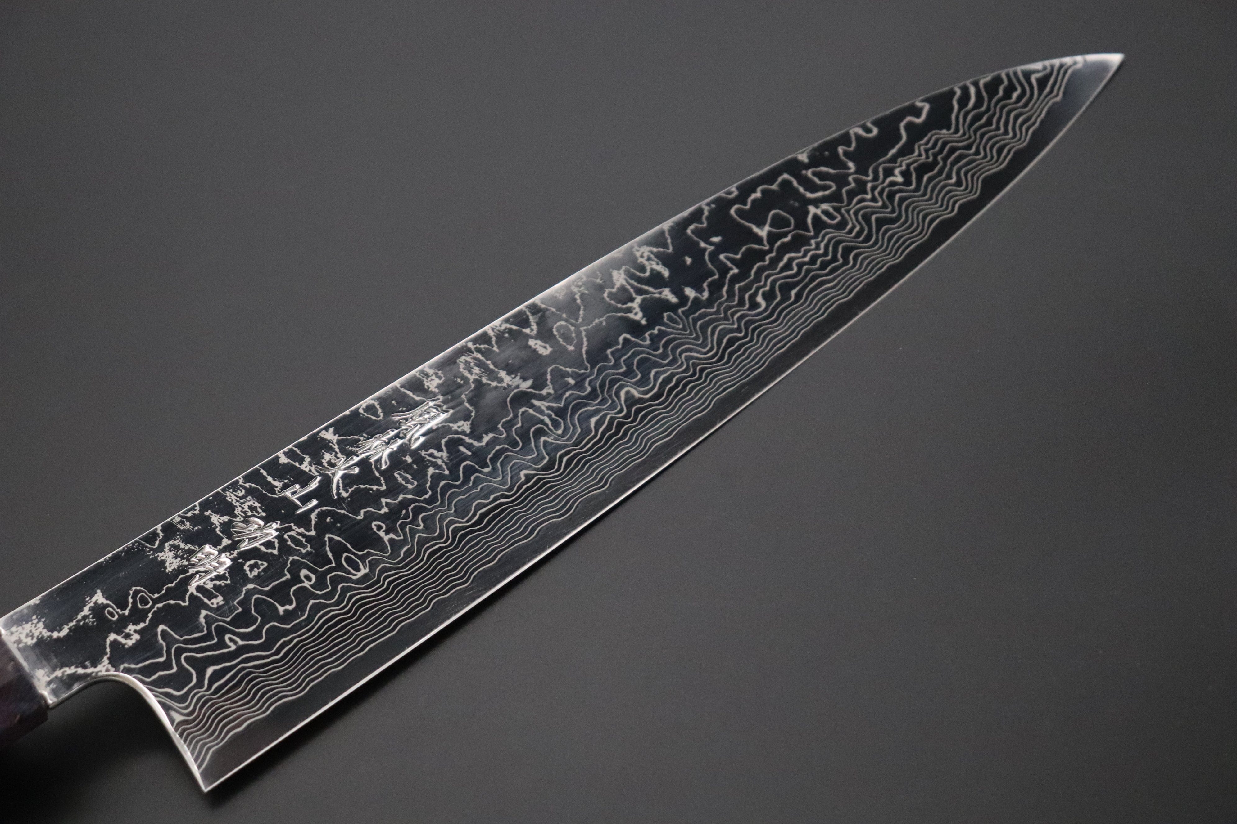 This beautiful Damascus Wa Gyuto is forged and hand crafted by passionate forge smith Sukenari using R-2 steel. R-2 (Also known as SG-II ) is a high-quality Powdered Metallurgy (P.M.) High Speed Tool Steel from Kobelco. R-2 has a very rich chemical composition, which includes Carbon 1.25-1.45 %, Chromium 14- 16%, Molybdenum 2.3- 3.3 %, and Vanadium 1.8- 2.2 %.