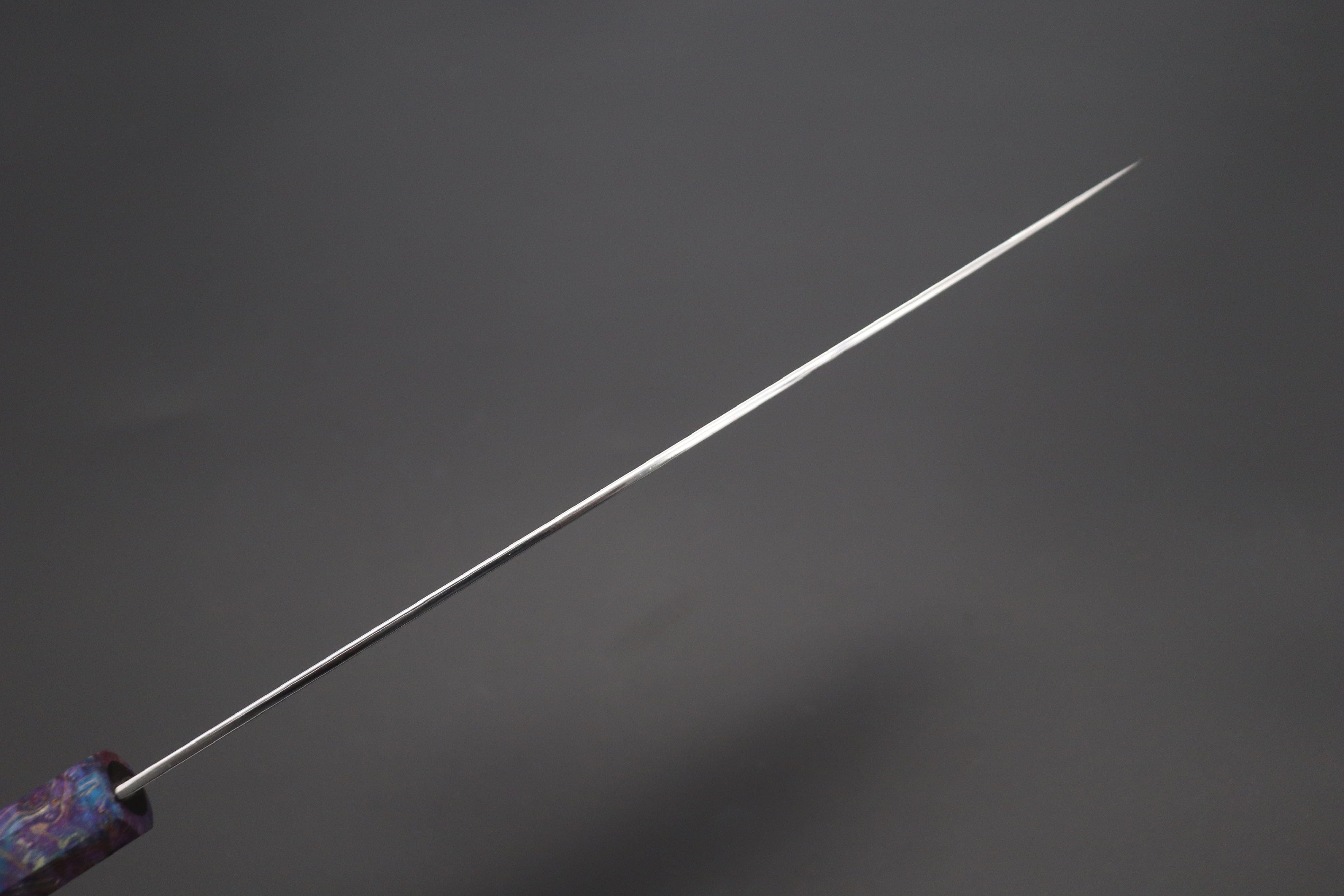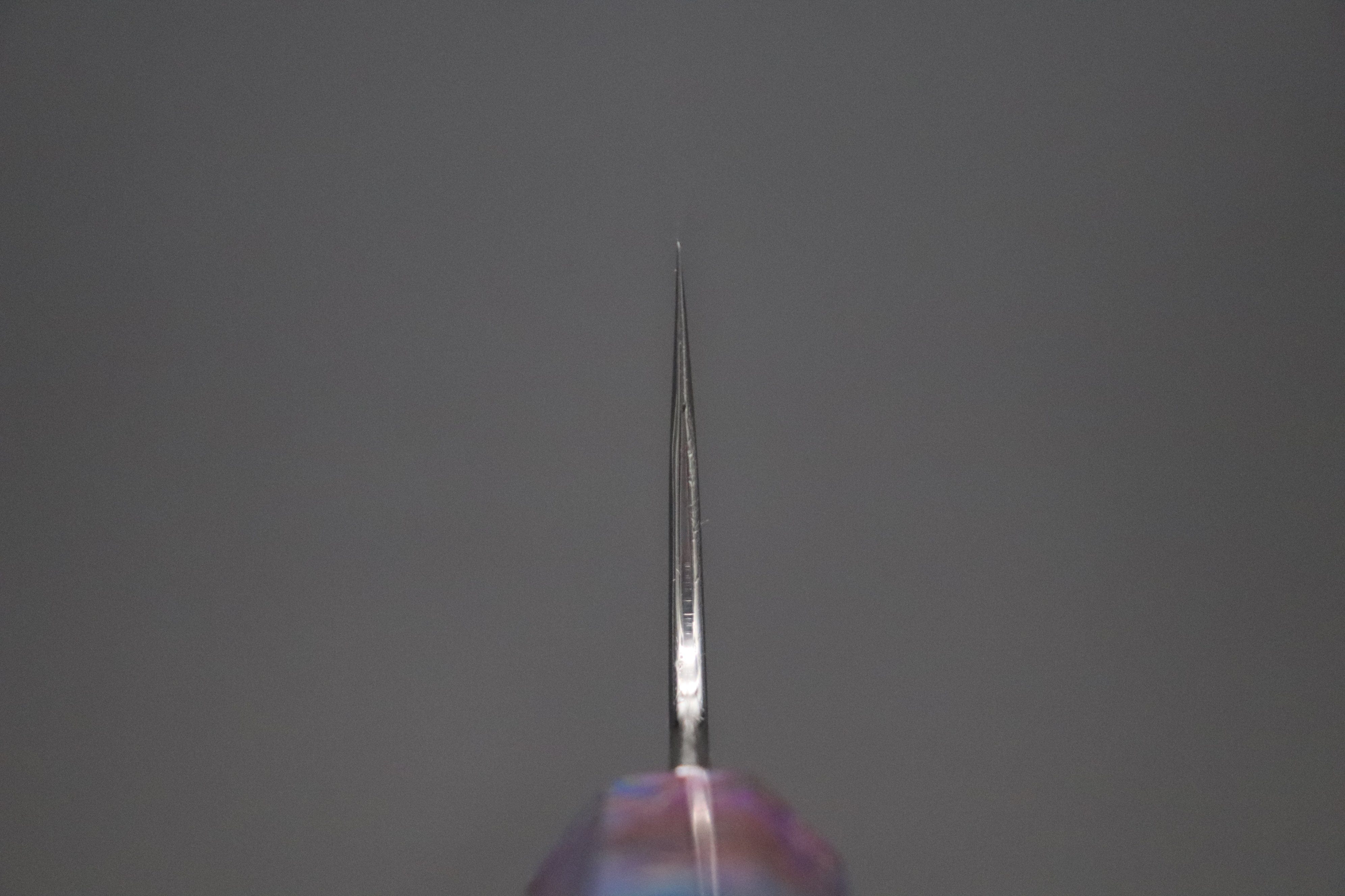 To enrich your cooking experience and suit a wide variety of needs and preferences, this Fu-Rin-Ka-Zan R-2 Clad FRDYP-66 Wa Gyuto 270mm features an Innovative Sunset Purple Color Octagonal Stabilized Maple Wood Handle with Composite Turquoise Gemstone Ring and Nickel Silver Spacers. A matching Black Lacquered wood Saya (Sheath) with a black pakkawood Saya pin is also included with the knife.