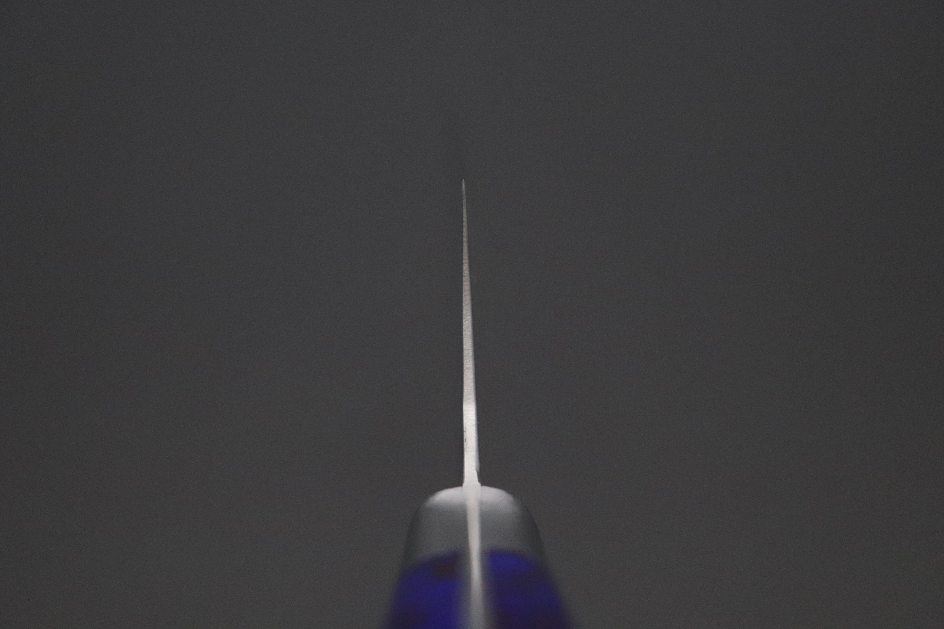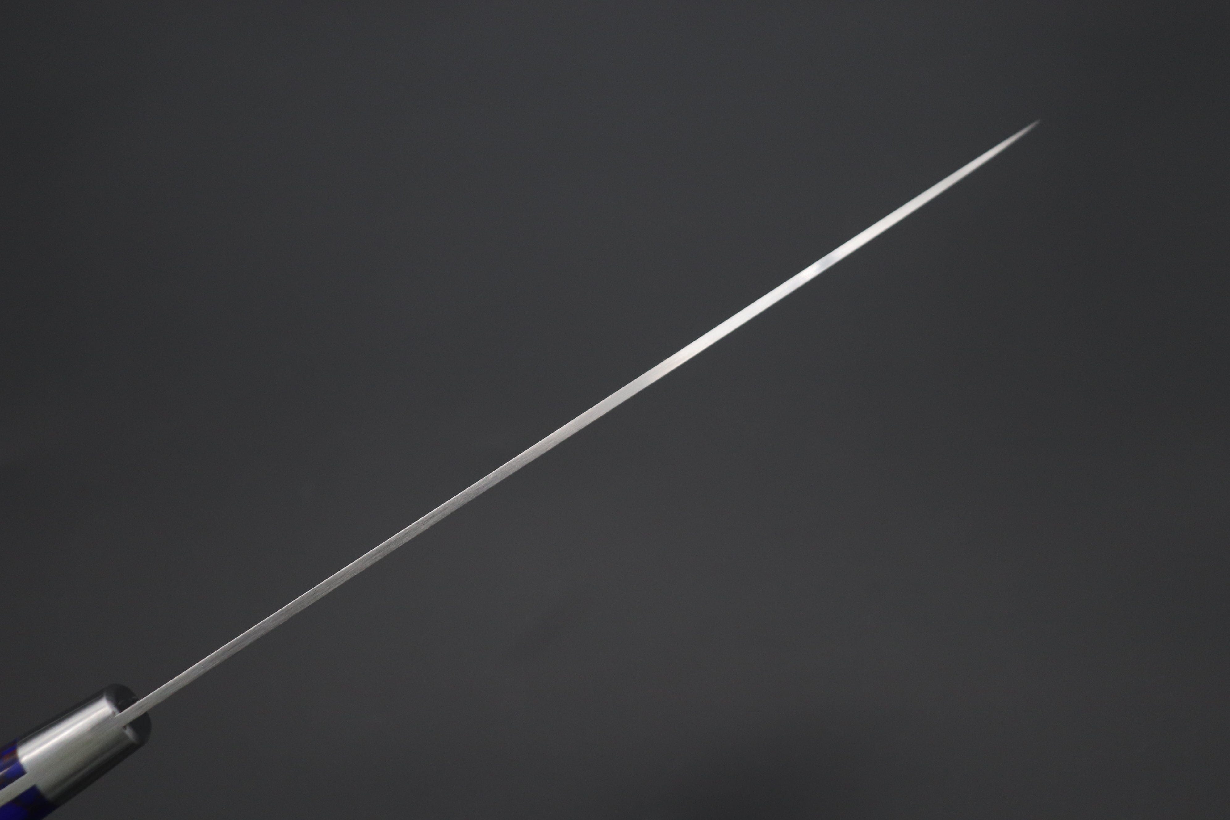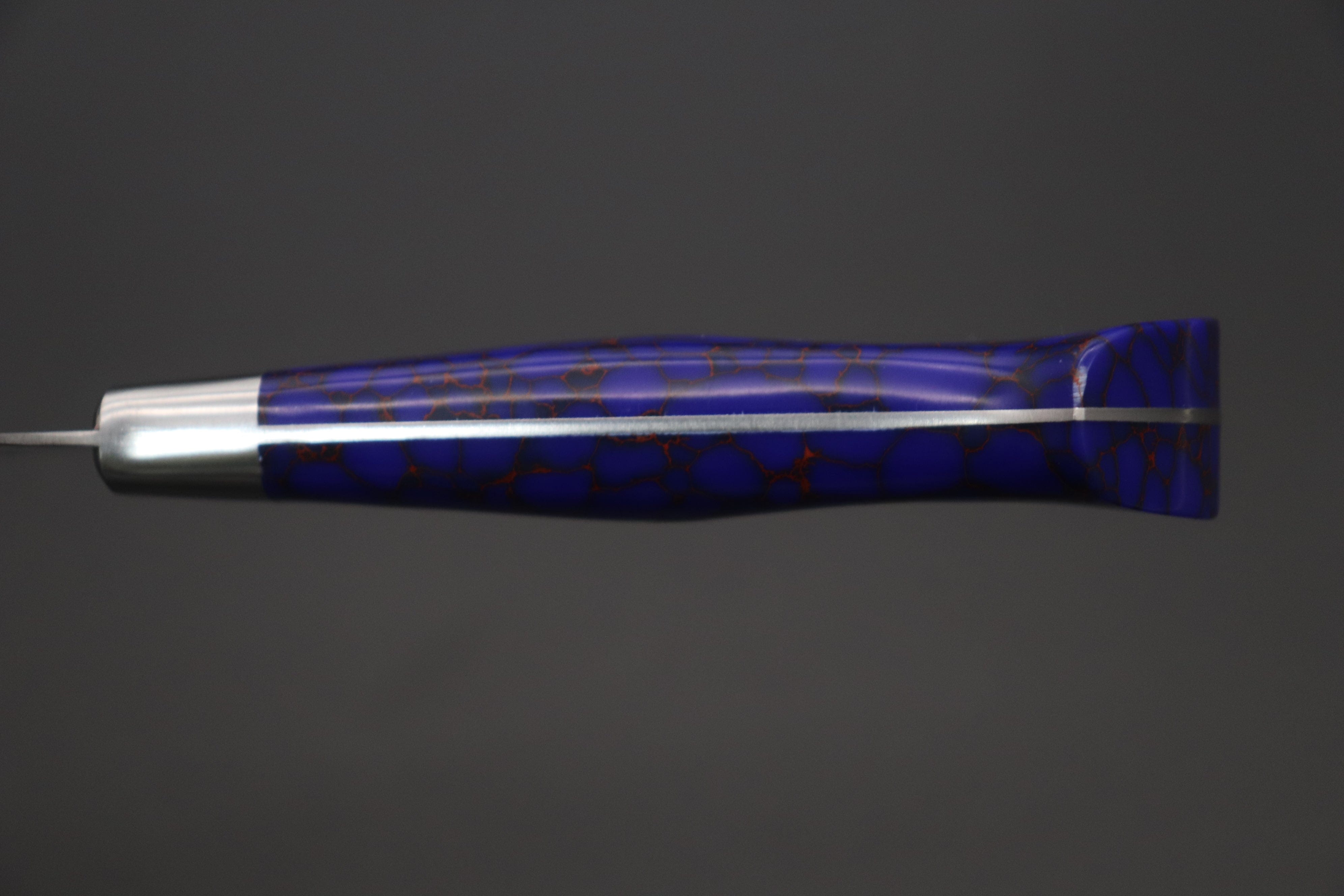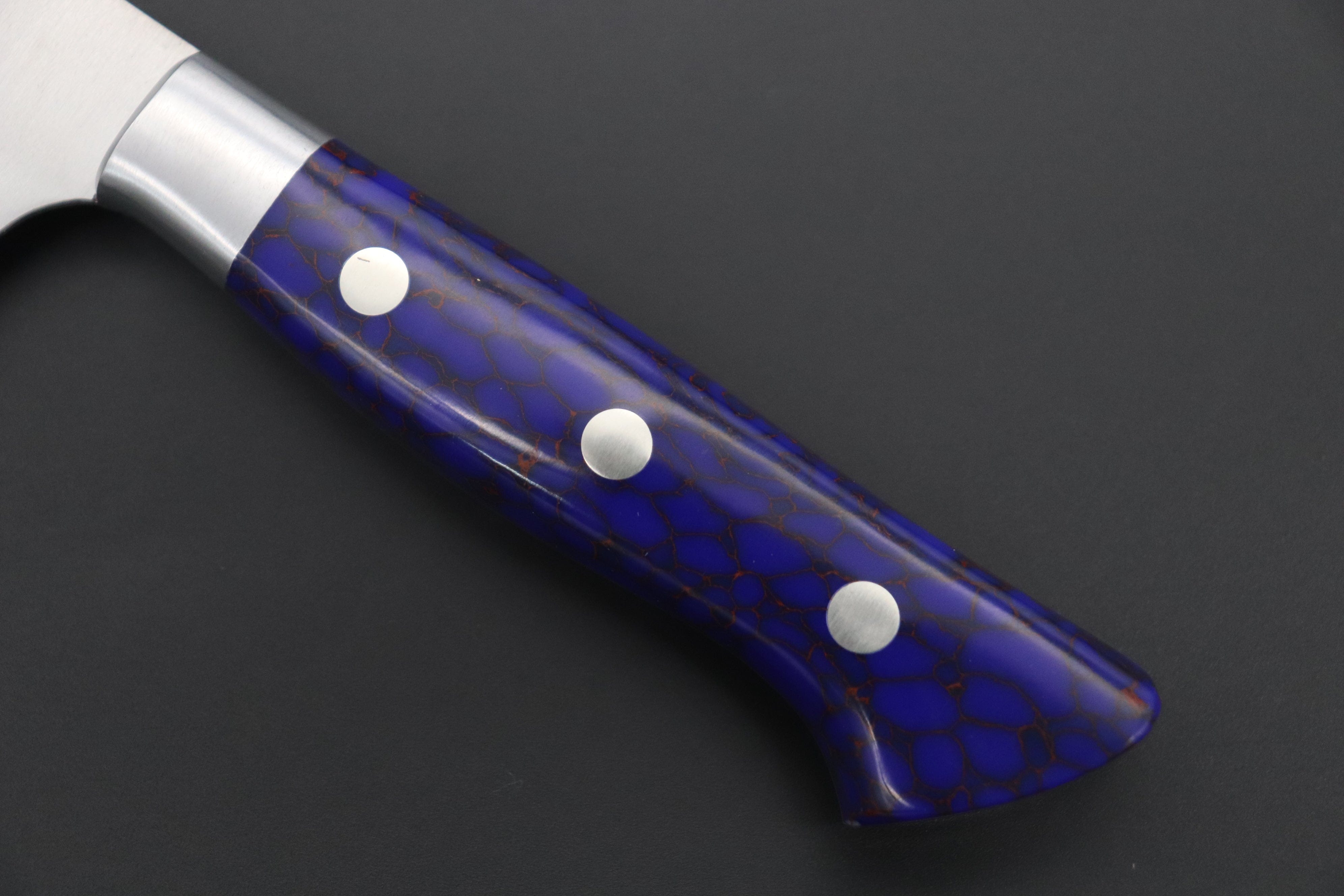 Master Hattori chose to use a very unique and beautiful Deep-Blue Turquoise Gem-Composite-Stone Handle. The Deep-Blue-Turquoise Gem-Composite-Stone Handle has a beautiful appearance and to ensure that it can be gripped comfortably, it has been carefully contoured and polished by hand. The full tang is taper ground to reduce weight and perfect balance.
