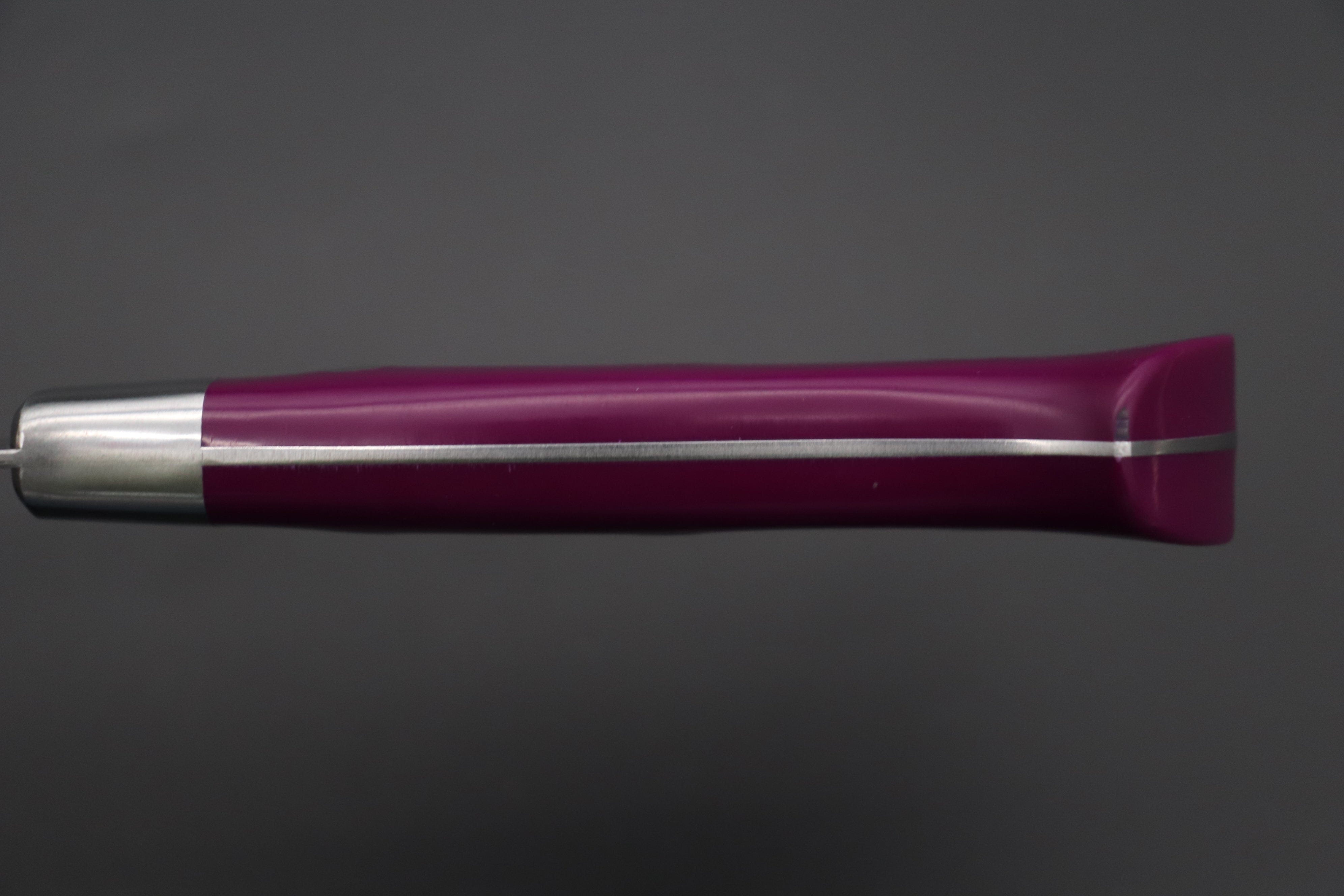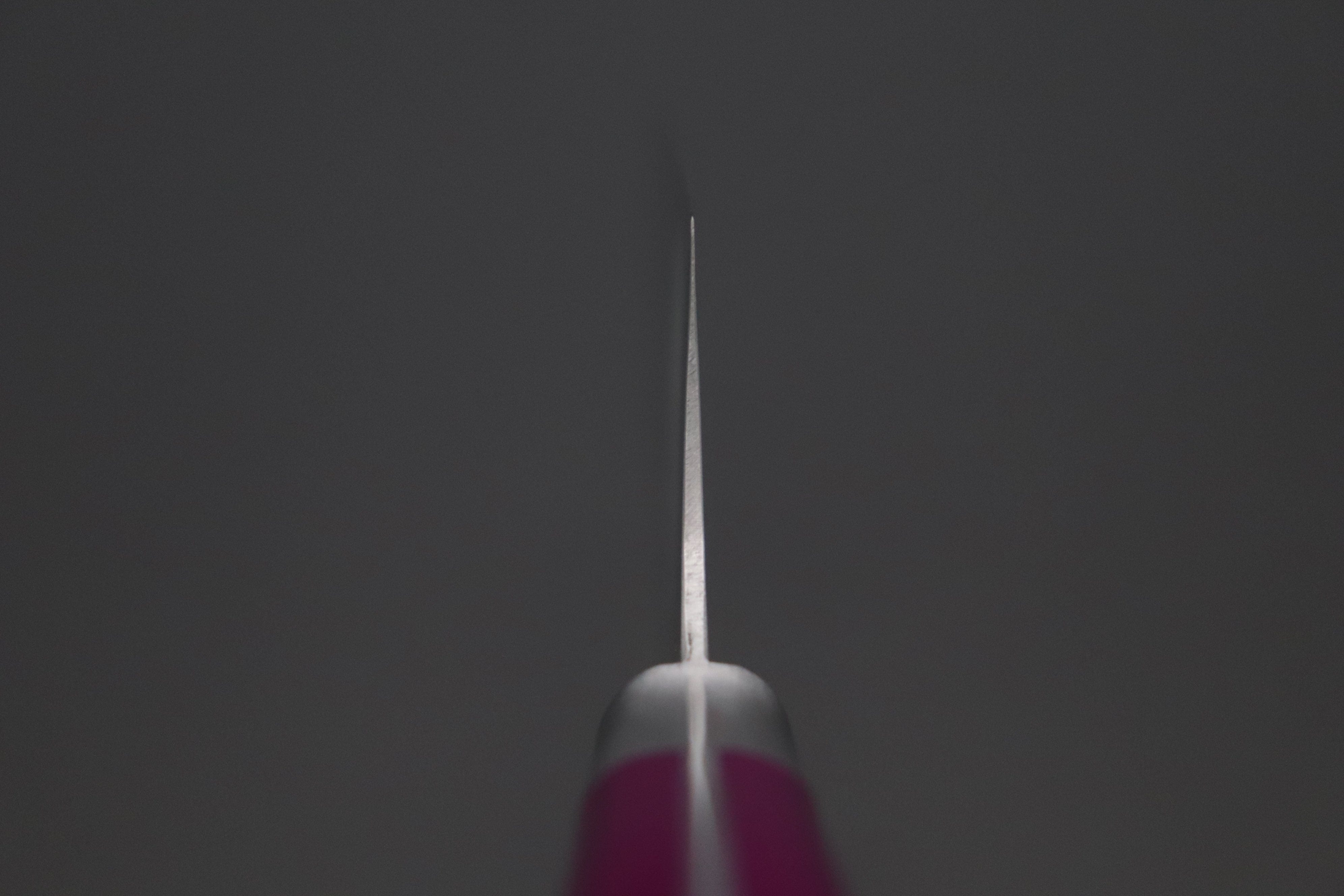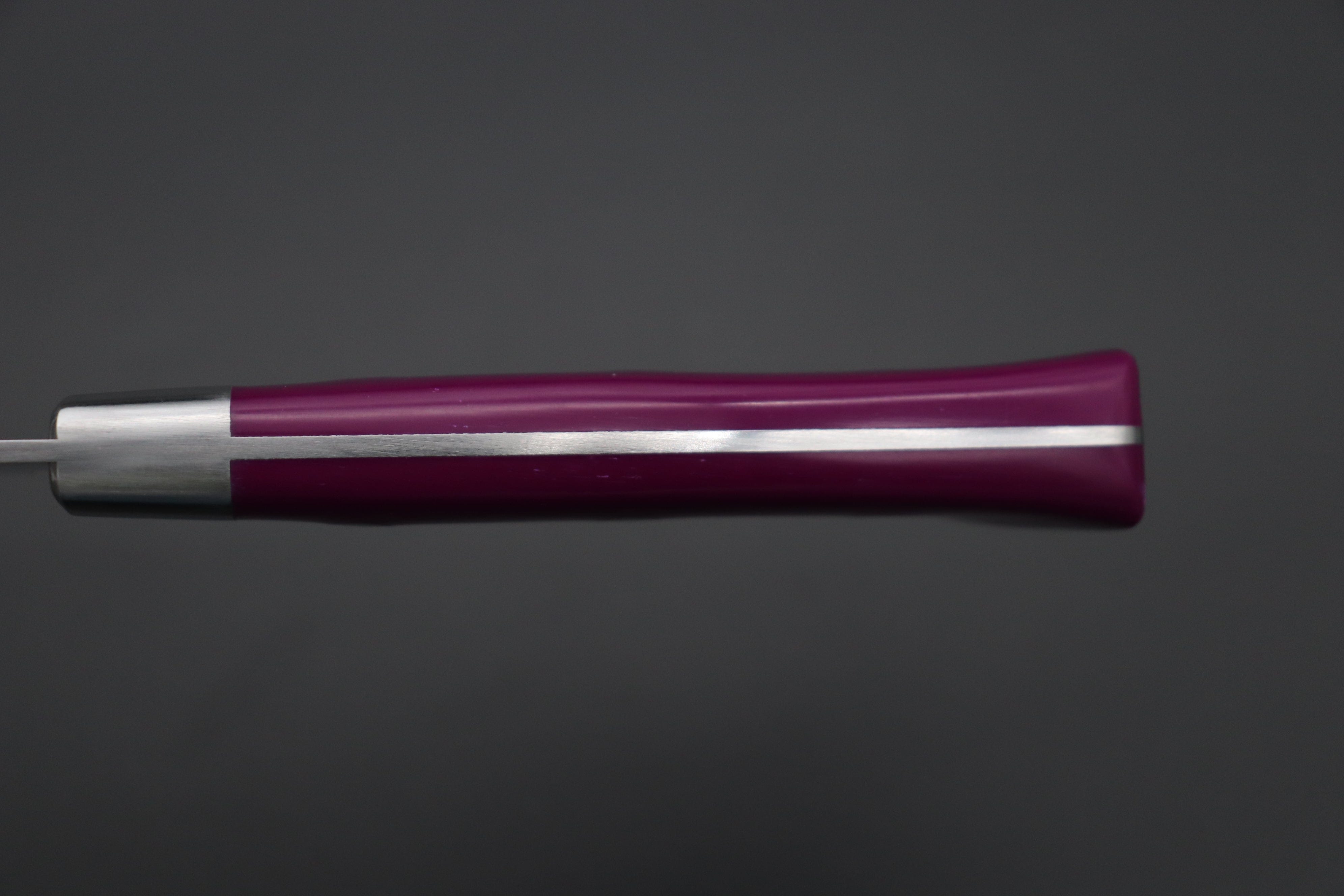 Master Hattori chose to use a very unique and beautiful Sugarite Malachite Gem-Composite Stone Handle. The Sugarite Malachite Gem-Composite stone Handle has a beautiful appearance, Vivid Purple Color and to ensure that it can be gripped comfortably, it has been carefully contoured and polished by hand. The full tang is taper ground to reduce weight and perfect balance.