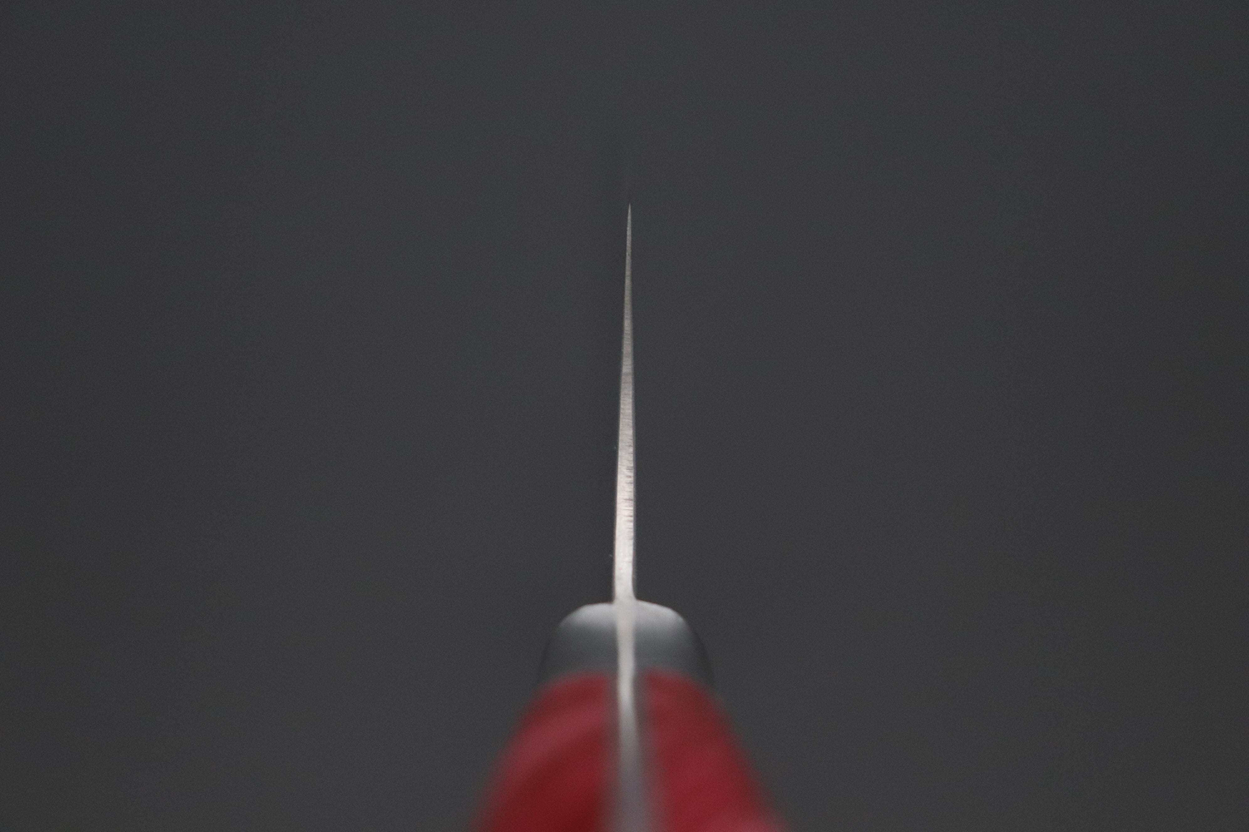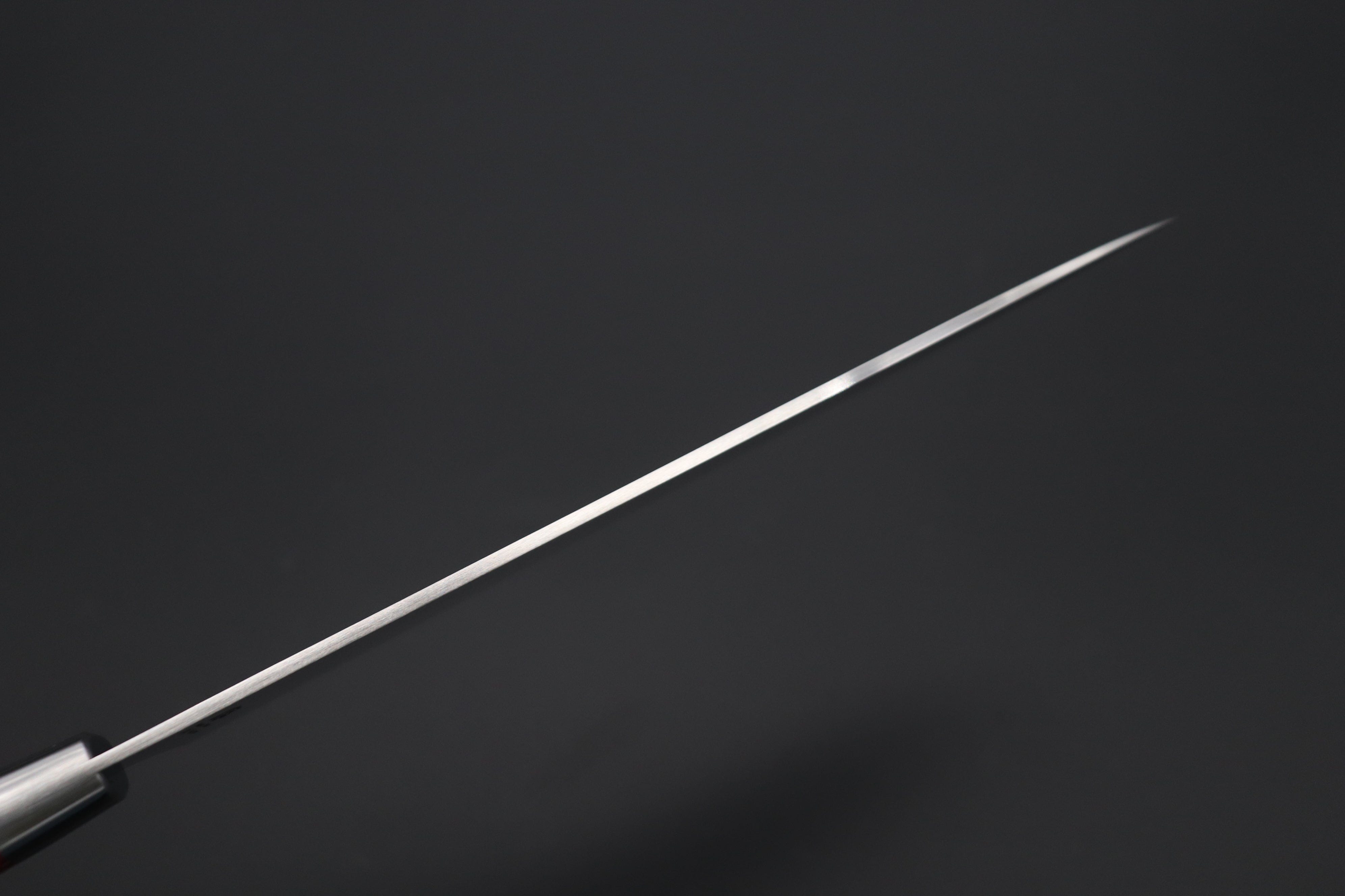 Master Hattori chose to use a very unique and beautiful Spiny Oyster Gem composite Stone Handle. The Spiny Oyster Gem composite stone Handle has a beautiful appearance and to ensure that it can be gripped comfortably, it has been carefully contoured and polished by hand. The full tang is taper ground to reduce weight and perfect balance.