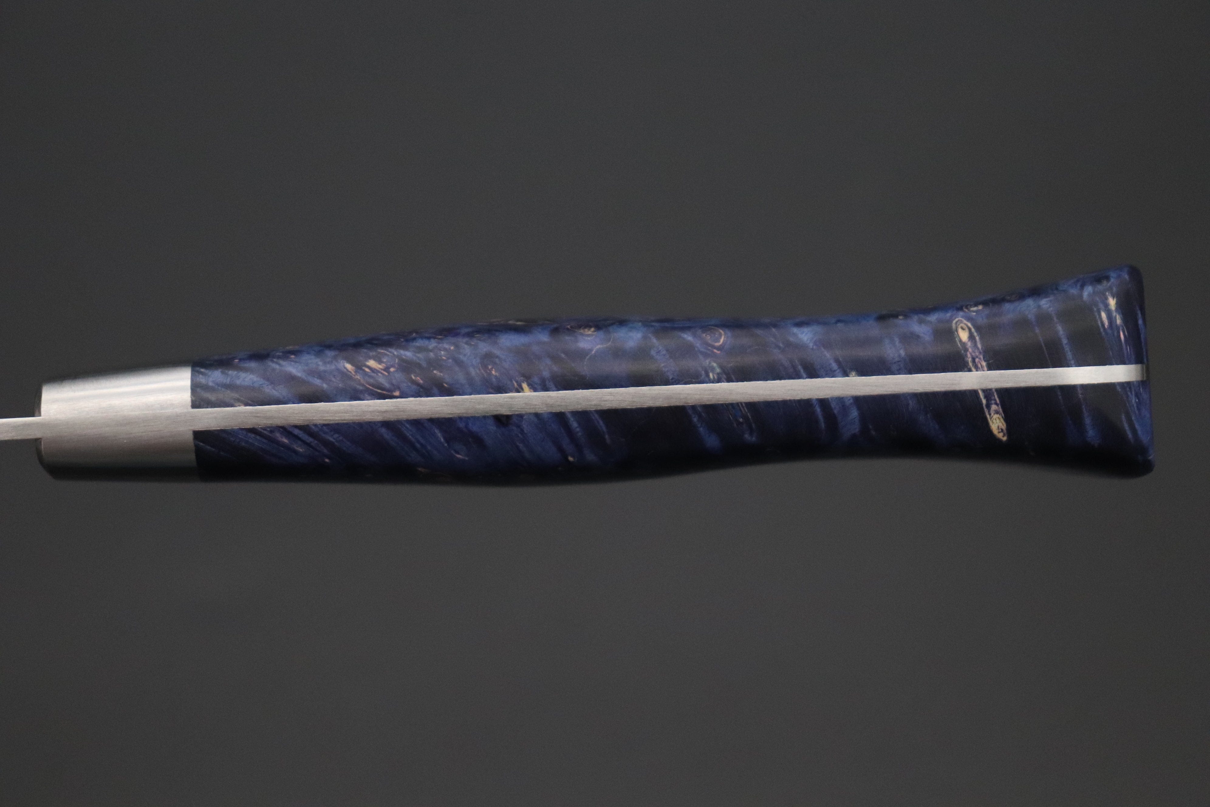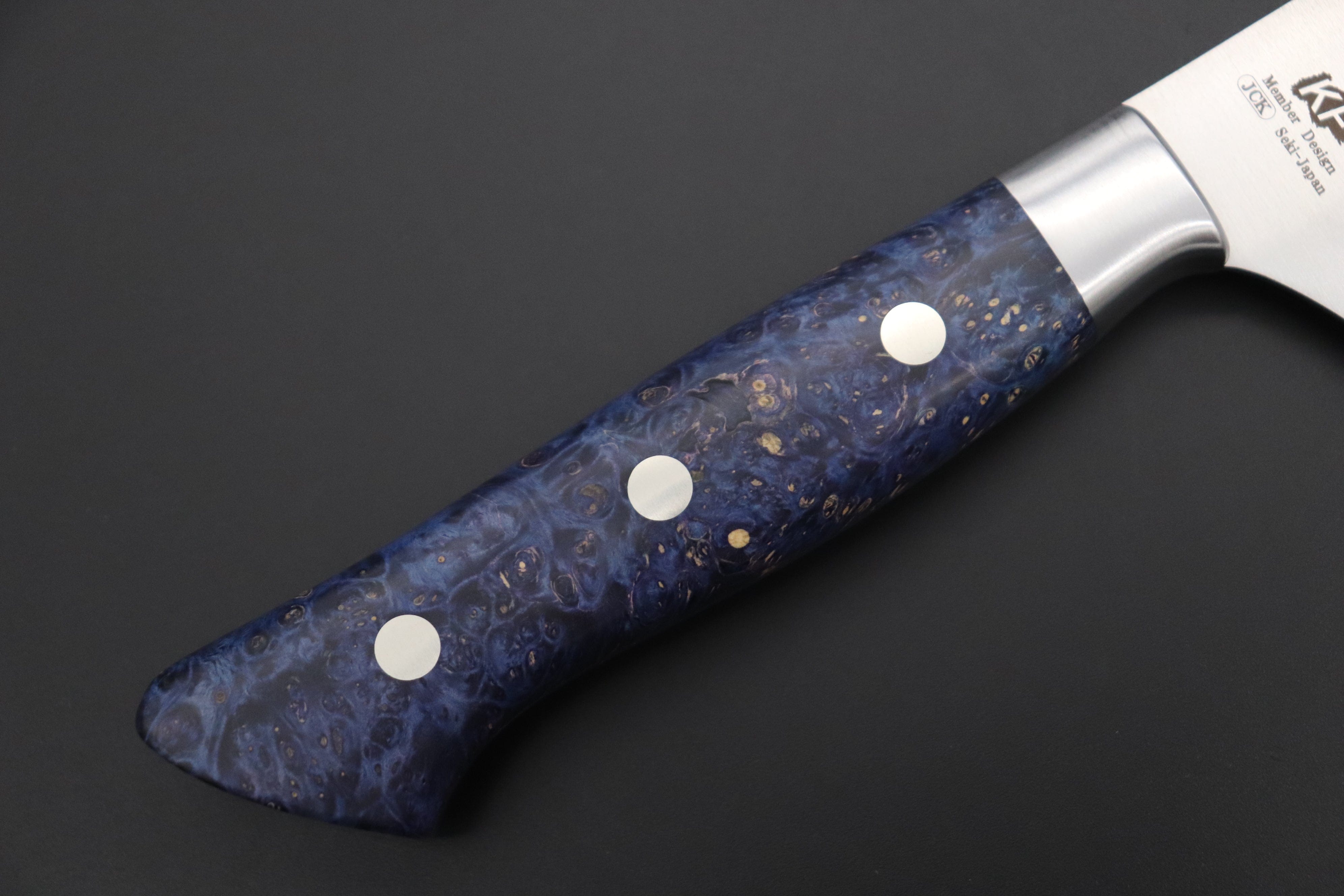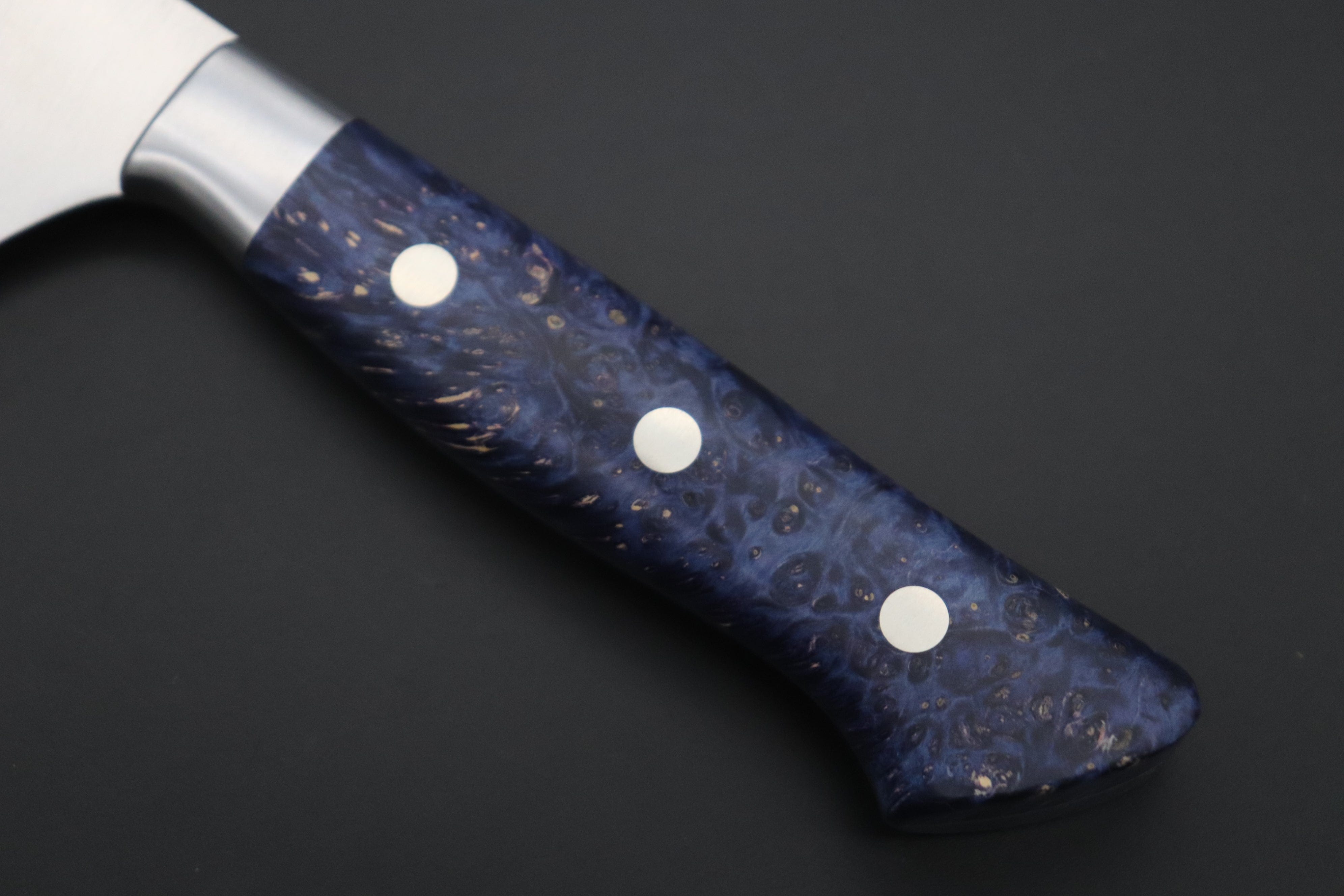 Master Hattori has used a unique, beautifully figured piece of Blue Color Stabilized Box Elder Wood for the handle of each Gyuto 240mm Knife. The wooden handle and Stainless Steel bolster have been carefully hand-contoured to provide a perfect grip and superb blade balance. Perfectly polished Stabilized Box Elder Wood makes beautiful accent and coloring, is also highly water-resistant and will not split or crack as a result of rapidly changing humidity levels.
