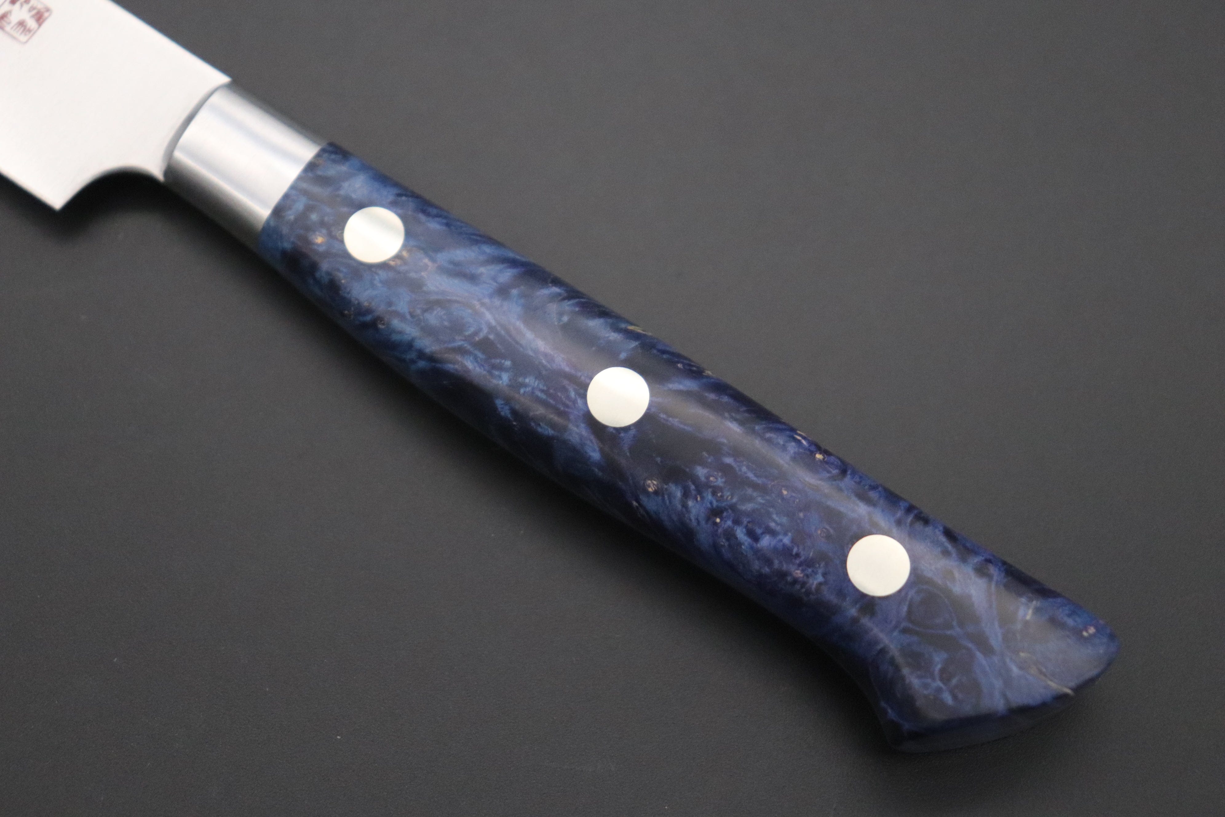 Master Hattori has used a unique, beautifully figured piece of Blue Color Stabilized Box Elder Wood for the handle of each Petty 120mm Knife. The wooden handle and Stainless Steel bolster have been carefully hand-contoured to provide a perfect grip and superb blade balance. Perfectly polished Stabilized Box Elder Wood makes beautiful accent and coloring, is also highly water-resistant and will not split or crack as a result of rapidly changing humidity levels.
