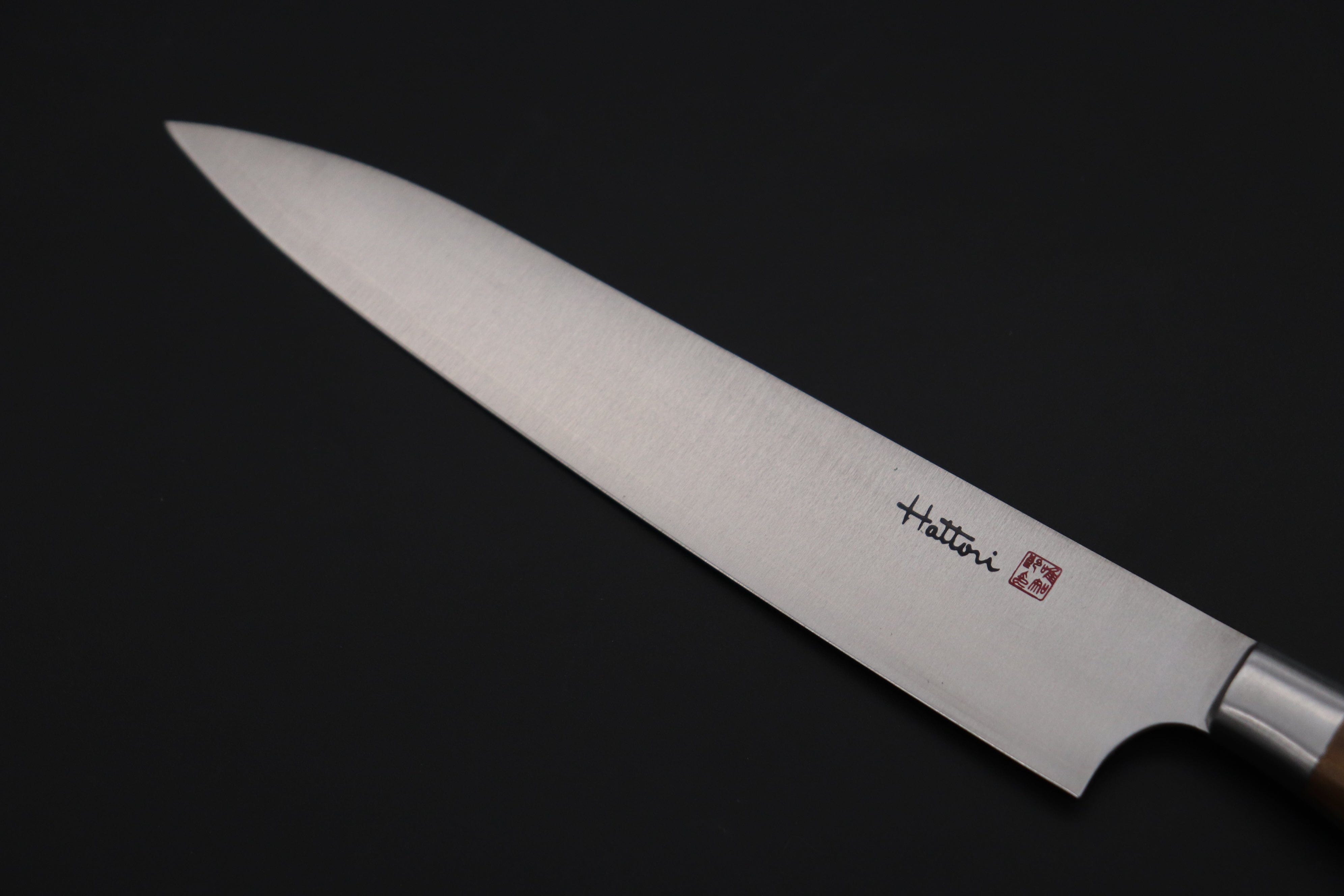 Hattori wanted to proudly show the advantages of the “SAN-MAI” (“3-layer”) blade construction technique and Japan’s most reputable stainless steel, VG-10. The wide exposure of the VG-10 core near the edge gives the blade a distinctive, solid appearance — conveying both strength and refined elegance. We believe our customers will enjoy the exceptional cutting precision and smooth, sturdy feel of these knives, which is quite similar to a mono-steel knife due to the careful selection of tough 420J2 stainless steel cladding.
