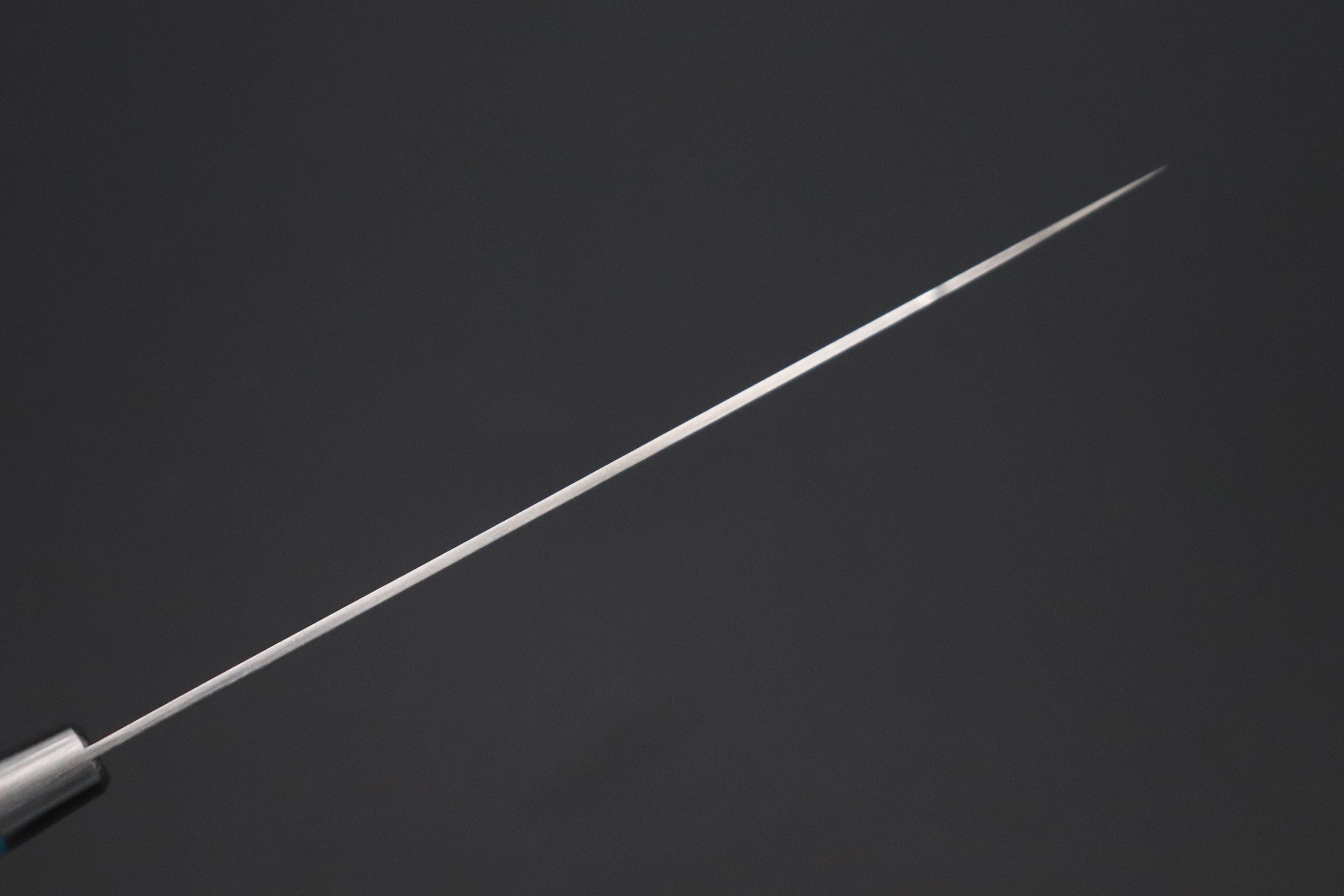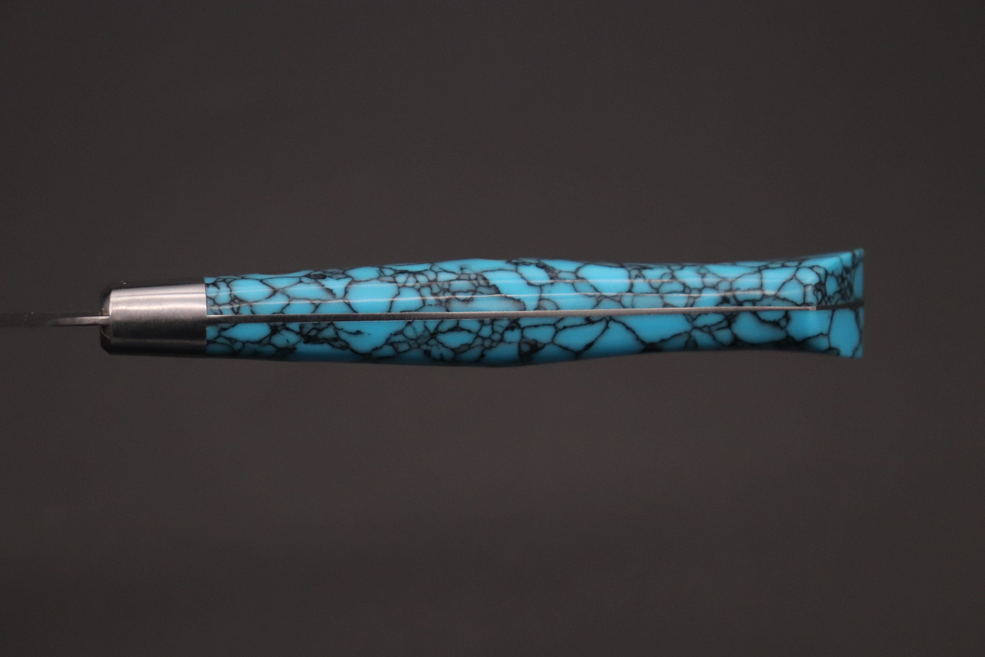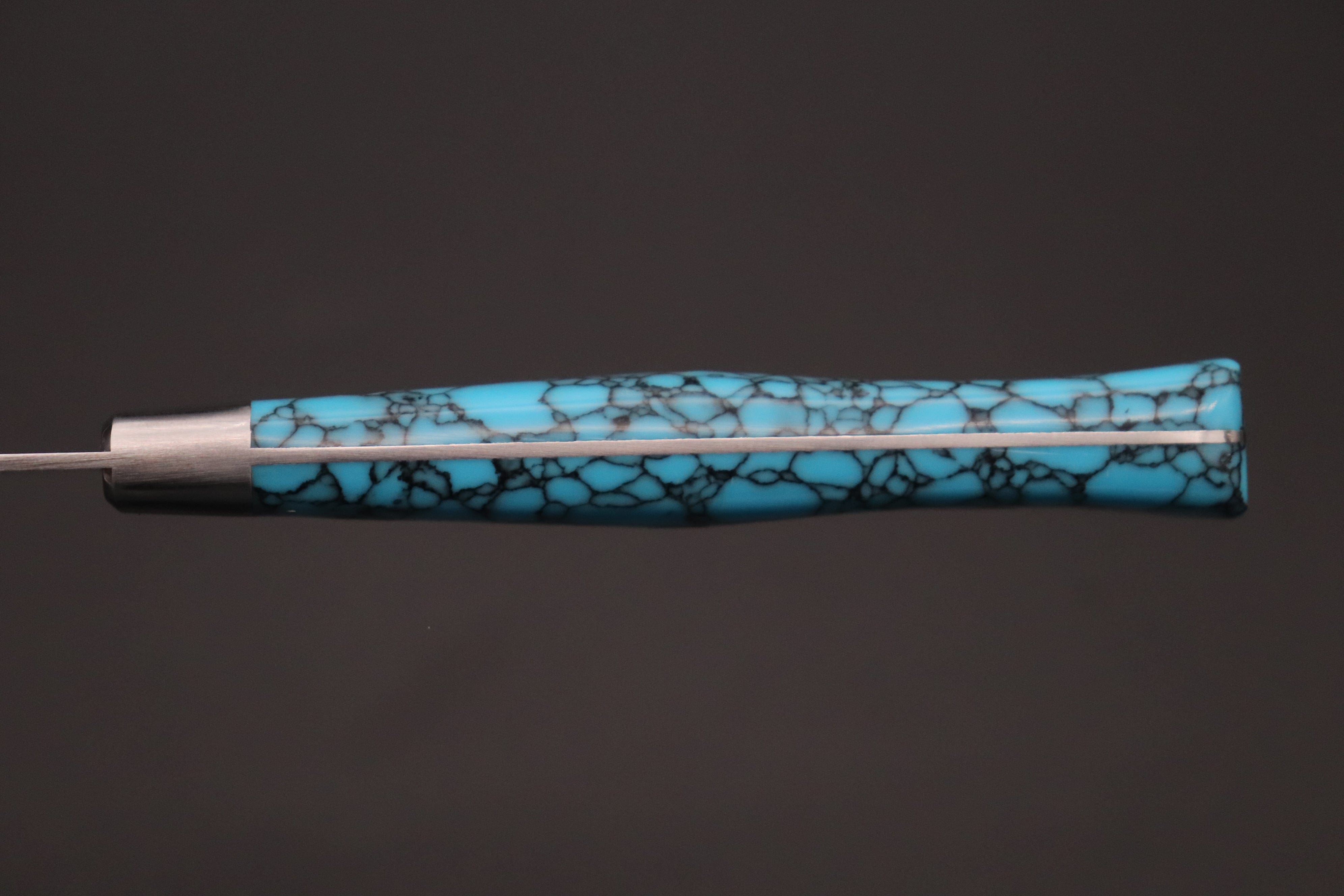 Master Hattori chose to use a very unique and beautiful Turquoise Gem-Composite-stone Handle. The Turquoise Gem-Composite-stone Handle has a beautiful appearance and to ensure that it can be gripped comfortably, it has been carefully contoured and polished by hand. The full tang is taper ground to reduce weight and perfect balance.